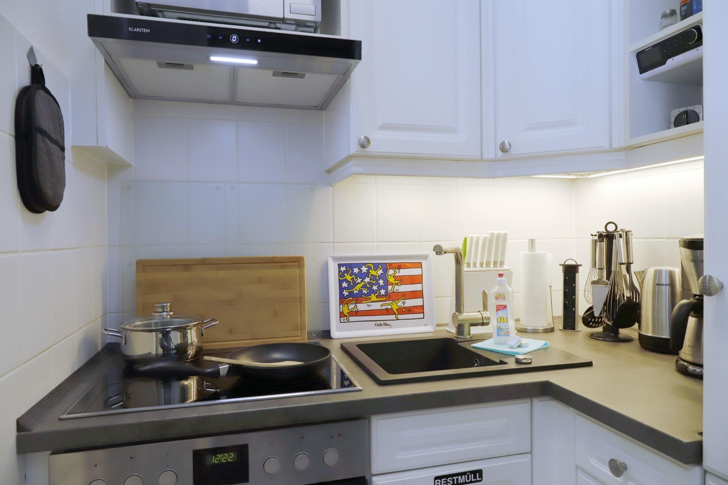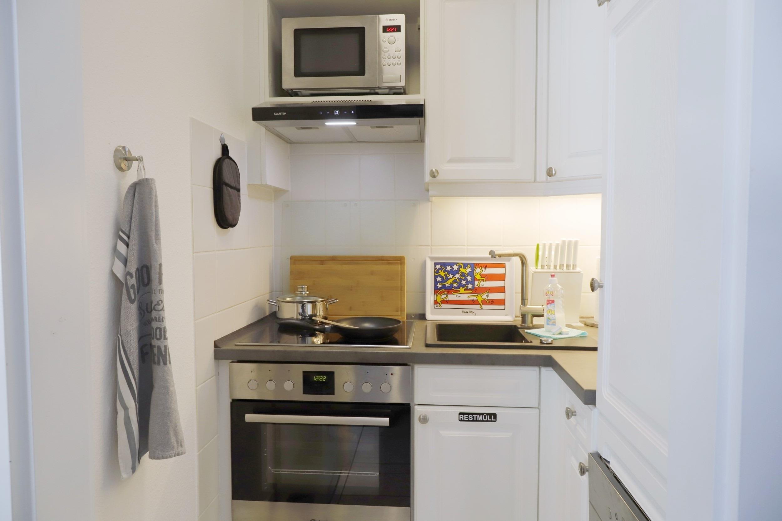 Im Urlaub kochen? Los geht´s, die Küche ist gut ausgestattet, sogar mit einer Spülmaschine und befindet sich gegenüber dem Essbereich. Sie ist in einer Nische und offen gehalten, ausgestattet mit einem Cerankochfeld, Backofen, Mikrowelle, Kaffeemaschine, einem Kühlschrank mit Gefrierfach, Wasserkocher, Toaster und einem Radio.