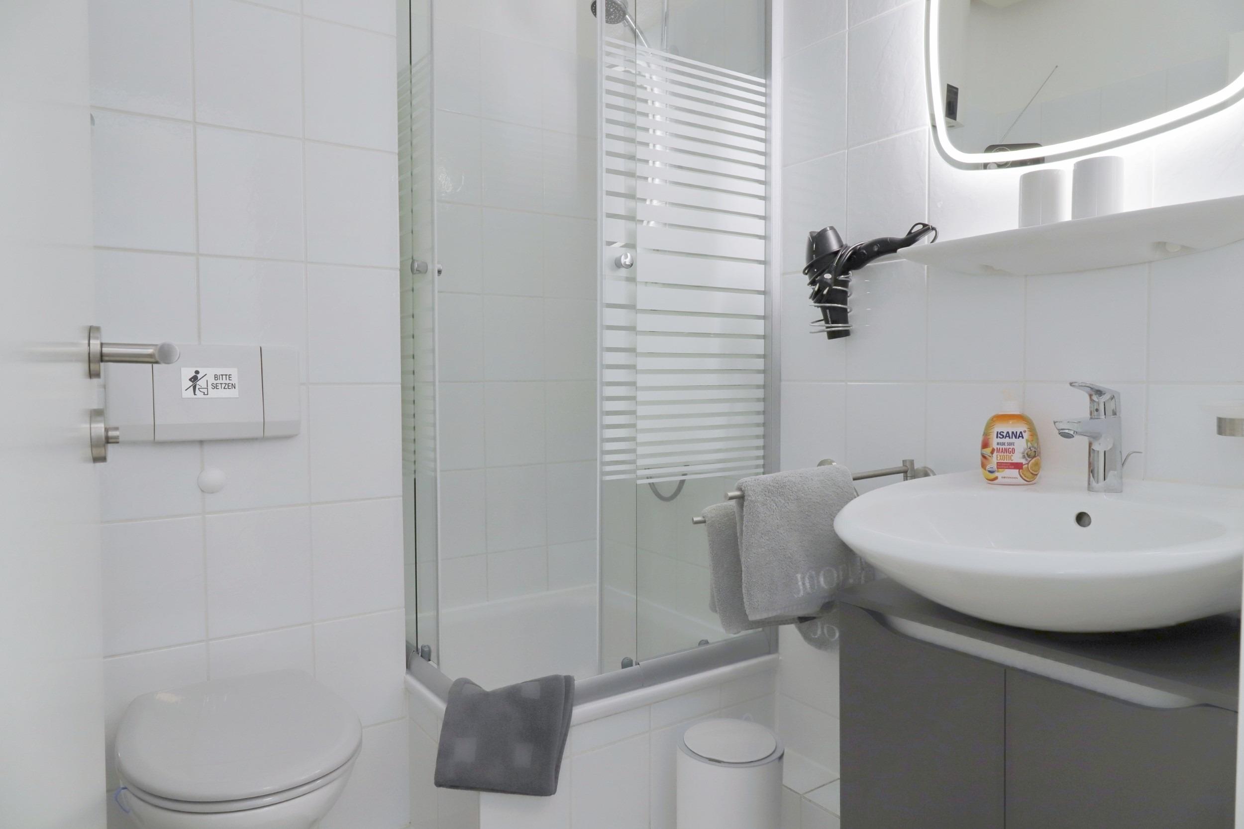 Von dort aus gelangt man in das Duschbad mit WC, Waschbecken, Spiegel und Haartrockner.