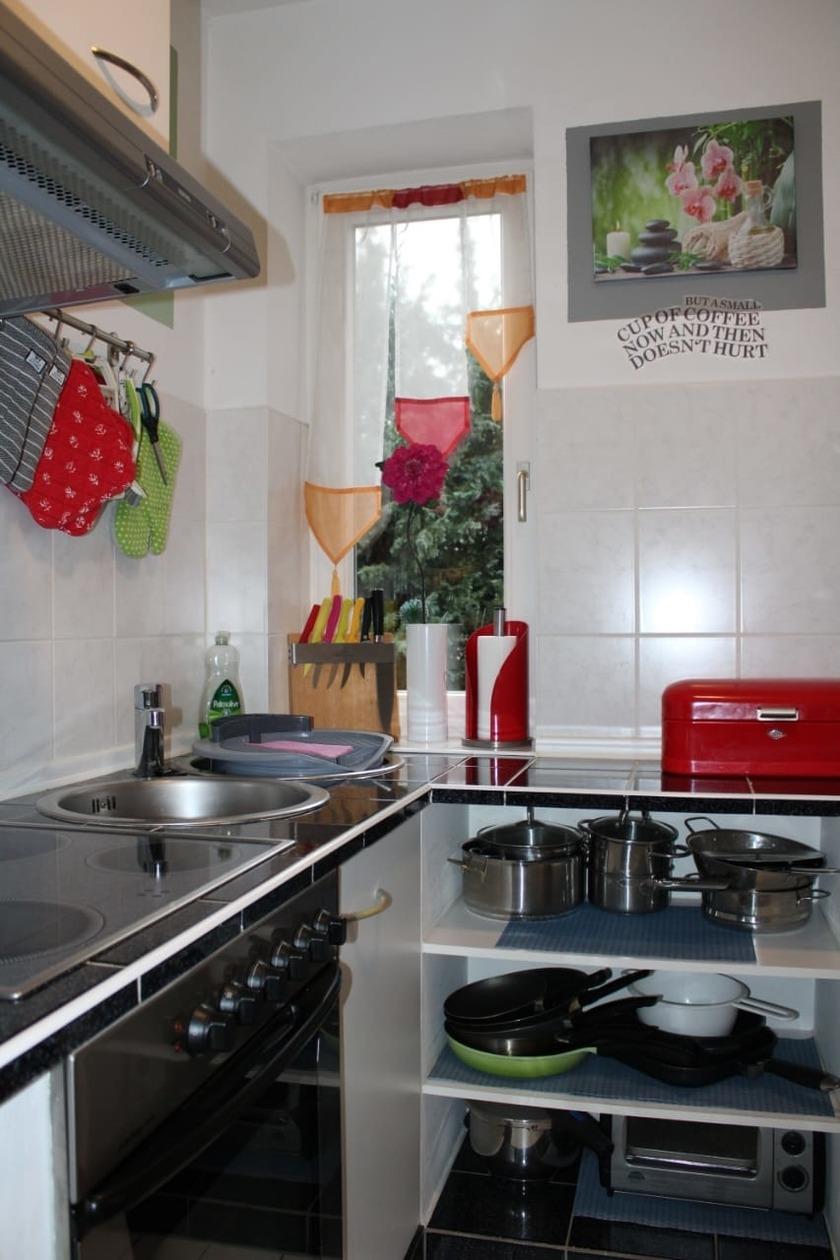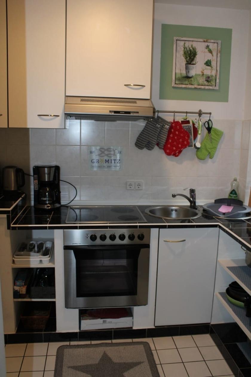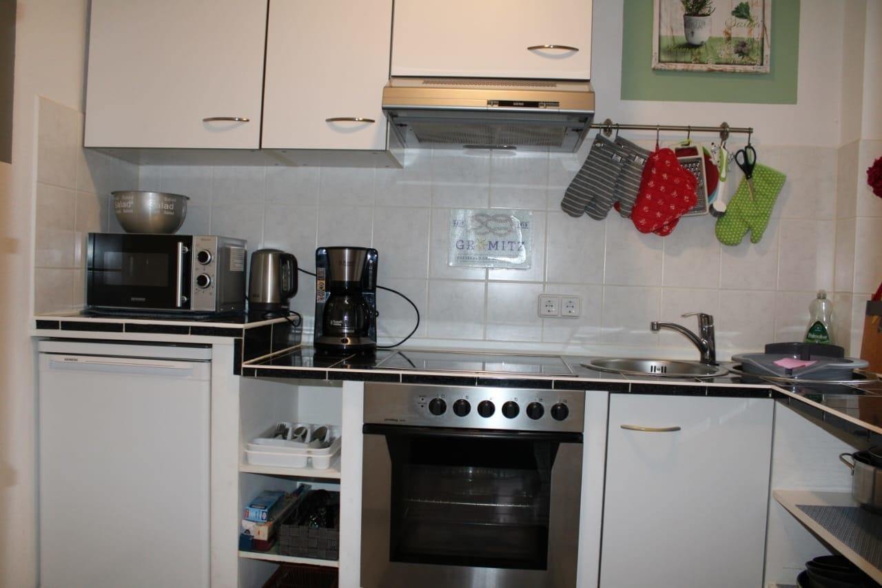 Im Urlaub kochen? Los geht´s, die Küche ist gut und liebevoll ausgestattet und befindet sich gegenüber dem Essbereich. Sie ist in einer Nische und offen gehalten, ausgestattet mit einem Cerankochfeld, Backofen, Mikrowelle, Kaffeemaschine, einem Kühlschrank mit Gefrierfach, Wasserkocher und Toaster.