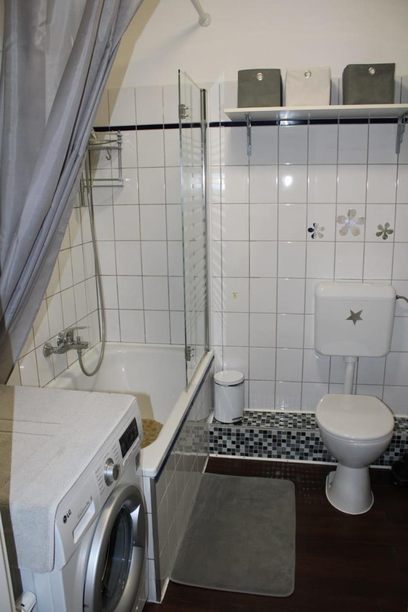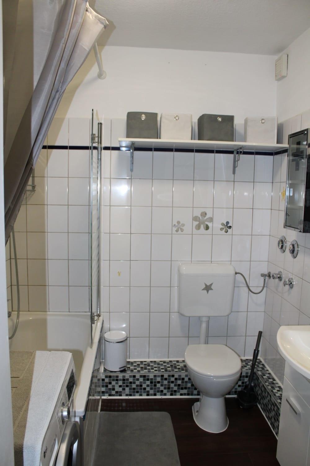 Von dort aus gelangt man in das Duschbad mit WC, Badewanne, Waschbecken, Waschmaschine, Spiegel und Haartrockner.