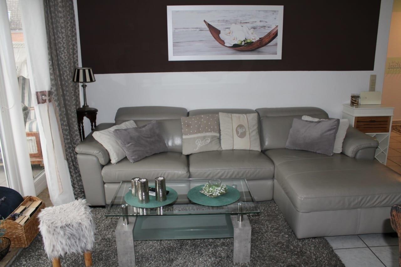 Im Wohnbereich befindet sich ein großer Esstisch mit 6 Stühlen und eine einladende Ledercouch für gemütliche Abende. Ein Sessel mit Liegefunktion läd zum Relaxen ein.