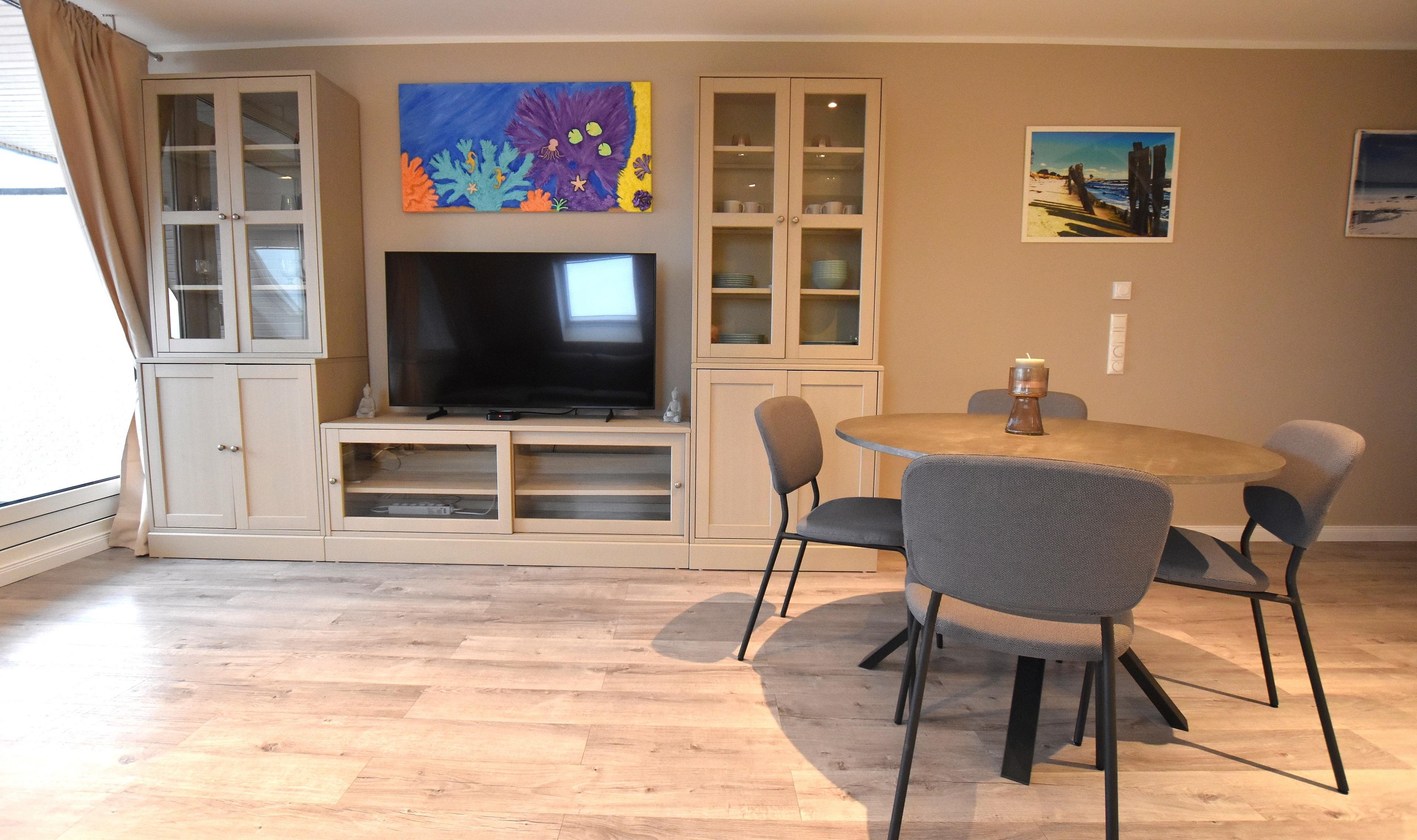 • Wohn- und Essbereich: Gemütliche Sofaecke mit großem TV-Schrank, ein Esstisch sowie eine offene Küche mit moderner Ausstattung: