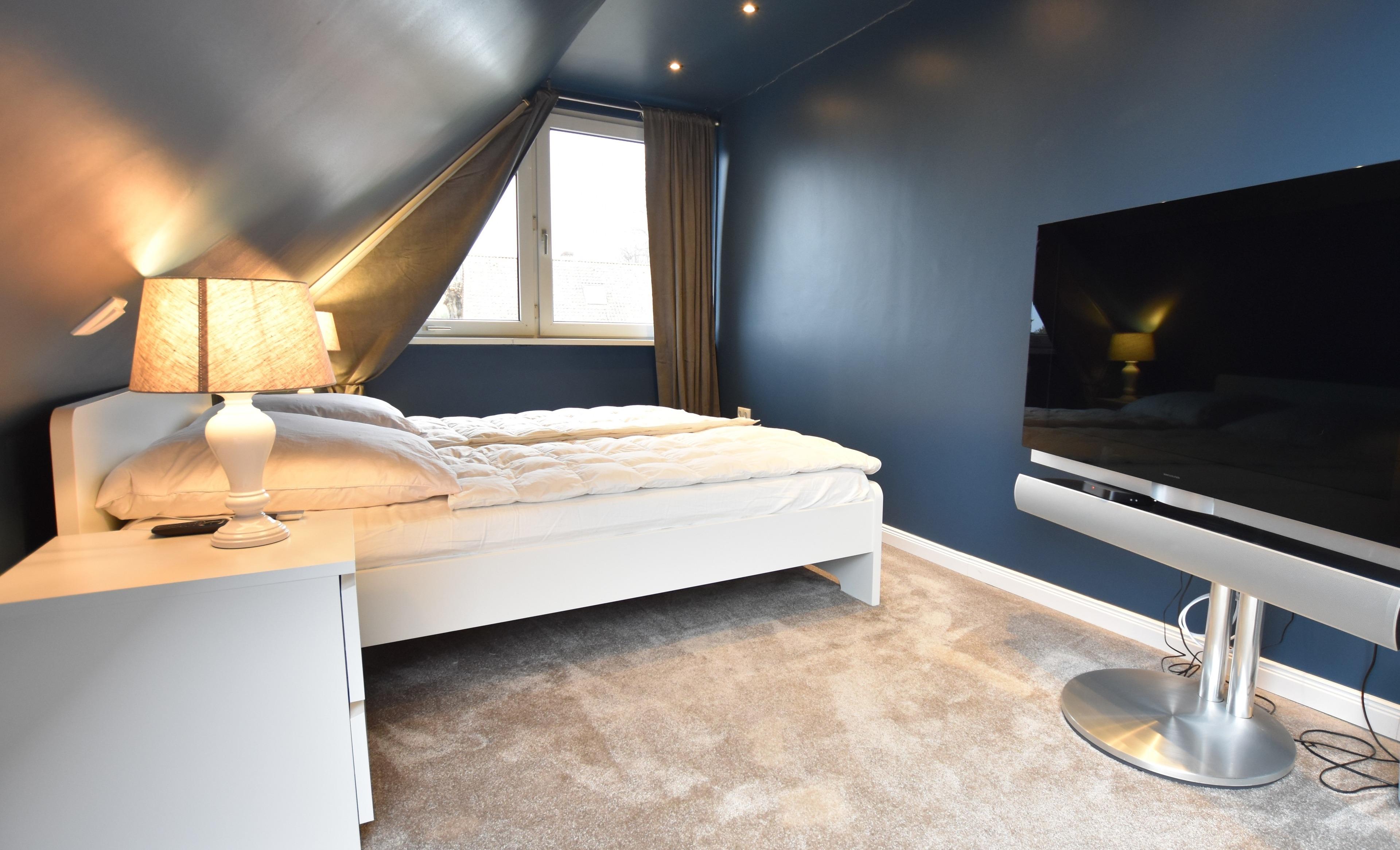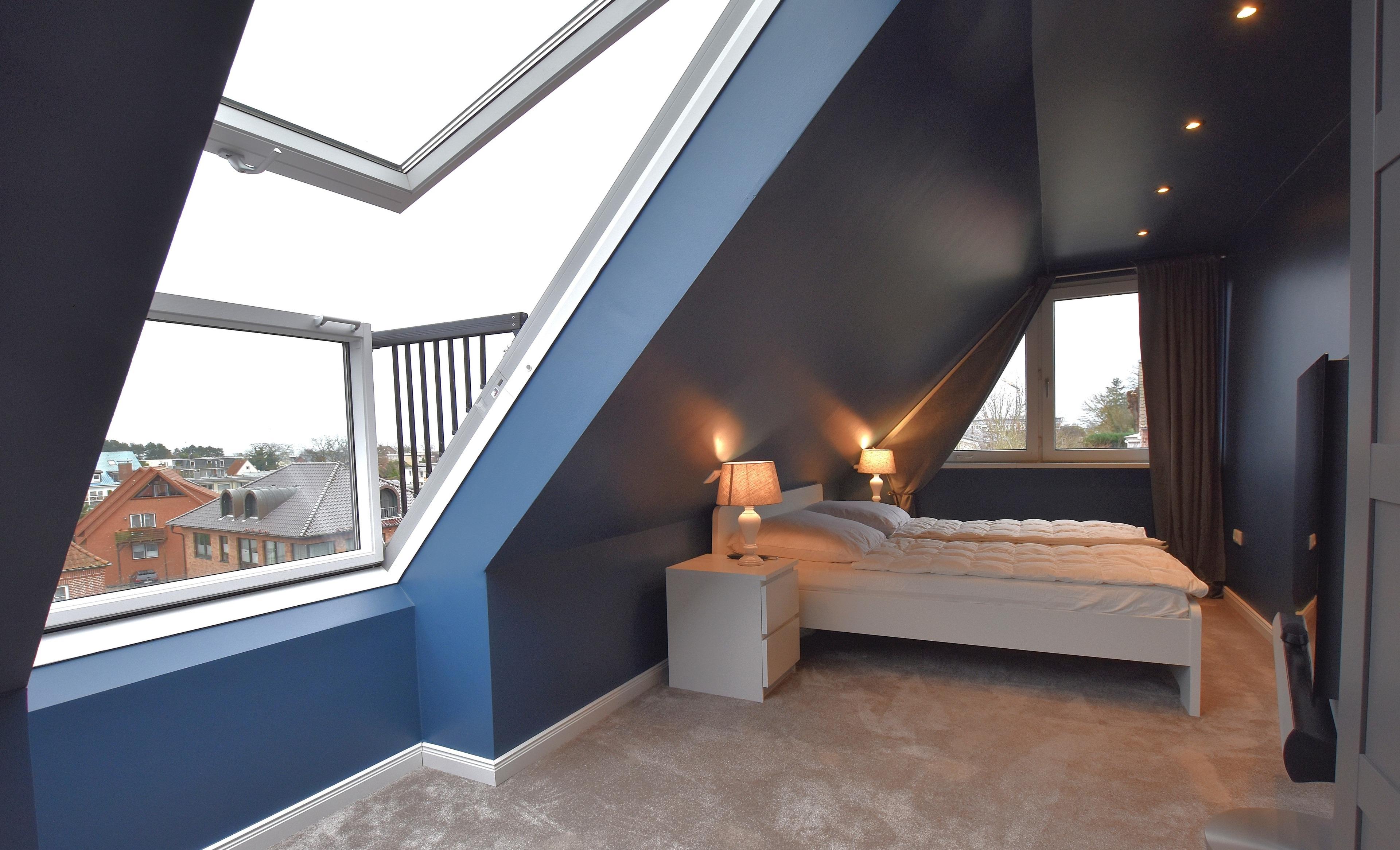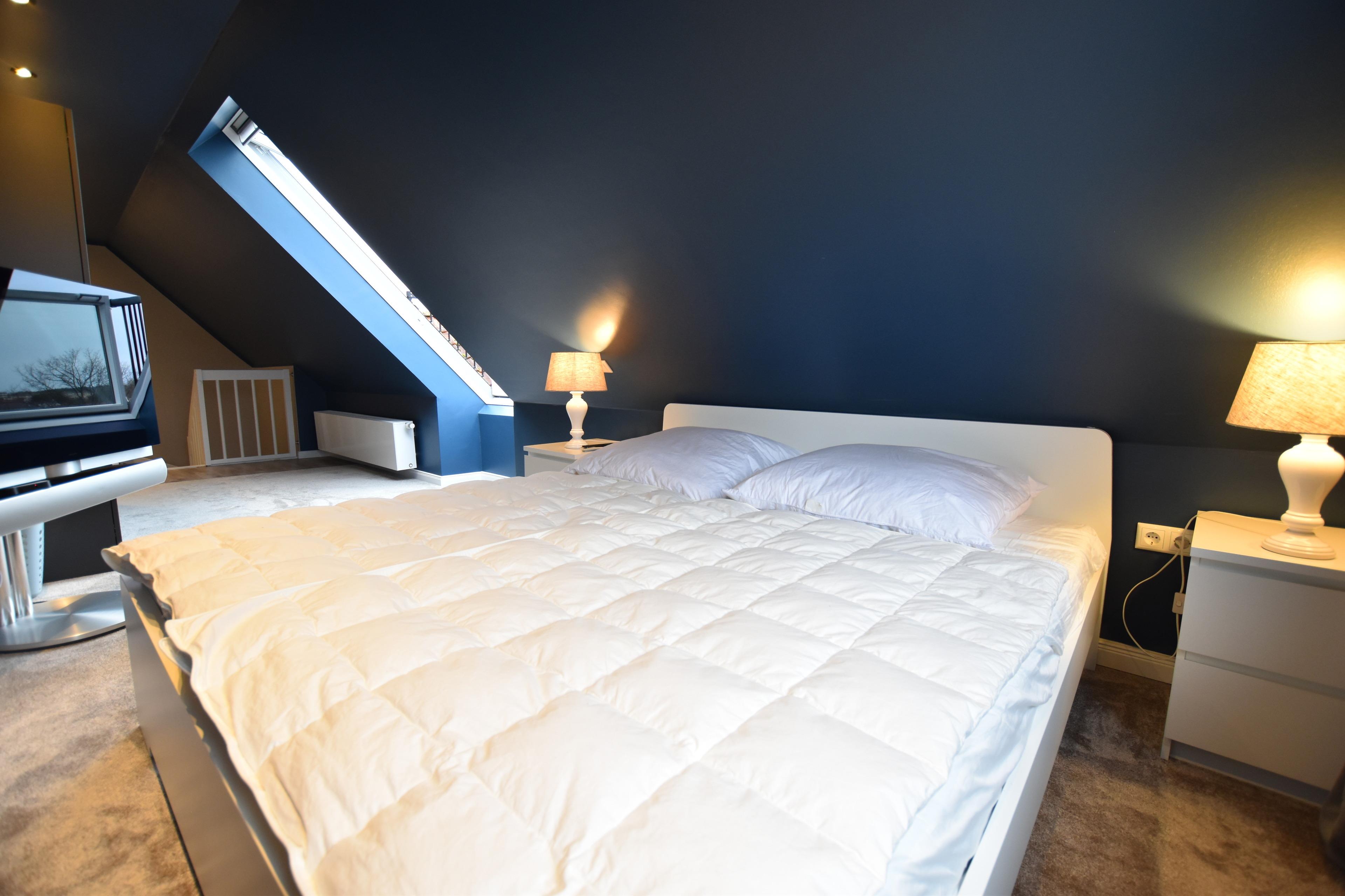 • Schlafbereich: Doppelbett (1x180x200 cm), Kleiderschrank, Dachfenster mit Gardinen, TV.