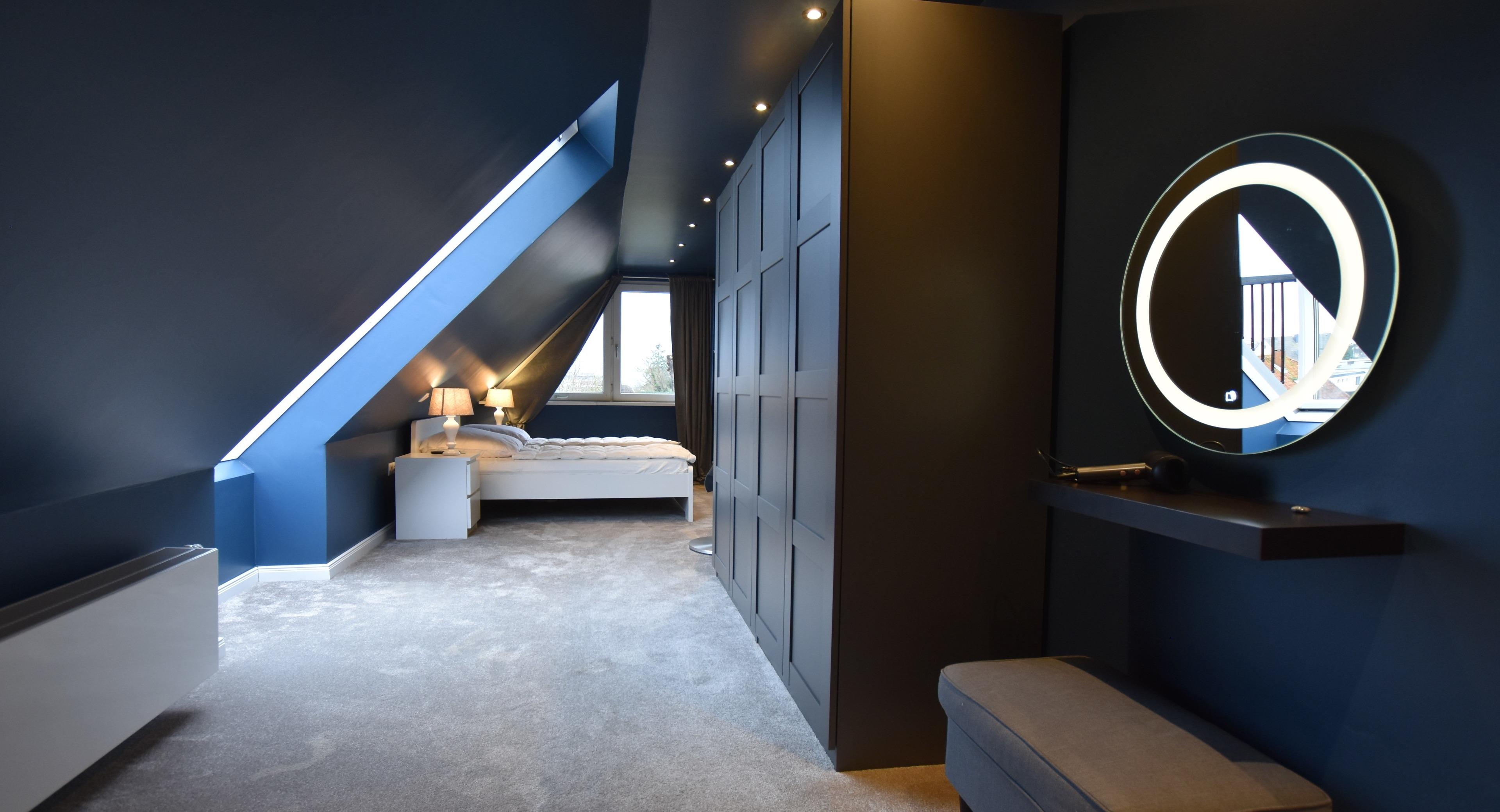 Über eine Treppe gelangen Sie in das großzügige, offene Schlafzimmer, das mit einem Teppichboden für Behaglichkeit sorgt.