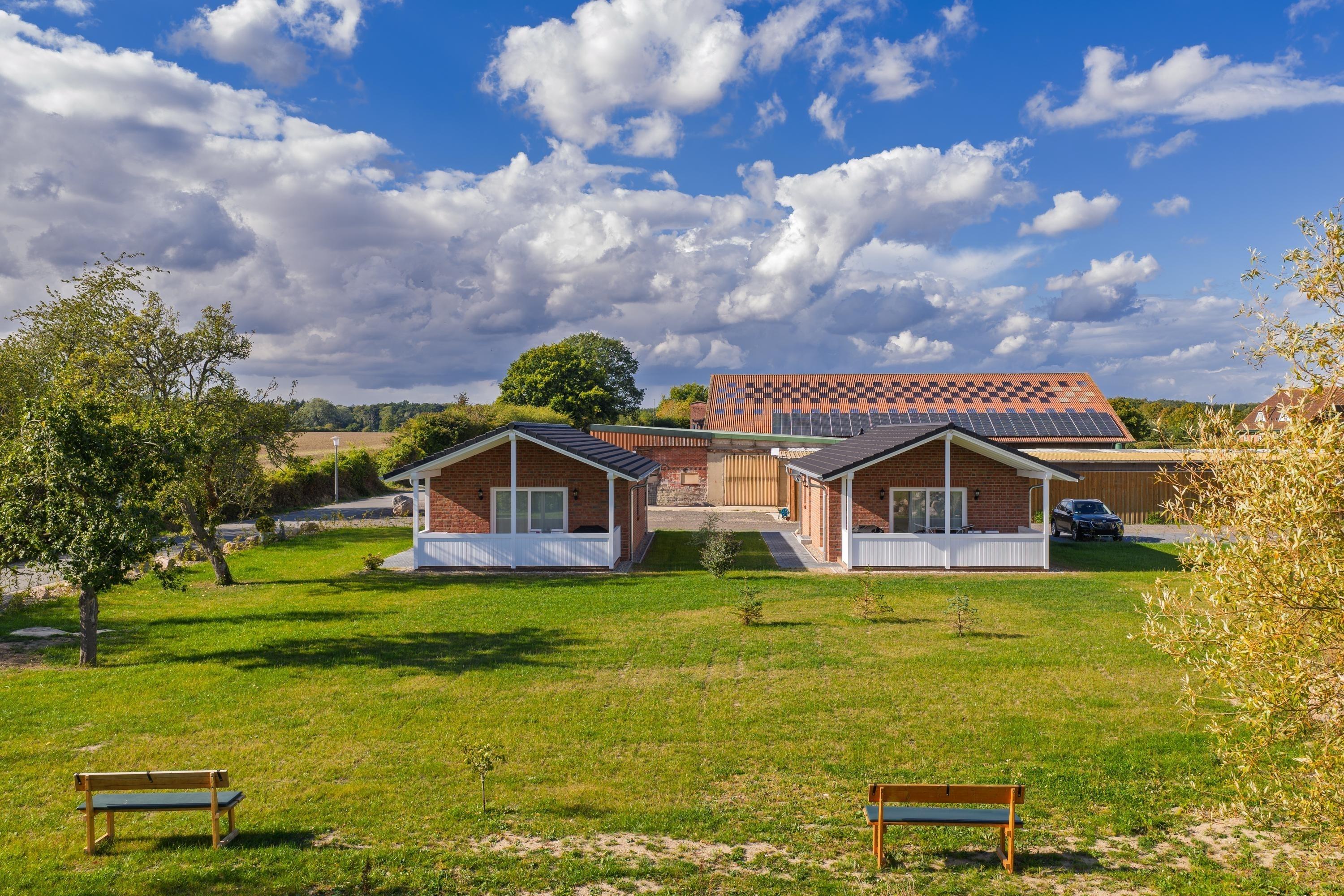 Nahe Grömitz befindet sich der idyllisch gelegene Hof Hagen weit ab von Trubel und Straßenlärm. Hier befinden sich die in 2025 neu errichteten Ferienhäuser. Sie bieten 51 m² ebenerdige Wohnfläche und verfügen über 2 Schlafzimmer, einen Wohn- und Essbereich mit Küche und ein Badezimmer mit Dusche. Die Ferienhäuser stehen einzeln und haben eine überdachte Terrasse.