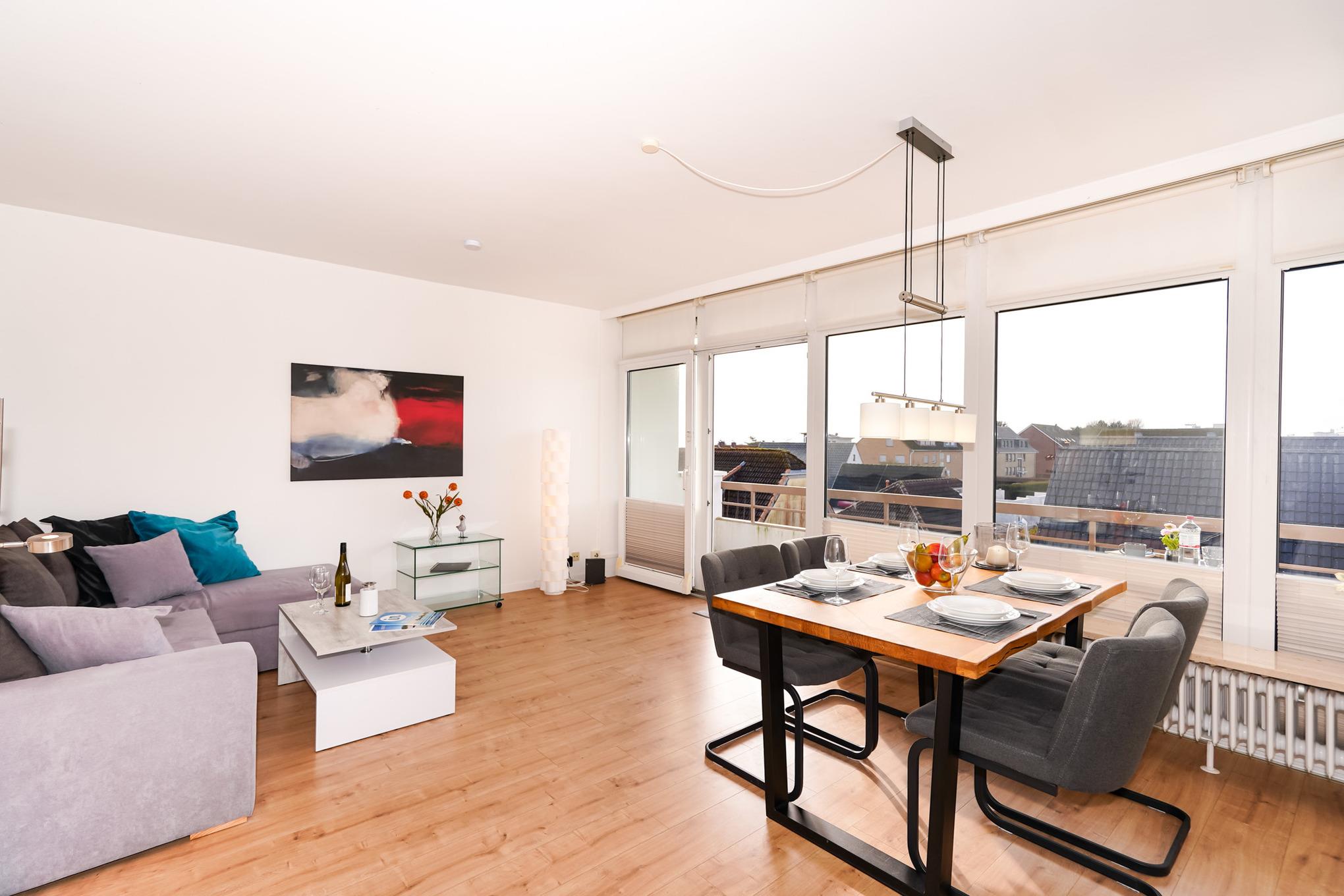 Das geräumige Wohn-/ Esszimmer ist mit einem gemütlichen Ecksofa (Schlafsofa 150x200) mit Couchtisch sowie einem Essplatz für 4 Personen ausgestattet. Für Ihre mediale Unterhaltung stehen ein großer Flat-TV, ein DVD-Player sowie eine Stereoanlage bereit. W-LAN ist hier kostenfrei verfügbar. Der von hier erreichbare Balkon erstreckt sich über die gesamte Breite der Wohnung und lädt zu entspannten Abendstunden ein.
