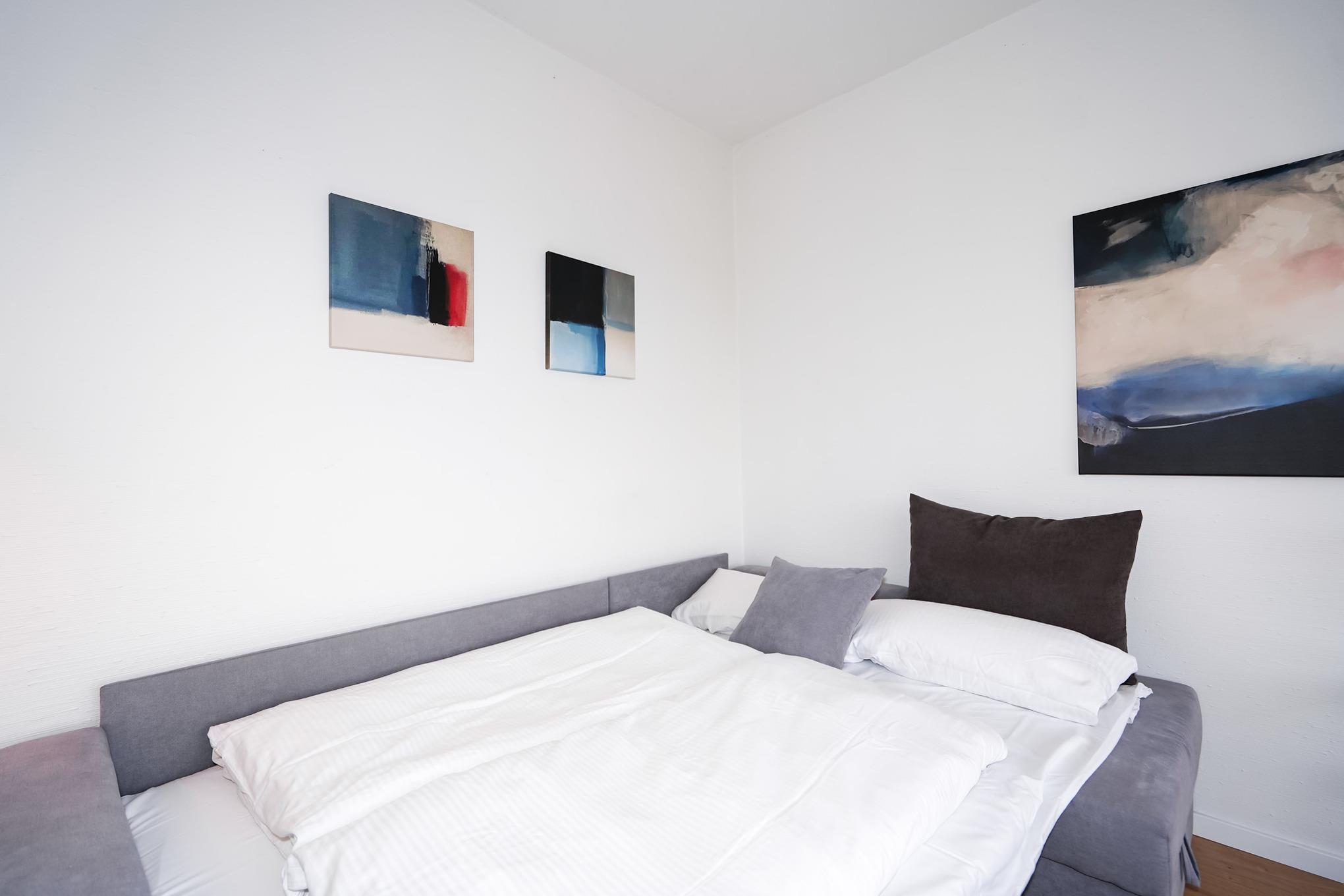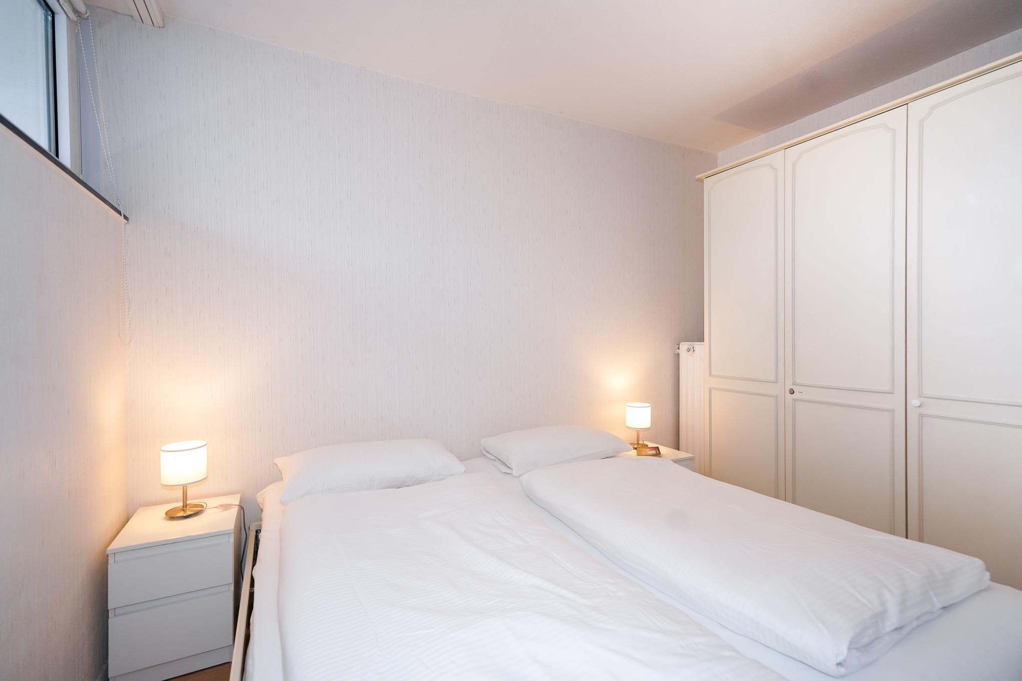 Das helle Schlafzimmer ist mit einem großen Kleiderschrank sowie einem Doppelbett (2x 90x200cm) mit hochwertigen Matratzen ausgestattet. Die Fenster lassen sich mit Vorhängen abdunkeln.