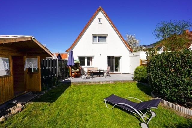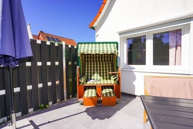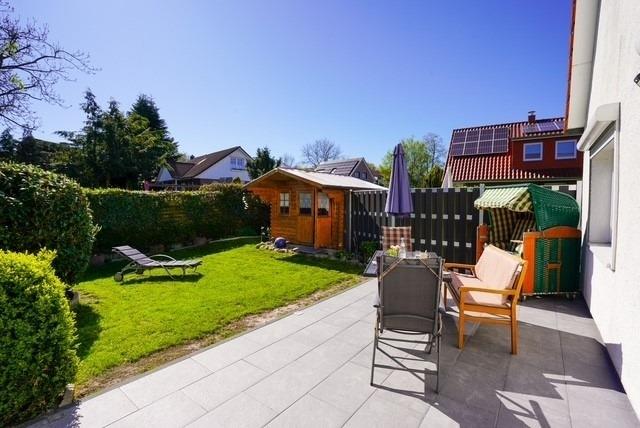 Ein weiteres Highlight des Hauses ist der wunderschöne Garten mit einer eigenen Terrasse und einem süßen Gartenhaus – der perfekte Ort, um die Sonnenstrahlen zu genießen oder am Abend zu grillen. Relaxen Sie in unserem gemütlichen Strandkorb. Durch das kleine Gartentor gelangen Sie zum Parkplatz und zur Fahrradgarage. Sie können Ihre E-Bikes hier auch aufladen.