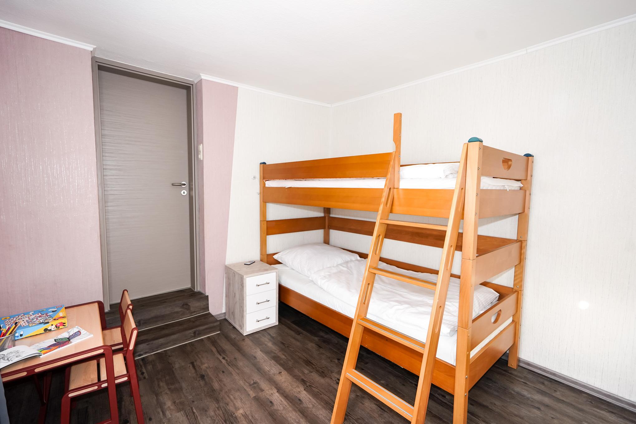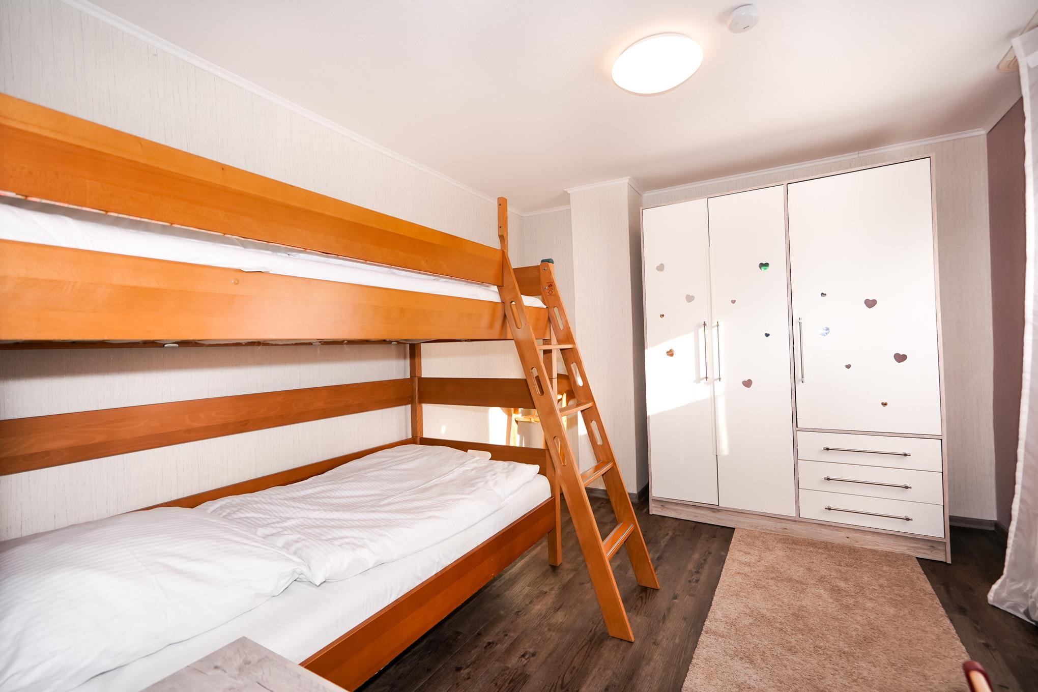 Das große Schlafzimmer stellt ein Doppelbett (2x90x200) zur Verfügung. Das Kinderschlafzimmer verfügt über ein Etagenbett und einen Kleiderschrank. Zwei Stufen führen in das Kinderzimmer. Die Ausstattung im Bad lässt keine Wünsche übrig: das Tageslichtbad bietet Ihnen eine Walk-in-Dusche, einen Waschtisch und ein WC.