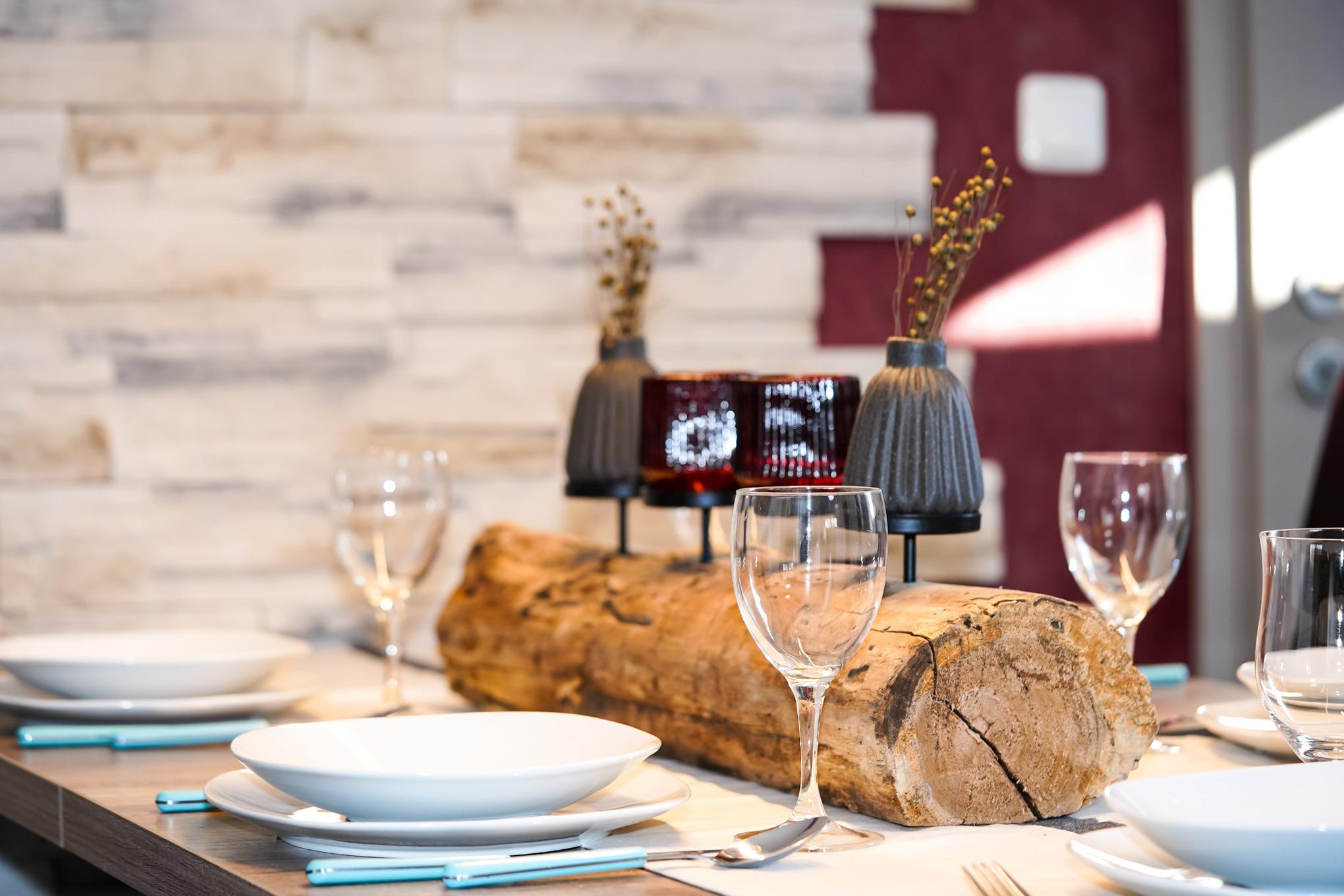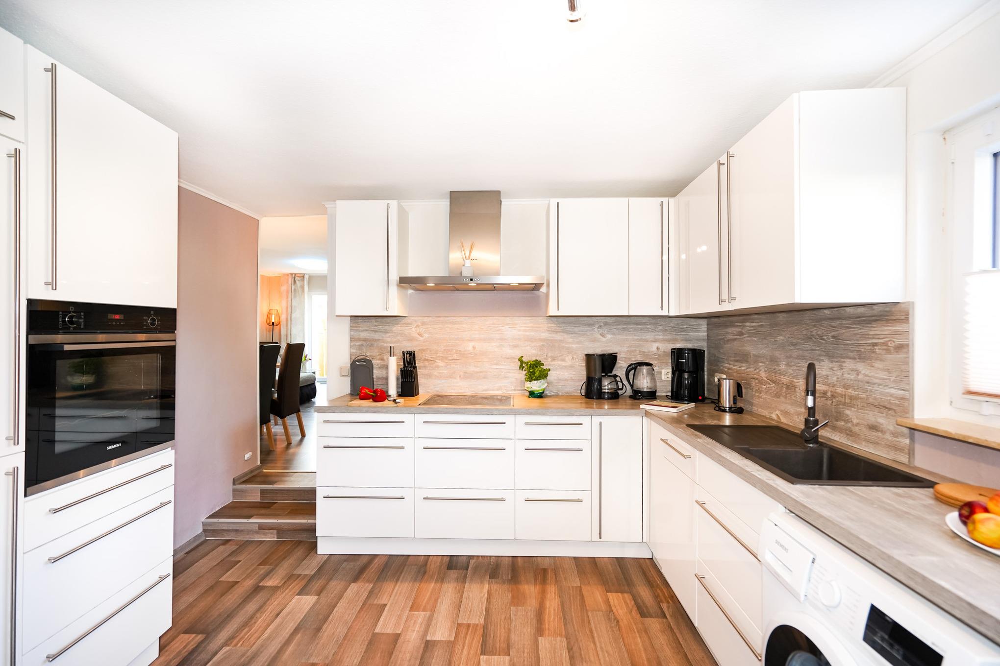 Die geschmackvoll eingerichtete Unterkunft verfügt über eine moderne Einbauküche, die mit allem ausgestattet ist, was Sie für einen gelungenen Aufenthalt benötigen. Genießen Sie gesellige Kochabende und genießen Sie entspannende Stunden am großen Esstisch. Über 2 Stufen gelangen Sie in den Wohn-Essbereich.