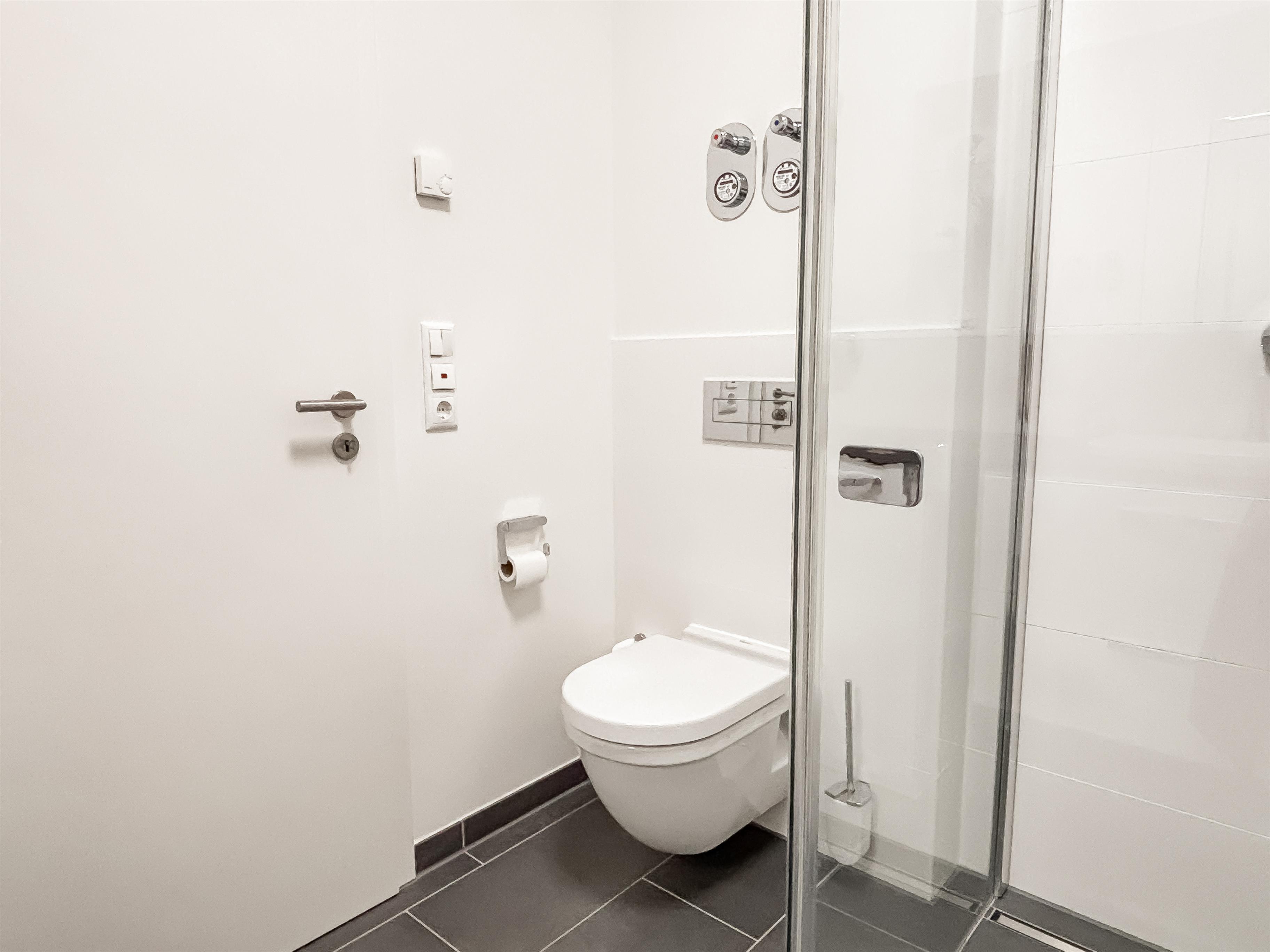 Im Badezimmer erwartet Sie eine Dusche, WC sowie ein Waschtisch mit großem Spiegel. Eine Waschmaschine steht ebenfalls zur Verfügung.
