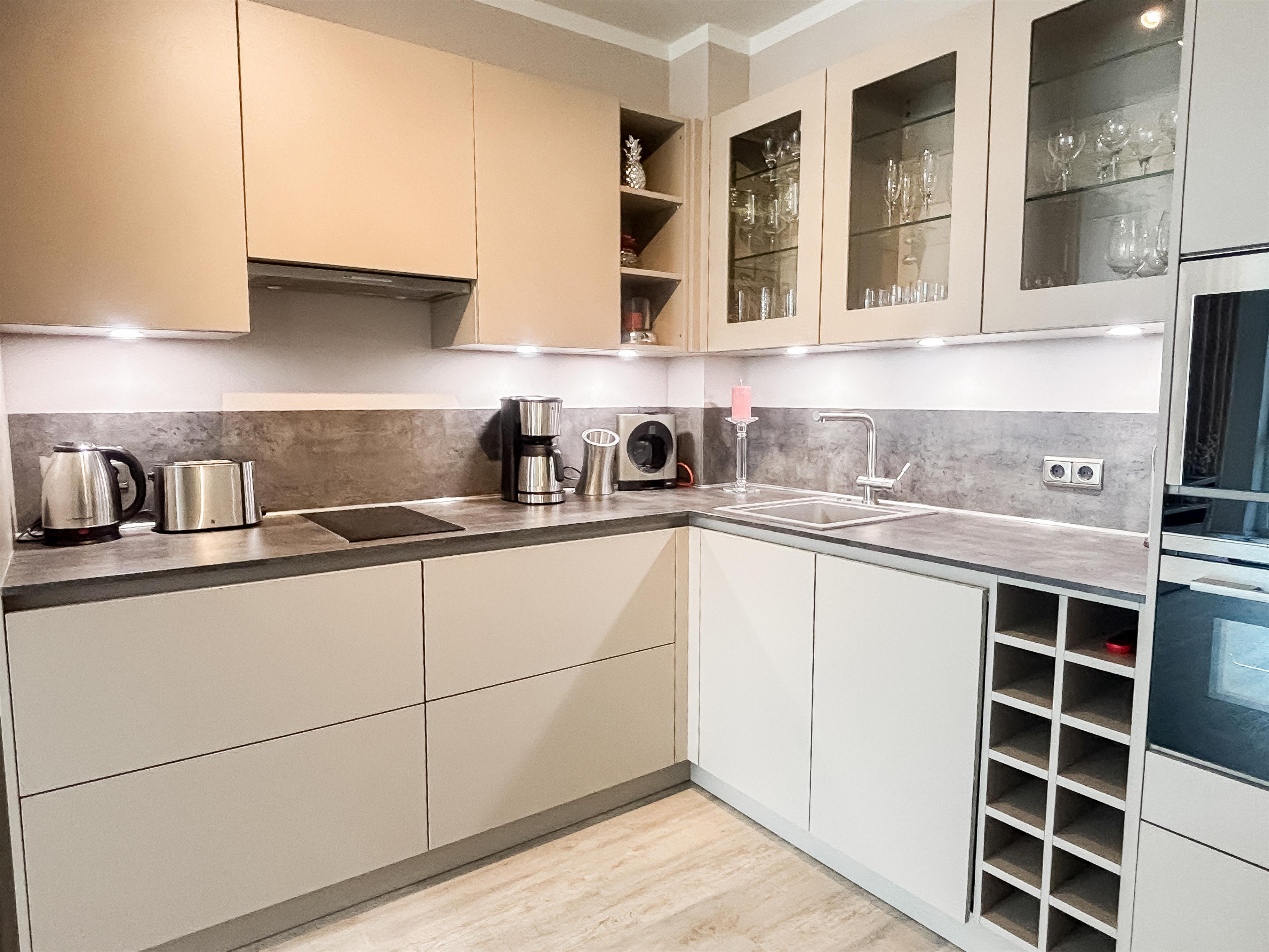 Stilvolle Ferienwohnung in Grömitz mit Balkon, moderner Küche und Nähe zur Strandpromenade, ideal für Paare oder Alleinreisende.