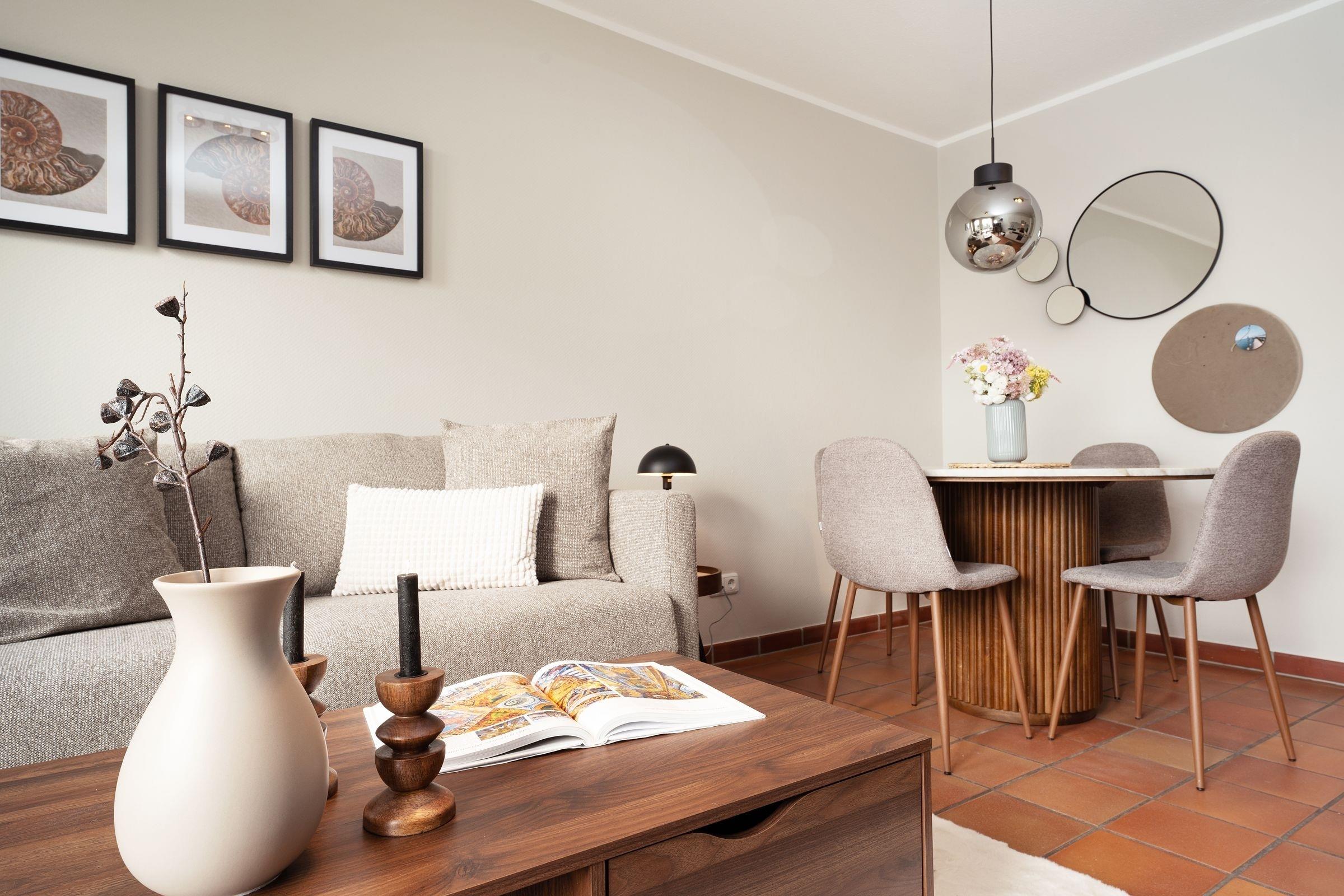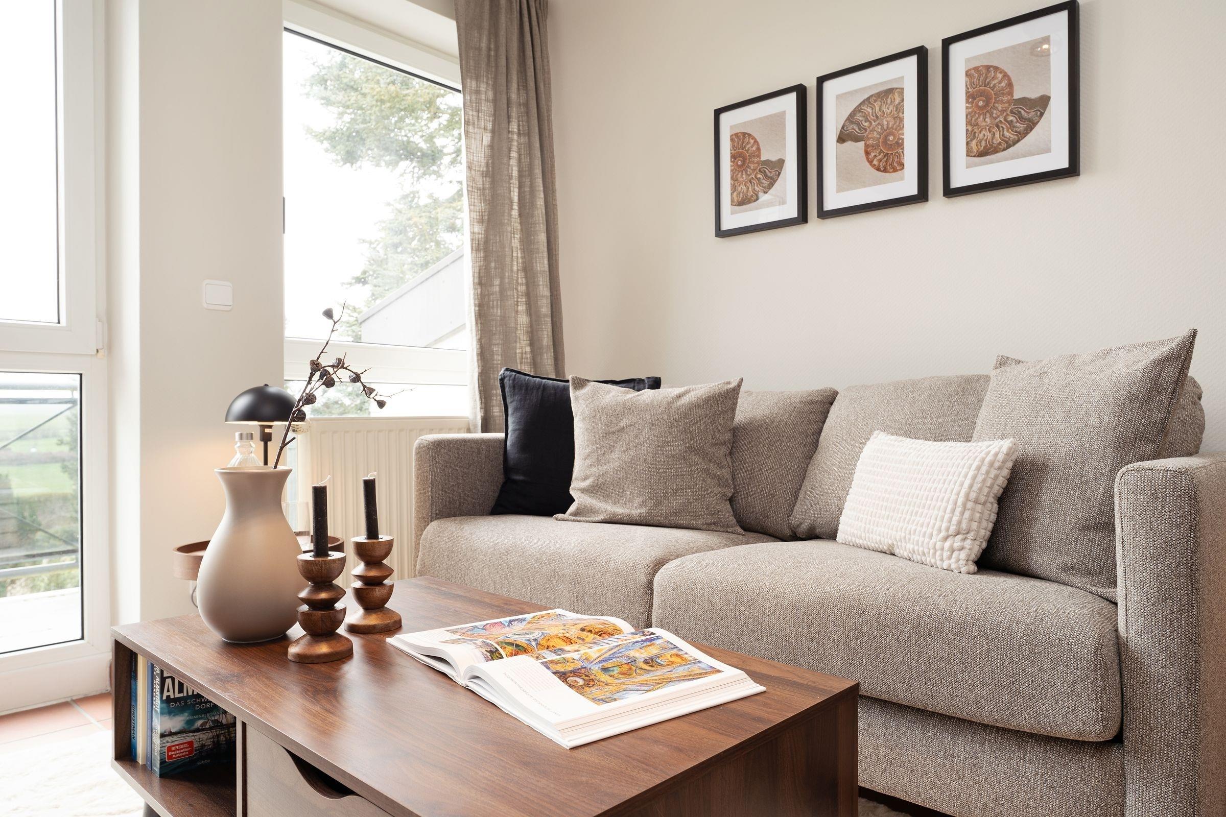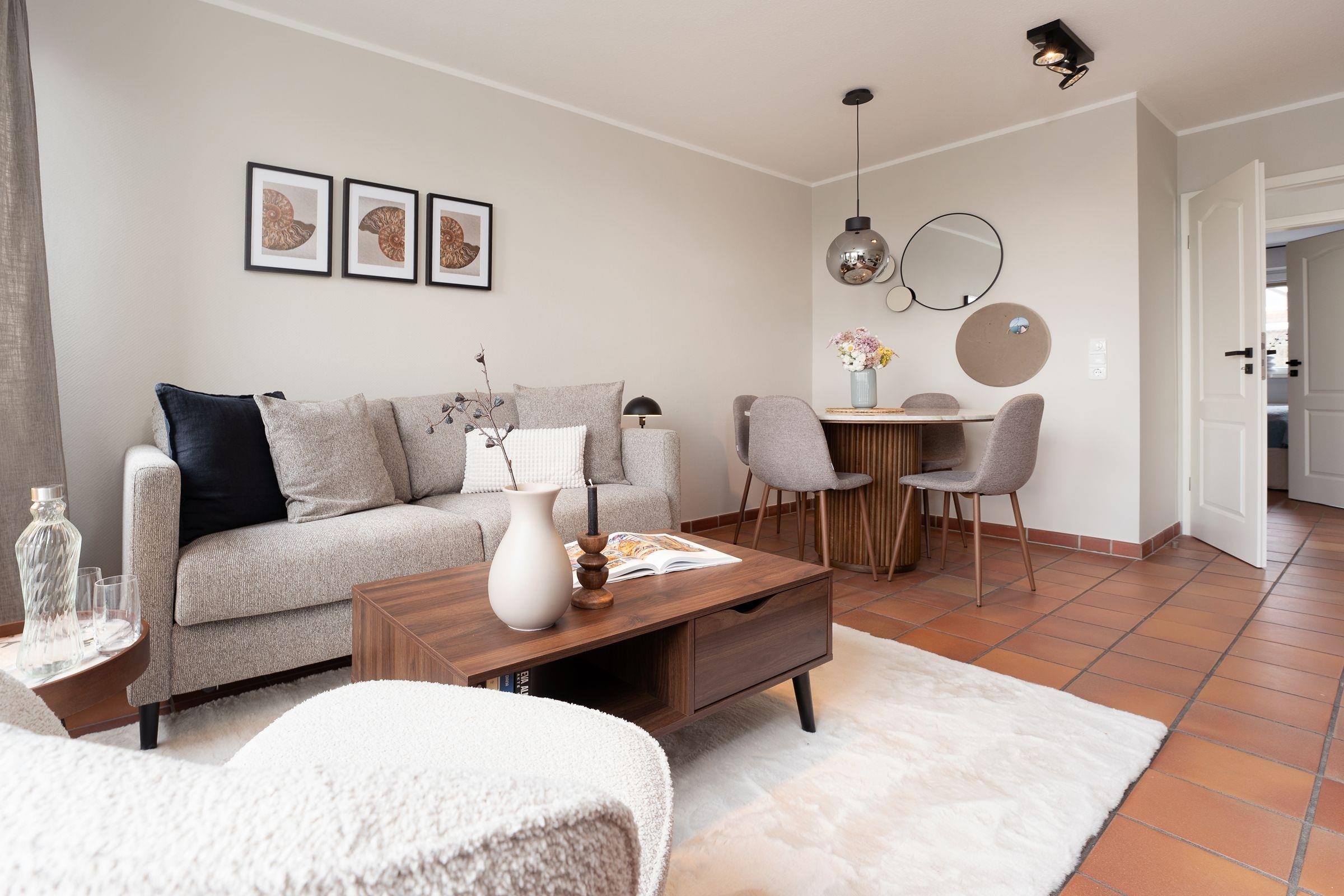 Die fein aufeinander abgestimmte Möblierung im offenen Wohnbereich mit dem angrenzenden Essplatz für bis zu 4 Personen wird ergänzt durch eine top-ausgestattete Küchenzeile. Freuen Sie sich auf gesellige Stunden bei köstlichen Mahlzeiten oder gemütliche Abende auf dem bequemen Sofa. Ein Flatscreen-TV und eine Stereoanlage bieten unterhaltsame Freizeitgestaltung. Das Meer können Sie von Ihrem kleinen, aber feinen und vor allem sehr sonnigen Südwestbalkon hören und einatmen - was für eine Sicht! Machen Sie es sich im Sommer mit einem kühlen Glas Wein hier oben gemütlich oder lassen Sie morgens bei einer Tasse frischen Kaffee Ihre Gedanken schweifen, pures Urlaubsglück!