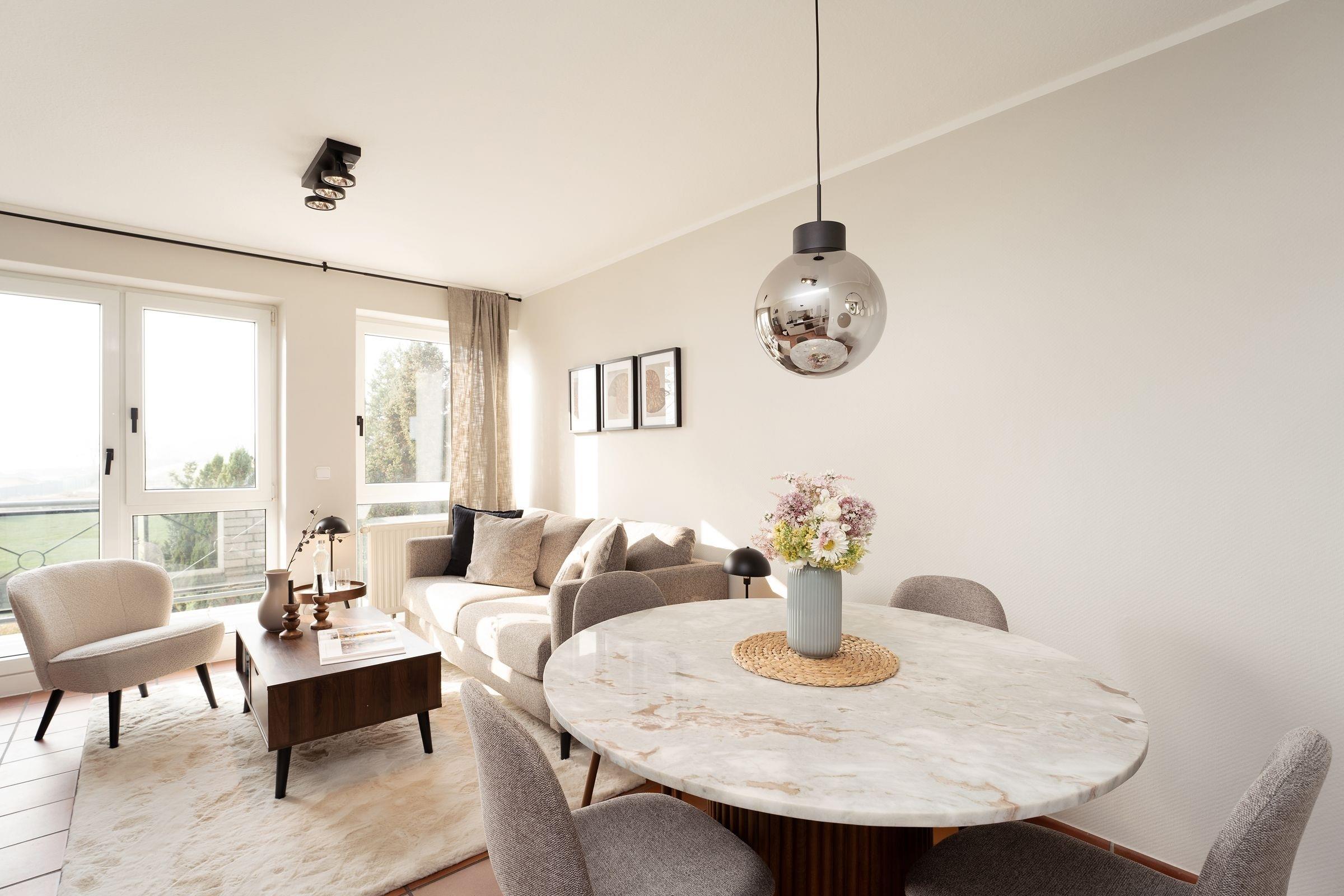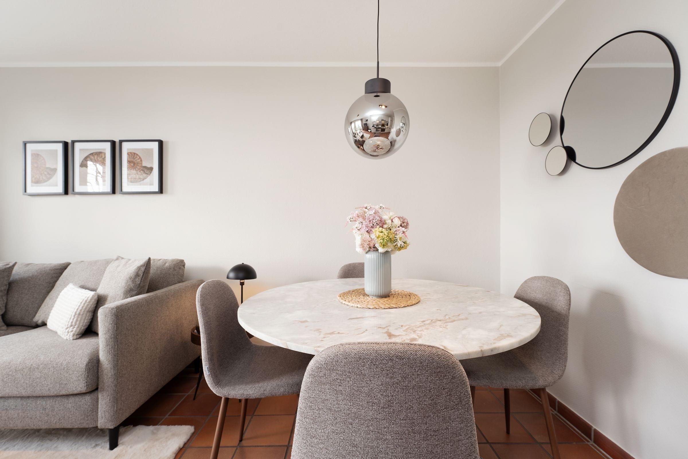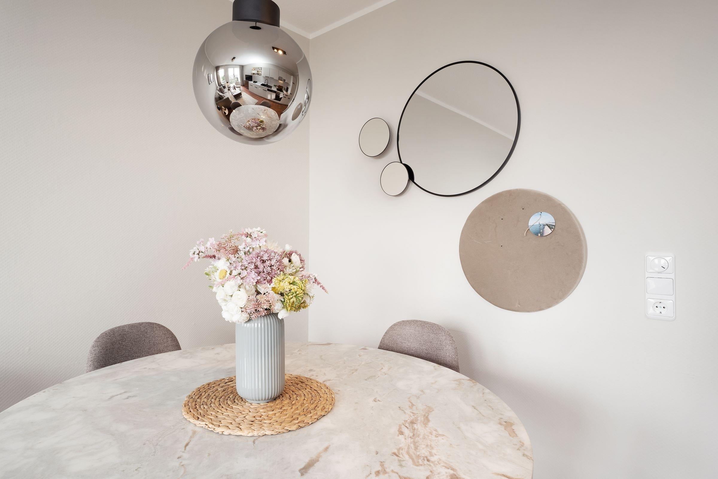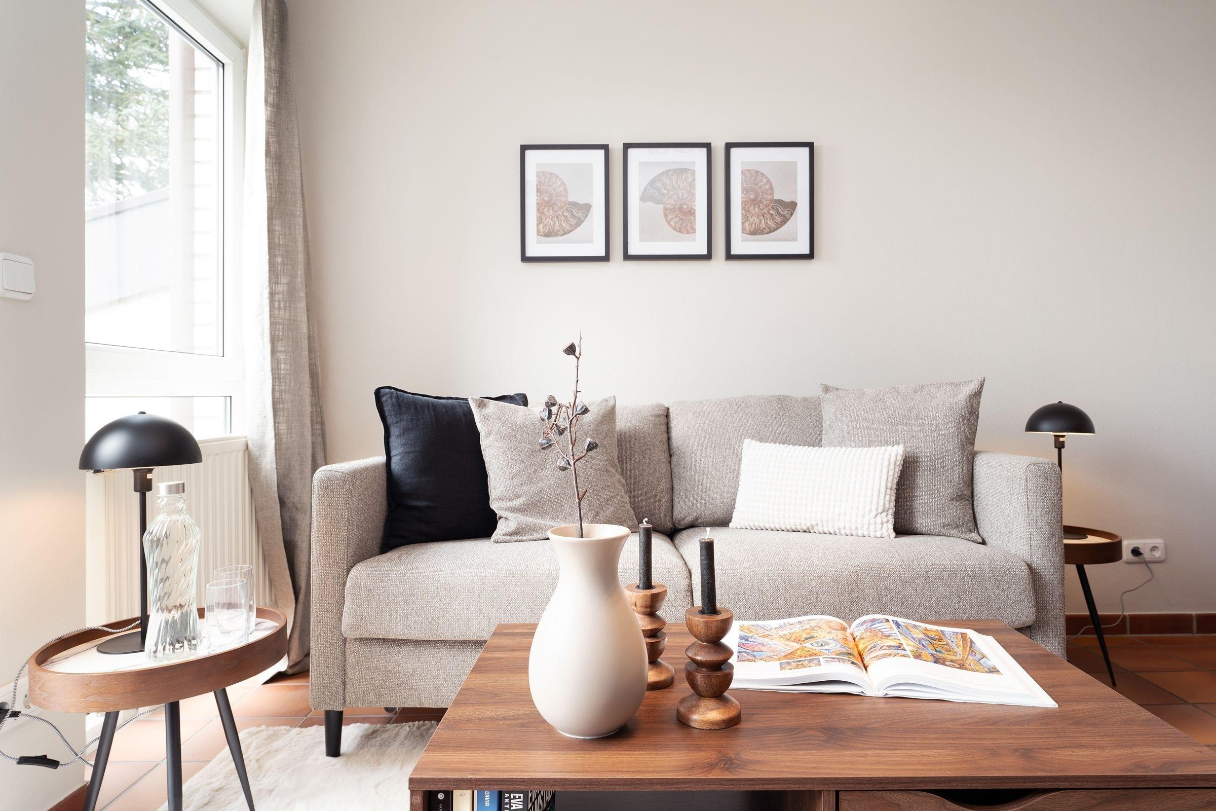 Die fein aufeinander abgestimmte Möblierung im offenen Wohnbereich mit dem angrenzenden Essplatz für bis zu 4 Personen wird ergänzt durch eine top-ausgestattete Küchenzeile. Freuen Sie sich auf gesellige Stunden bei köstlichen Mahlzeiten oder gemütliche Abende auf dem bequemen Sofa. Ein Flatscreen-TV und eine Stereoanlage bieten unterhaltsame Freizeitgestaltung. Das Meer können Sie von Ihrem kleinen, aber feinen und vor allem sehr sonnigen Südwestbalkon hören und einatmen - was für eine Sicht! Machen Sie es sich im Sommer mit einem kühlen Glas Wein hier oben gemütlich oder lassen Sie morgens bei einer Tasse frischen Kaffee Ihre Gedanken schweifen, pures Urlaubsglück!