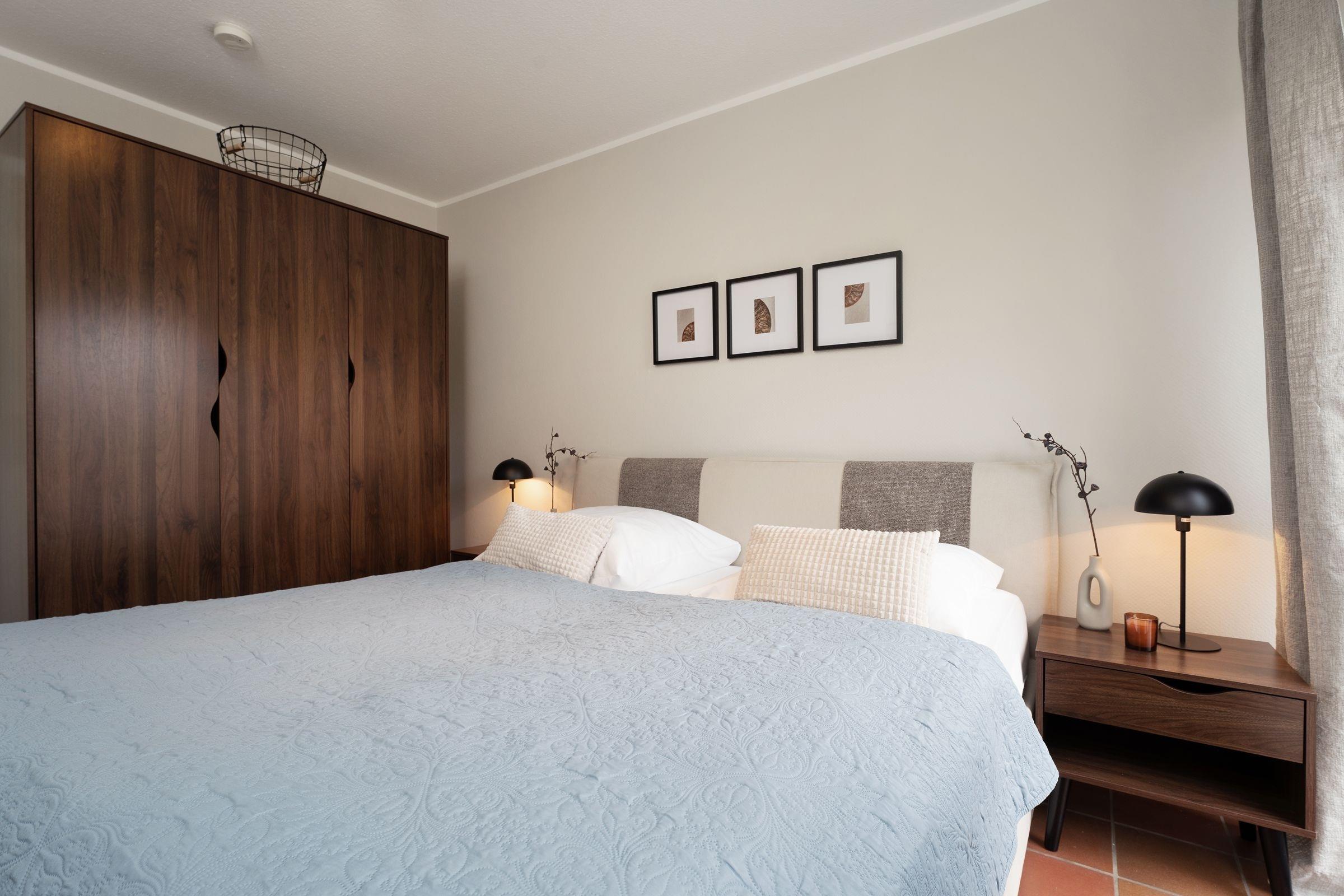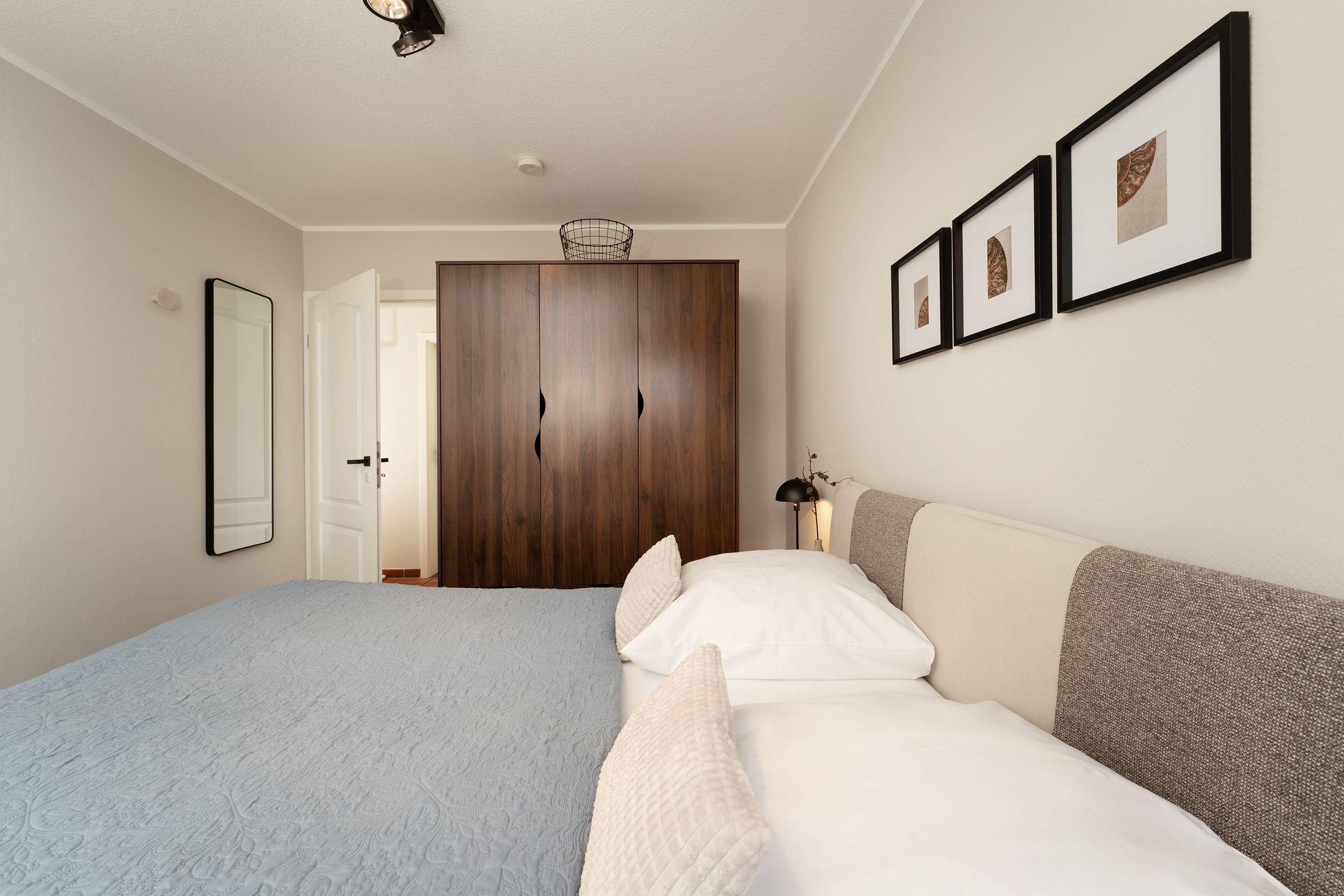 Ein Zimmer mit ausziehbarem Kojenbett bietet 2 Schlafplätze (2x85x195cm), im Schrank bringen Sie bequem Ihre Kleidungsstücke unter. Ein weiteres Schlafzimmer verfügt über ein Doppelbett (2x90x200cm) und einen geräumigen Kleiderschrank mit Schiebetüren. Rundum überzeugt dieses Logis mit stilsicherer Einrichtung und Komfort – Meeresrauschen inklusive. Das elegante Wohlfühlbad zeigt sich frisch und freundlich mit einer geräumigen Dusche, WC und einem klassischen Waschbecken mit Spiegel.