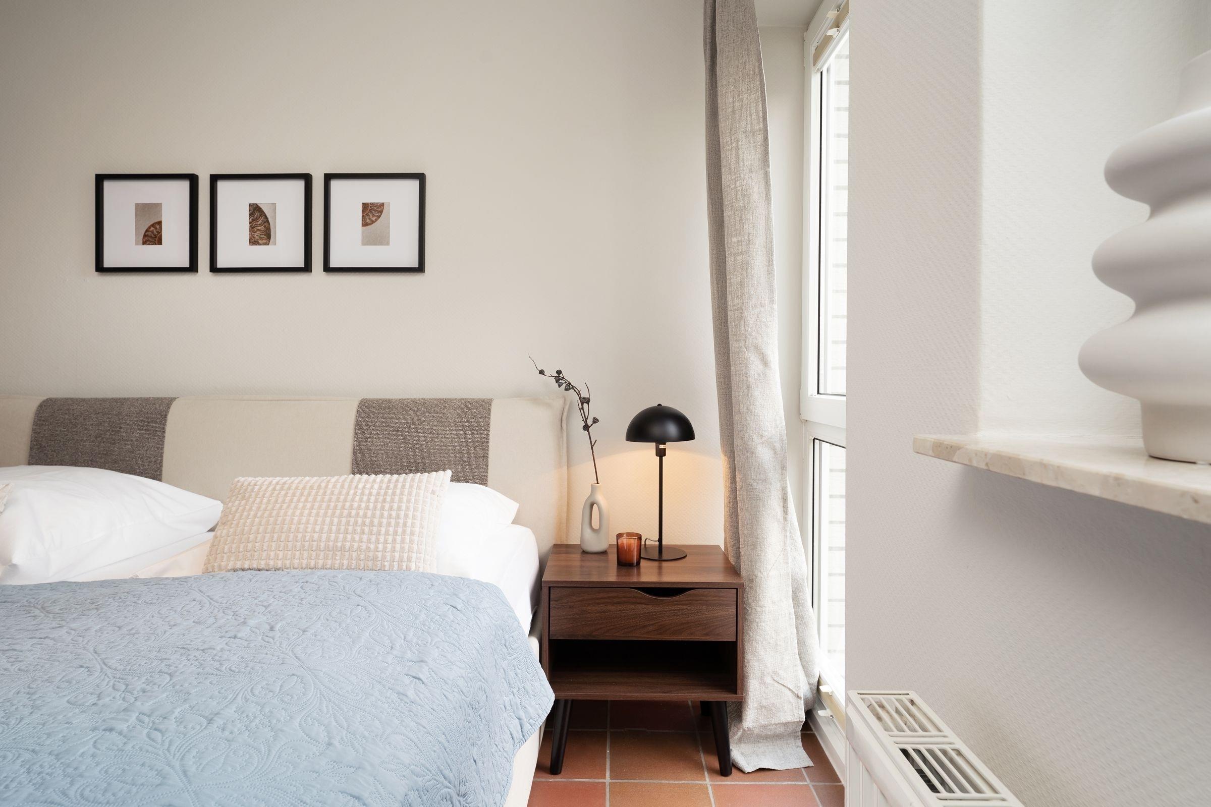 Schlafzimmer 1: 1 Boxspring-Doppelbett (160x200 cm), Verdunkelungsplissee, Platz für ein Babybett vorhanden