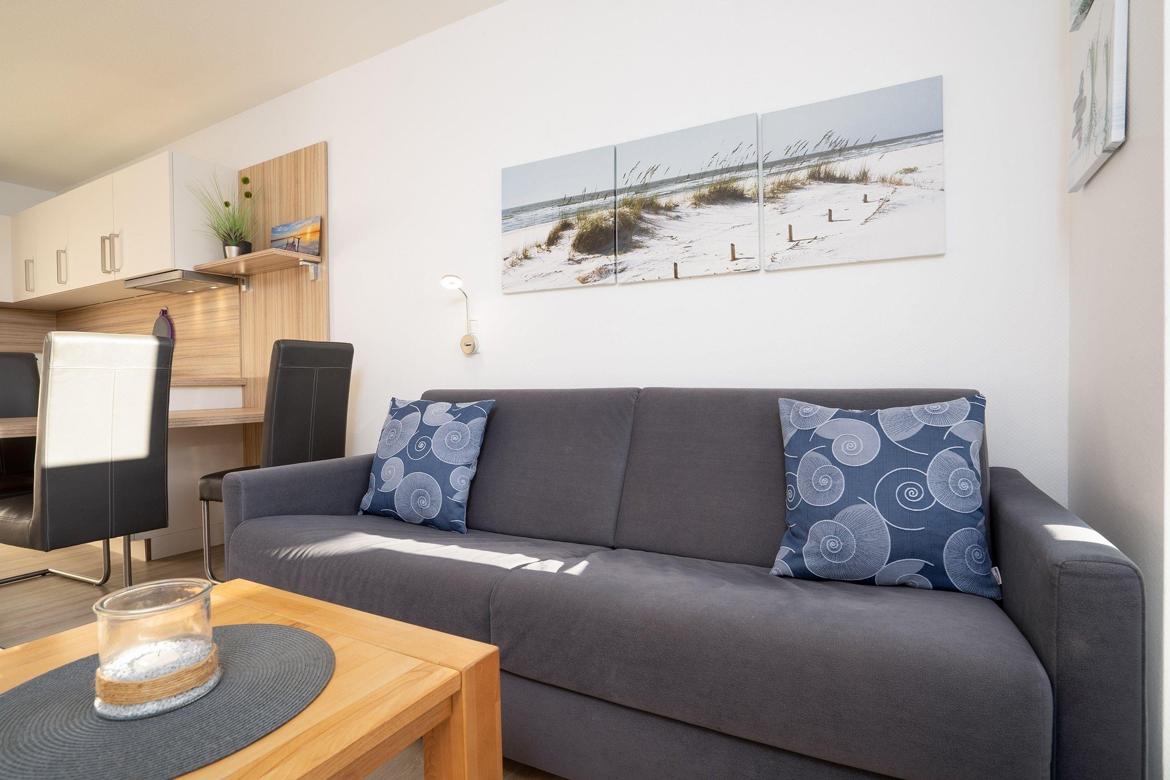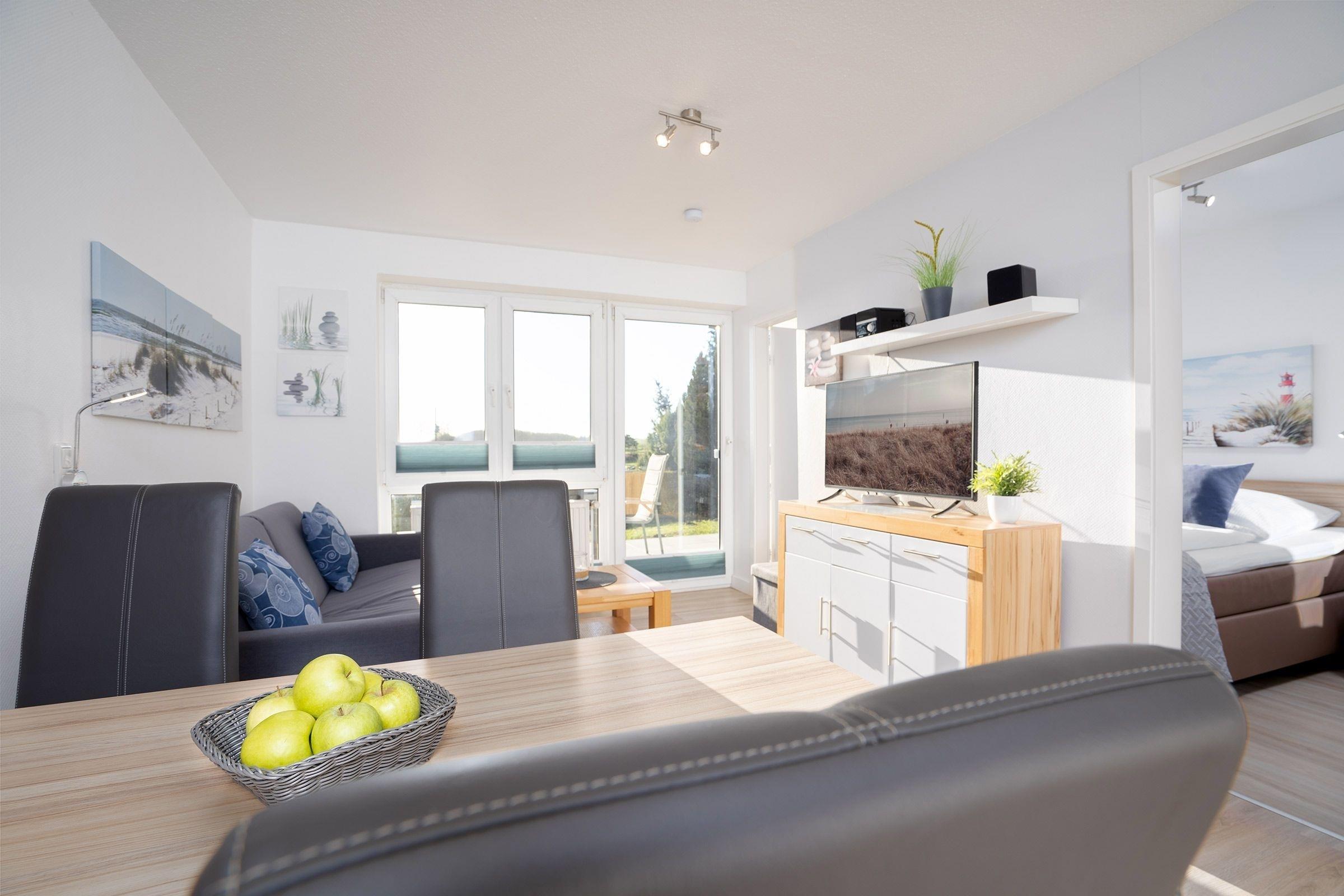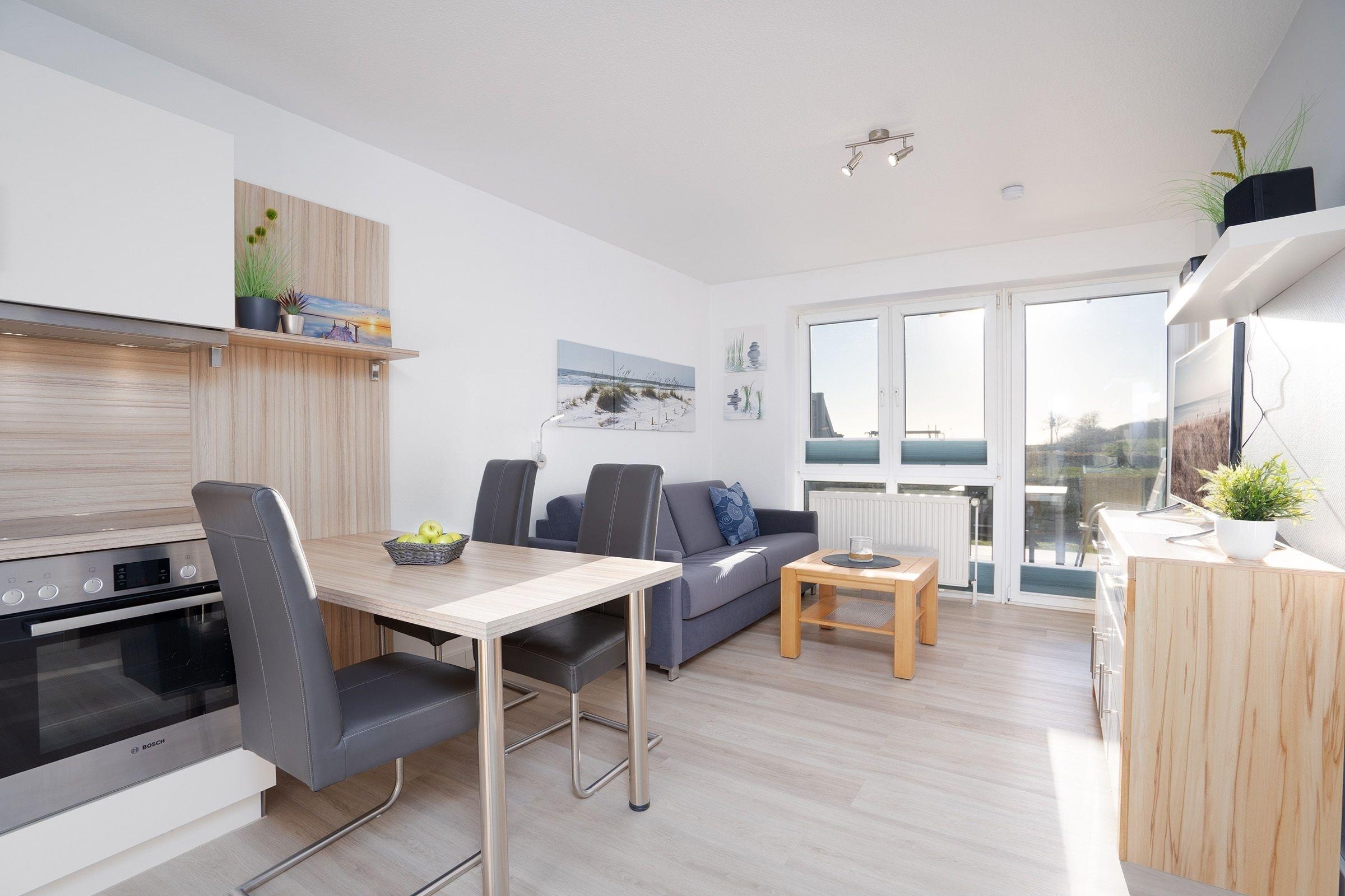 Im hellen Wohnbereich lädt das gemütliche Sofa zu Fernsehstunden vor dem UHD-Smart-TV ein. Auch Musikfans können sich freuen, denn eine Stereoanlage gehört ebenfalls zur Grundausstattung. Das Sofa bietet bei Bedarf ausreichend Platz (160x200 cm) als 3. Schlafmöglichkeit. Tolle Gerichte lassen sich in der offen gestalteten Küche zubereiten, die mit allen Annehmlichkeiten ausgestattet ist. Für den besonderen Kaffeegenuss steht sogar eine Nespresso-Maschine bereit. Der gleich angrenzende Esstisch bietet sich perfekt an für gemeinsames Essen, Spiele-Abende oder einfach nur zum Klönen. Vom Wohnbereich aus gelangt man auf die möblierte Südwest-Terrasse mit Blick auf den schönen Yachthafen. Hier können Sie ungestörte Urlaubsstunden verbringen, sonnenbaden und entspannen. Im separaten Schlafzimmer mit Komfort-Boxspring-Bett (2x90x200 cm) lässt es sich hervorragend schlafen und Sie können ausgeruht und frisch in den neuen Tag starten. Das moderne Duschbad ist mit praktischer Handtuchheizung ausgestattet. Ein WLAN-Anschluss ist inklusive.