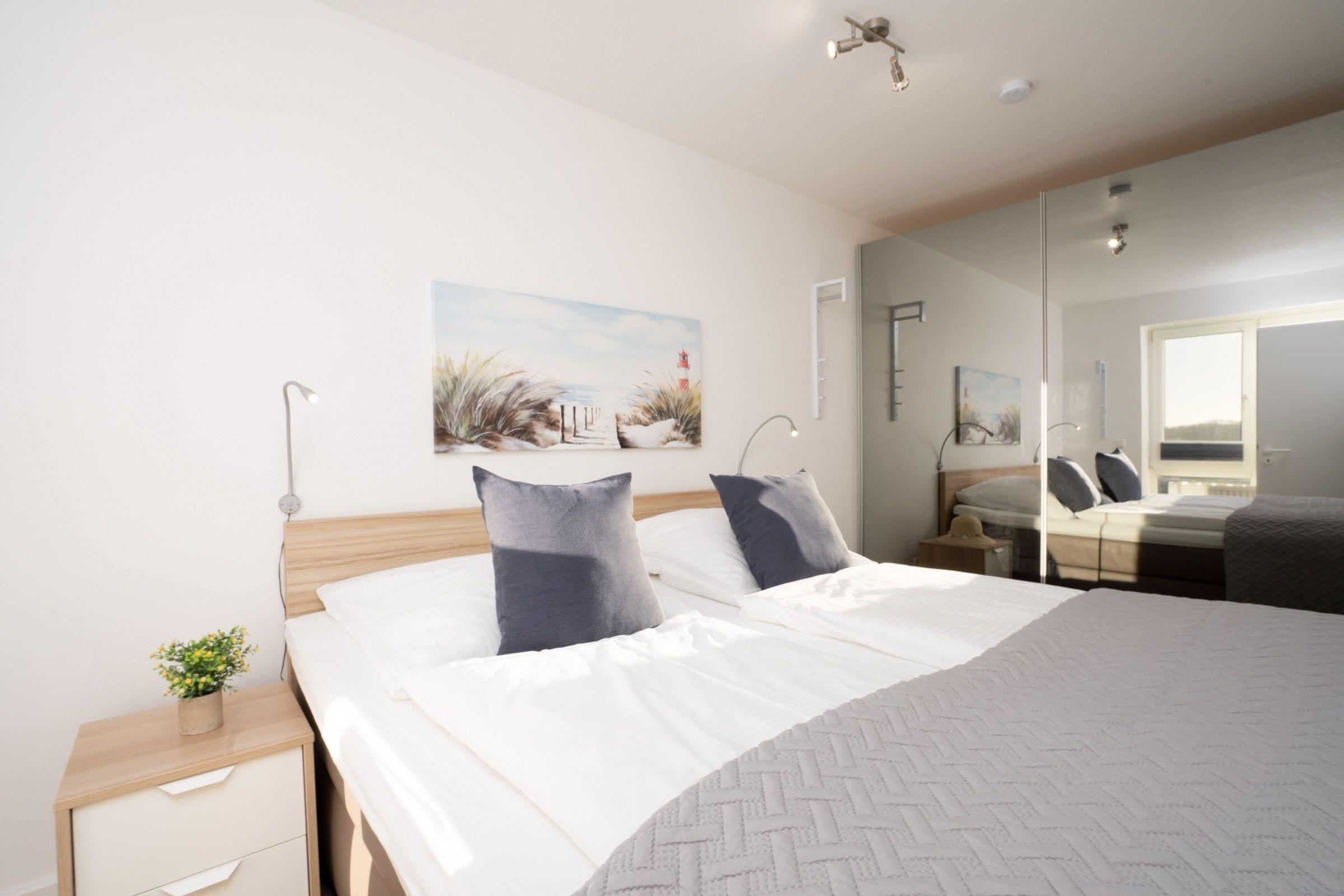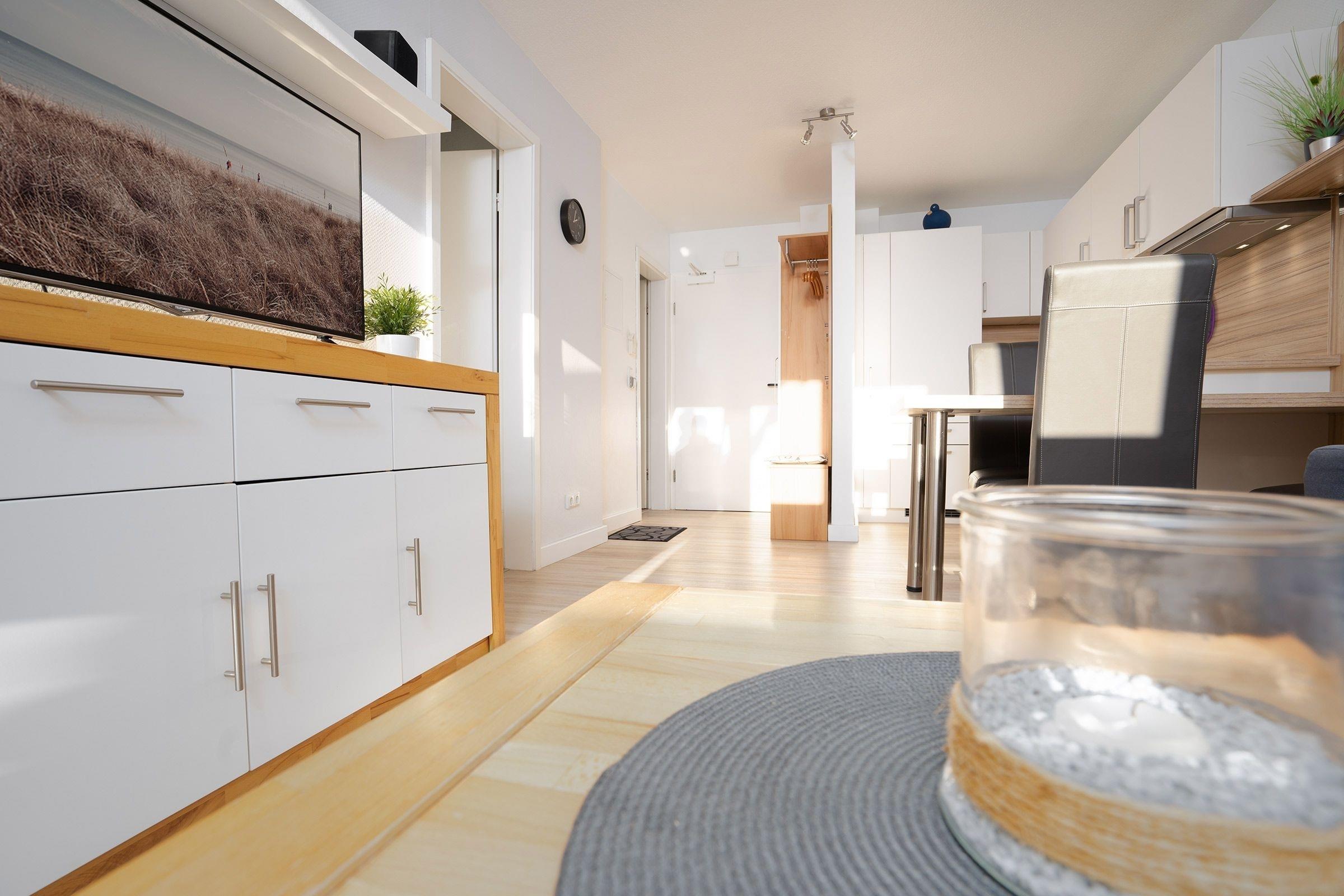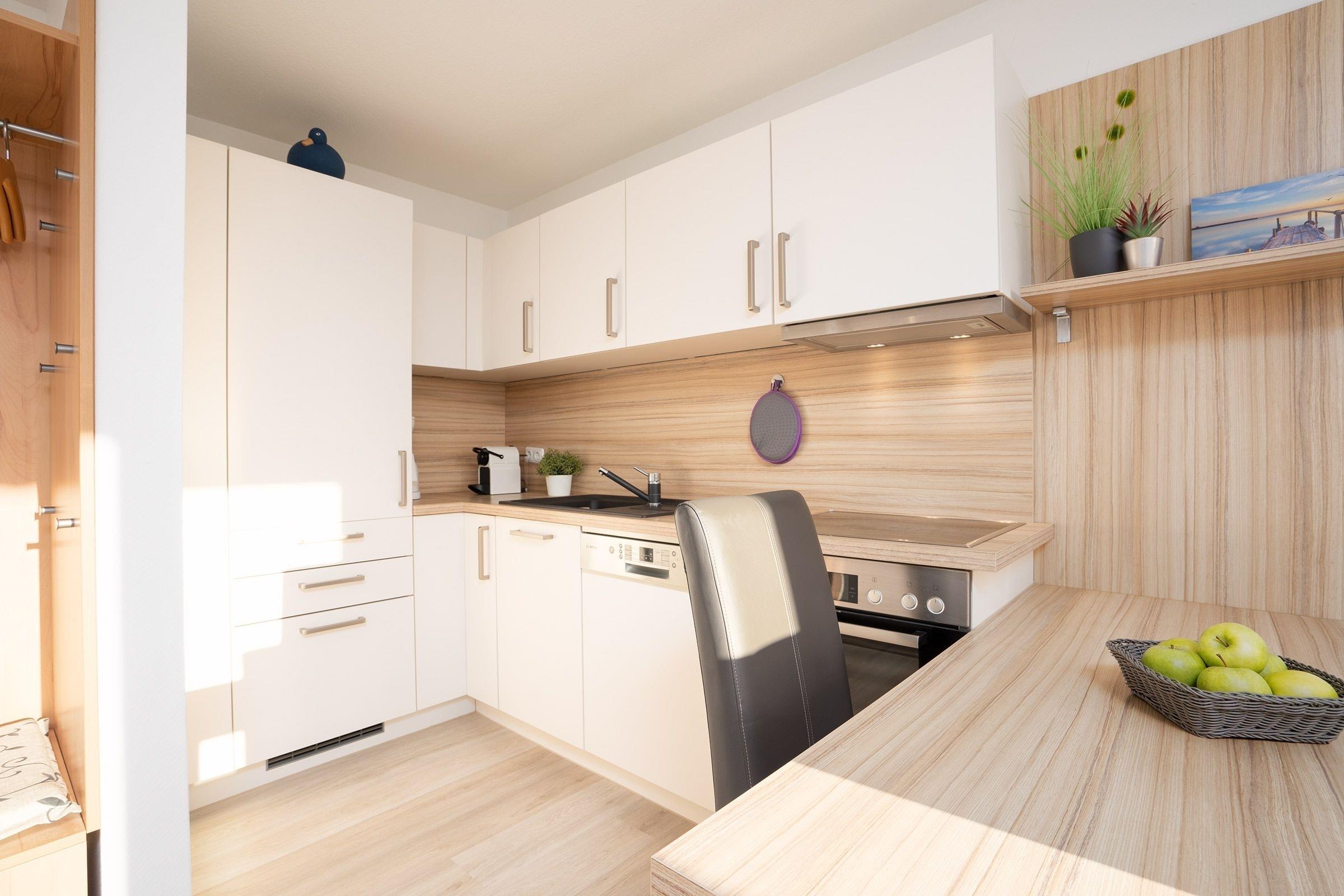 Im hellen Wohnbereich lädt das gemütliche Sofa zu Fernsehstunden vor dem UHD-Smart-TV ein. Auch Musikfans können sich freuen, denn eine Stereoanlage gehört ebenfalls zur Grundausstattung. Das Sofa bietet bei Bedarf ausreichend Platz (160x200 cm) als 3. Schlafmöglichkeit. Tolle Gerichte lassen sich in der offen gestalteten Küche zubereiten, die mit allen Annehmlichkeiten ausgestattet ist. Für den besonderen Kaffeegenuss steht sogar eine Nespresso-Maschine bereit. Der gleich angrenzende Esstisch bietet sich perfekt an für gemeinsames Essen, Spiele-Abende oder einfach nur zum Klönen. Vom Wohnbereich aus gelangt man auf die möblierte Südwest-Terrasse mit Blick auf den schönen Yachthafen. Hier können Sie ungestörte Urlaubsstunden verbringen, sonnenbaden und entspannen. Im separaten Schlafzimmer mit Komfort-Boxspring-Bett (2x90x200 cm) lässt es sich hervorragend schlafen und Sie können ausgeruht und frisch in den neuen Tag starten. Das moderne Duschbad ist mit praktischer Handtuchheizung ausgestattet. Ein WLAN-Anschluss ist inklusive.
