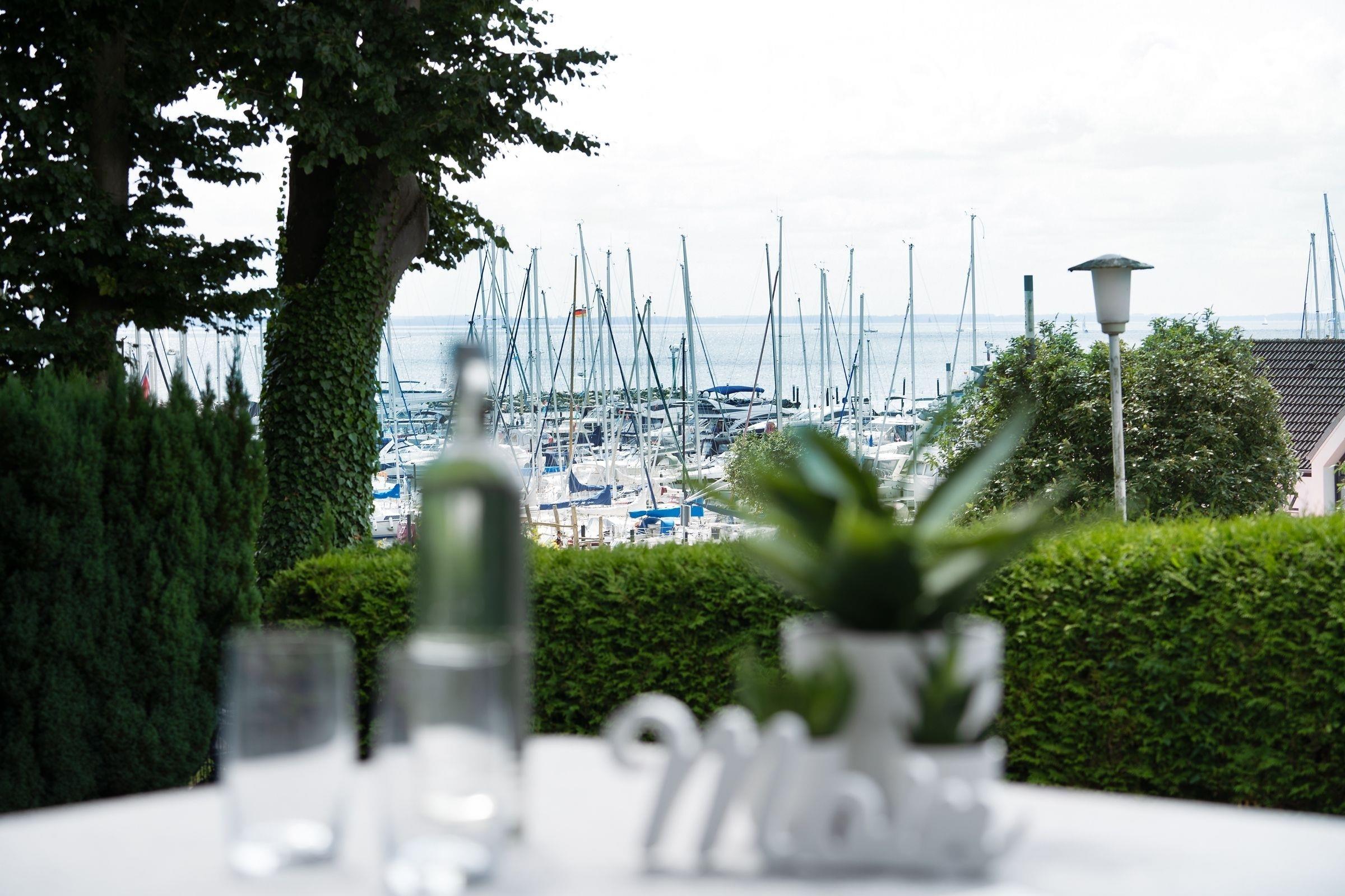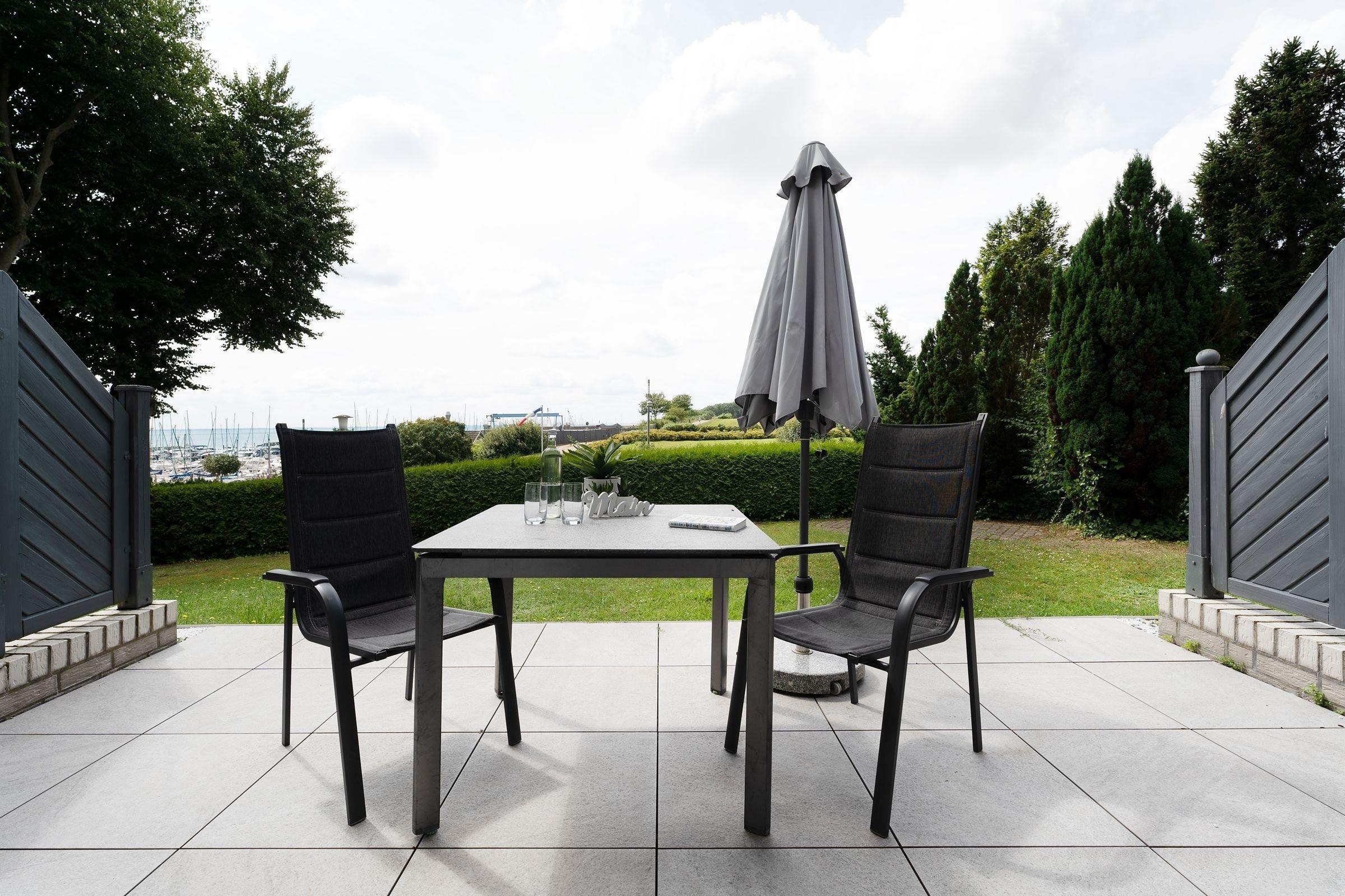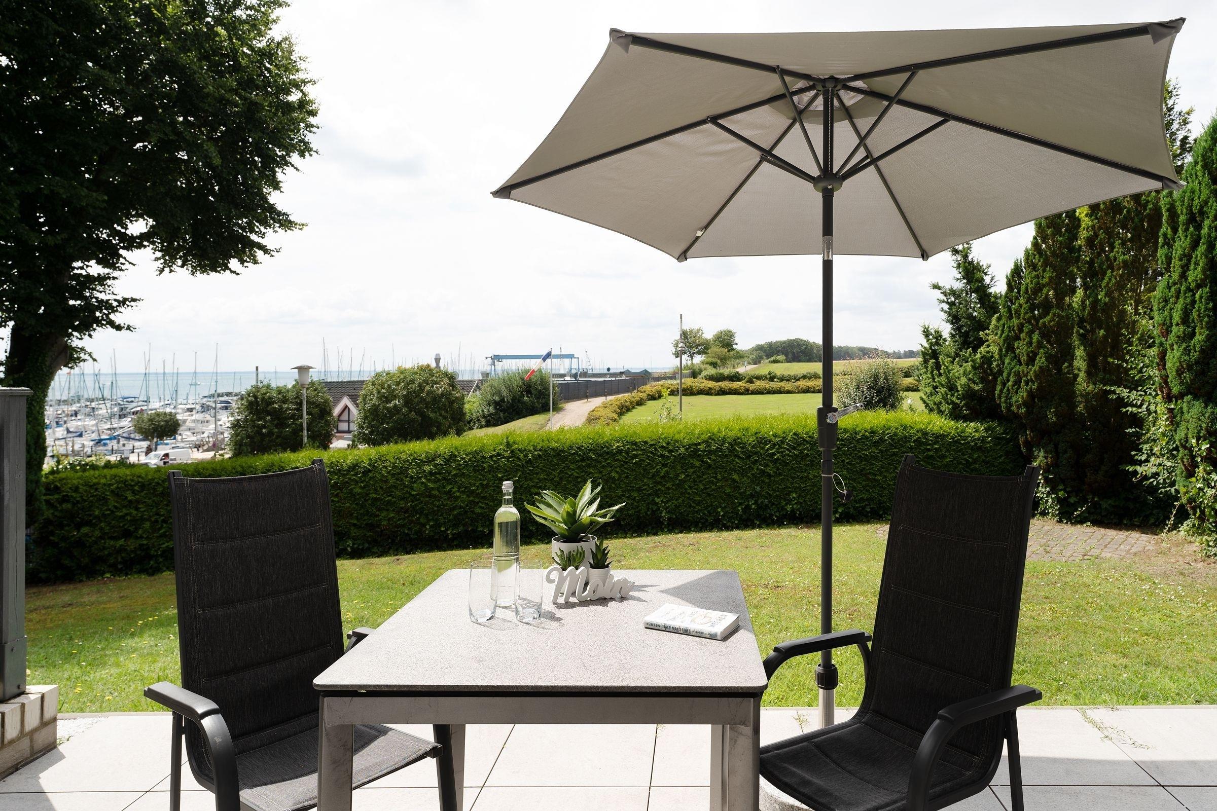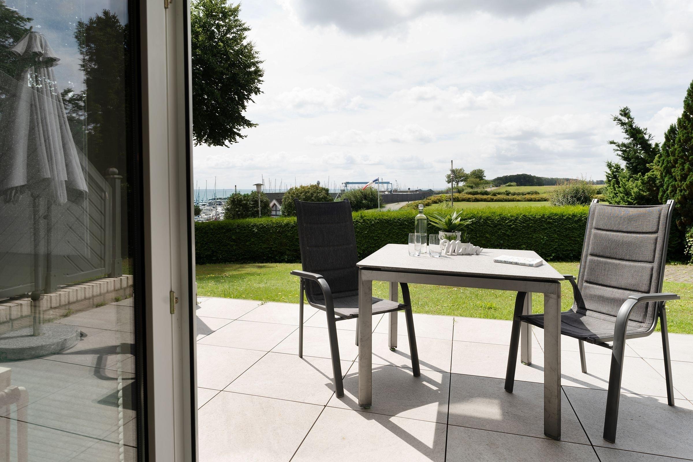 Moderne Ferienwohnung mit Terrasse und Yachthafenblick in Grömitz, ideal für entspannte Ostseeferien.