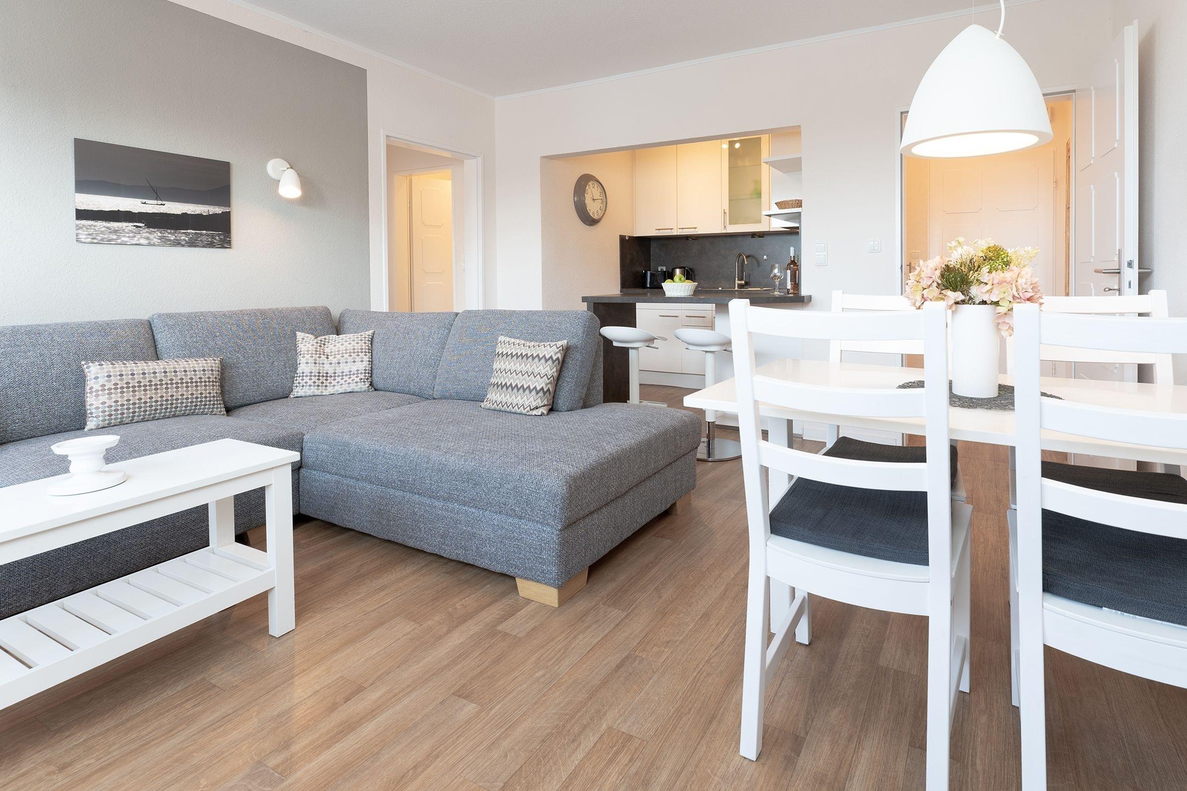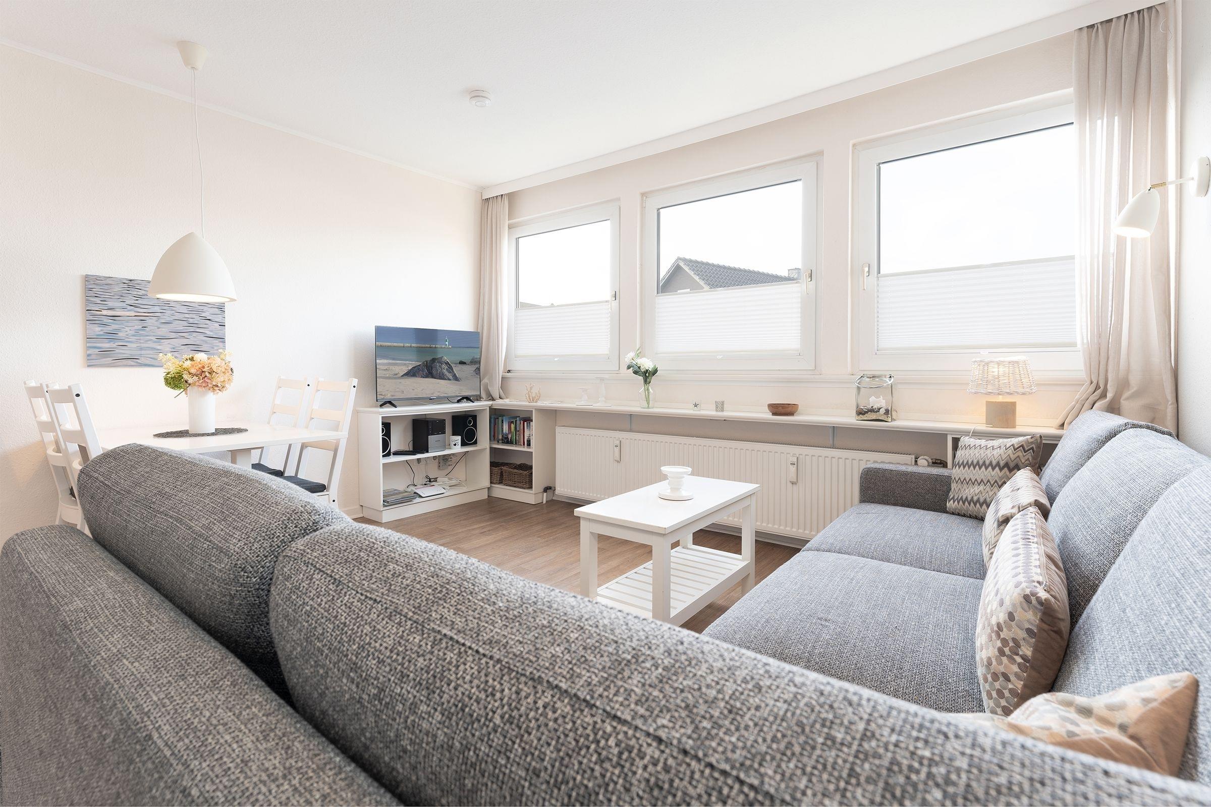 Ihre 3-Zimmerwohnung bietet mit 48m² Wohnfläche und smarter Einrichtung genügend Platz für bis zu 4 Personen. Das große Wohnzimmer, die moderne, gut ausgestattete Küche, einen Schlafraum mit 2 Einzelbetten (je 90x200 cm) und ein Schlafzimmer mit Doppelbett (2 x 80x200 cm) werden Ihre Wünsche erfüllen und Ihre Vorstellungen übertreffen. Ein komplett renoviertes neues Duschbad ist mit allem ausgestattet, was Sie für einen frischen Start in den Tag benötigen.