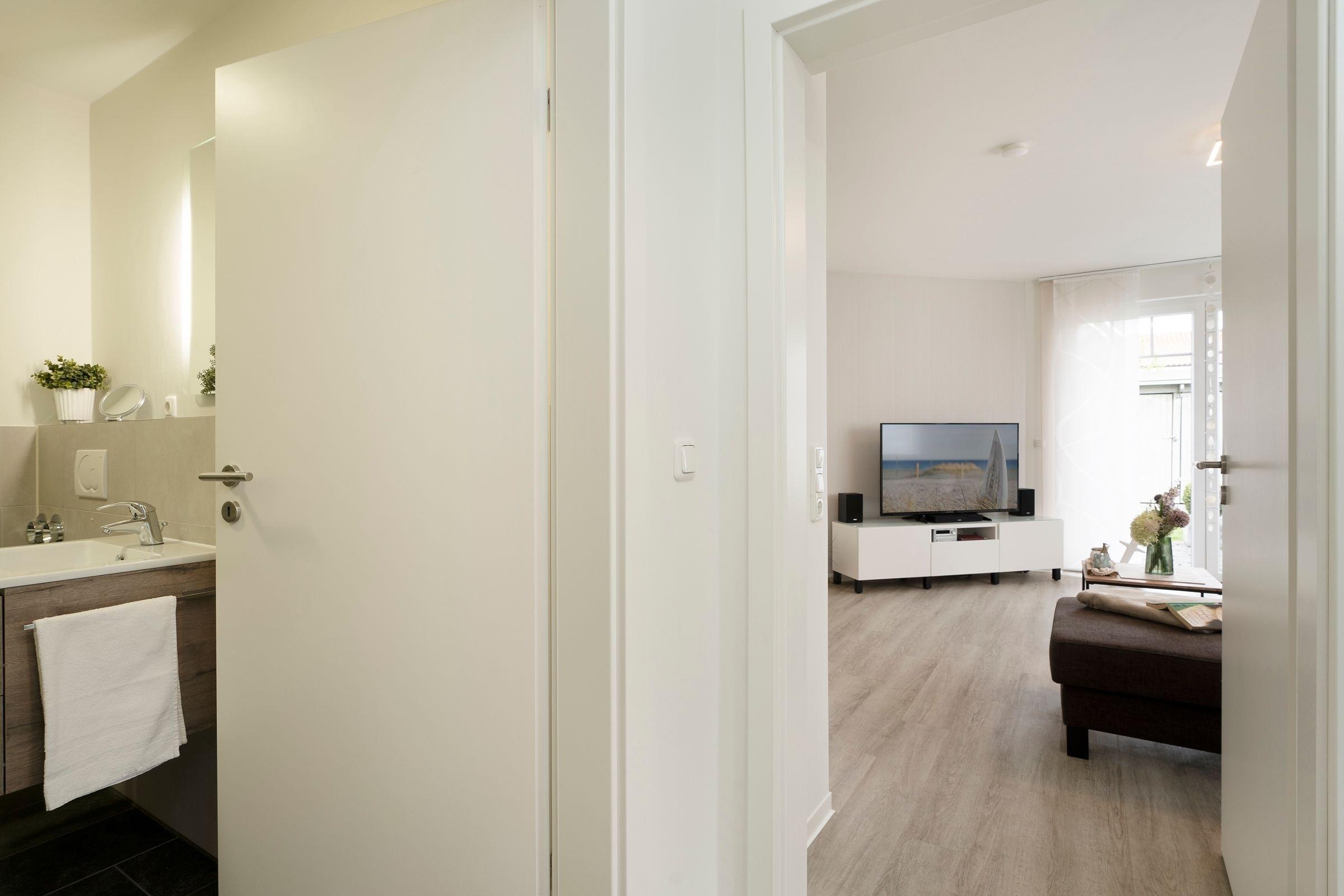 Eine voll ausgestattete Küche, Fenster mit elektrischen Rollläden, ein kombinierter Wasch- und Trockenautomat, WLAN-Anschluss, zwei große LED/Smart TV im Wohn- und Schlafzimmer sowie eine kompakte Soundbar mit Bluetooth-Schnittstelle, alles ist vom Feinsten eingerichtet. Im Schlafzimmer garantiert ein komfortables Doppelbett (2 x 90x200 cm) Erholung pur. Auf Ihrer Terrasse mit Südwestausrichtung entspannen Sie und genießen jede Sekunde. In den Frühlings- und Sommermonaten stehen Ihnen gemütliche Gartenmöbel zur Verfügung. Hier können ebenfalls mitgebrachte Fahrräder abgestellt werden.