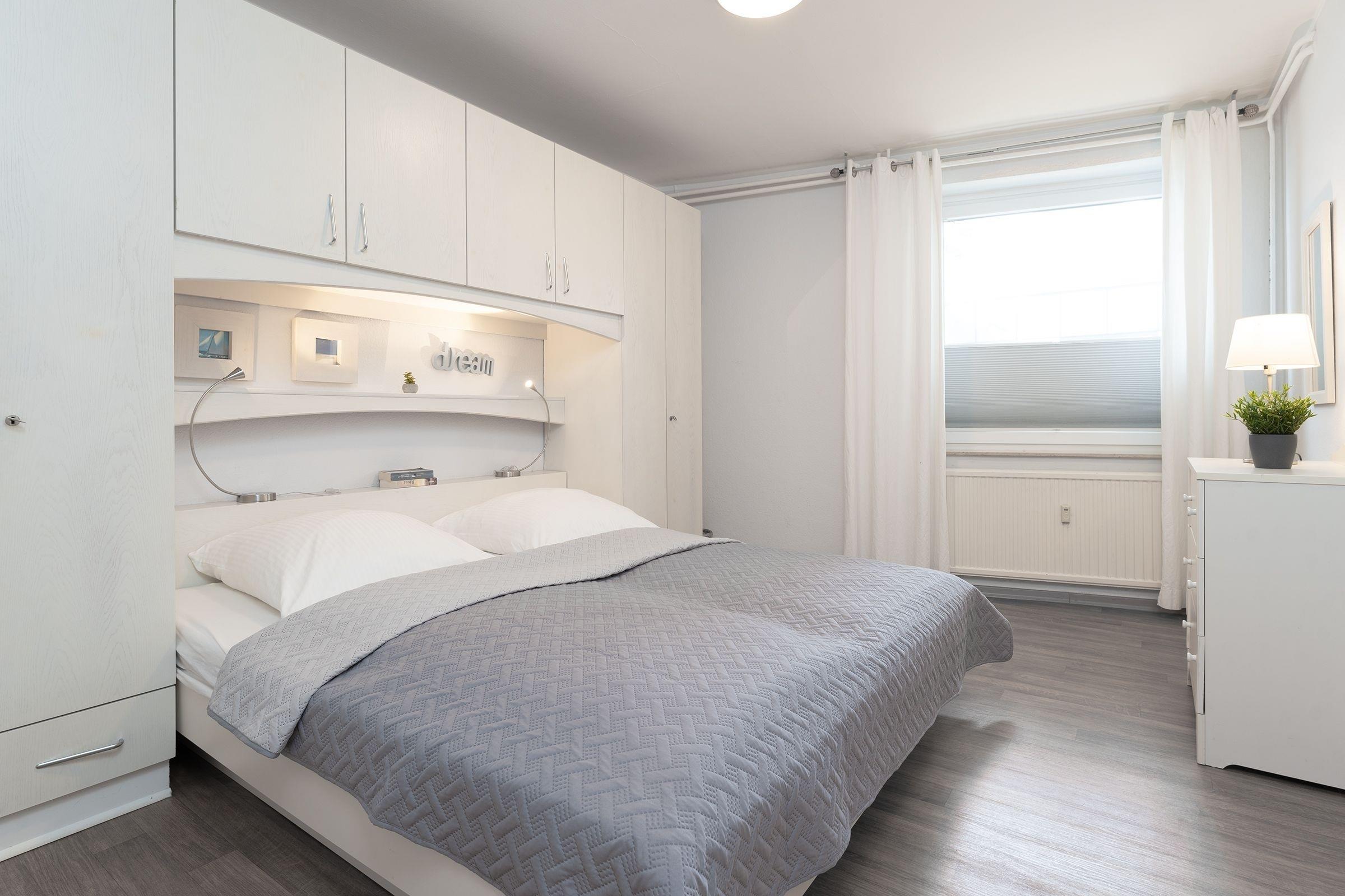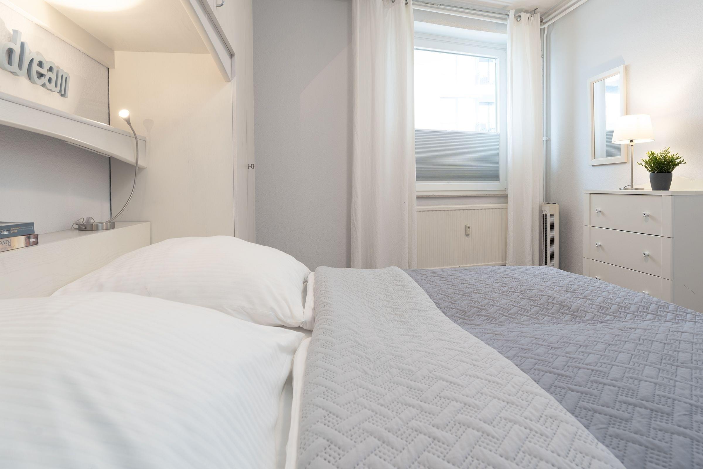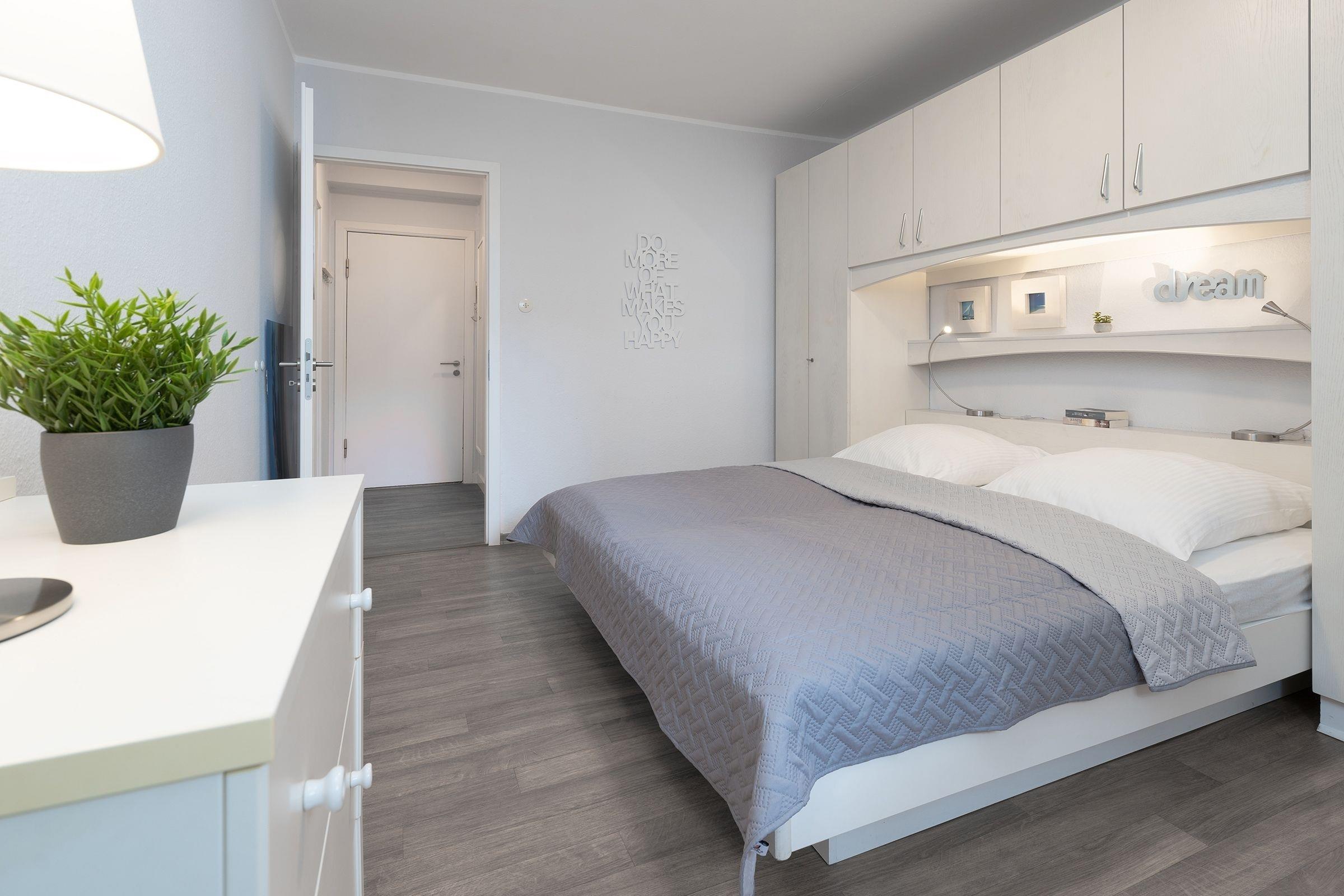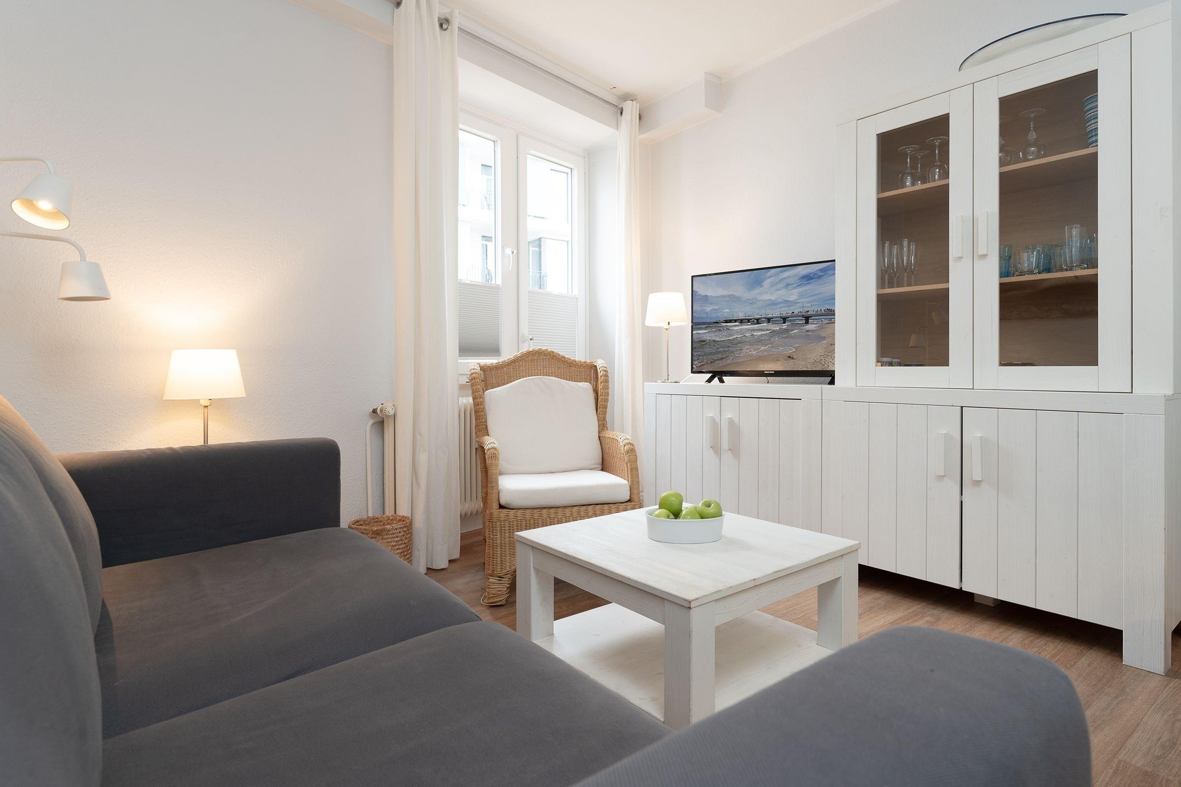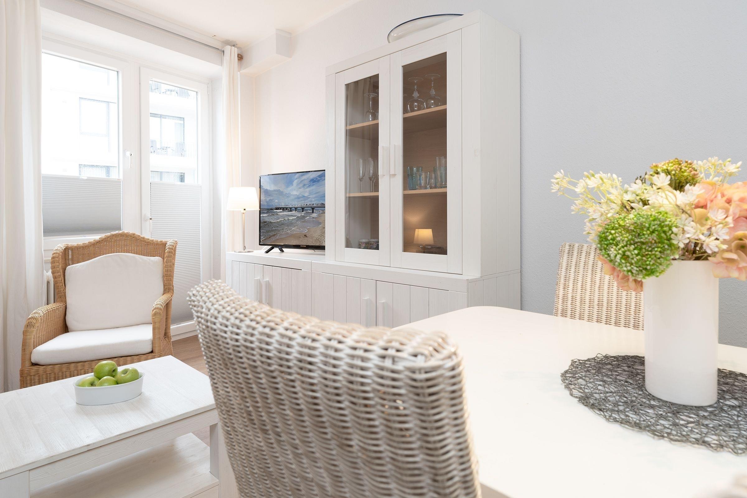 Die Ferienwohnung ist zeitlos im modernen Landhausstil eingerichtet, warme Farben und maritime Elemente sorgen für ein gemütliches Wohnambiente und Komfort. Der lichtdurchflutete, offen gestaltete Wohnbereich ist mit Sofa, Sessel, Flatscreen-TV, Vitrine und Essplatz für 4 Personen ausgestattet. Von hier aus führt ein direkter Zugang auf den möblierten Balkon mit Südwest-Ausrichtung, hier genießen Sie zahlreiche Sonnenstunden und können dem Meeresrauschen lauschen. Das hochwertige Schlafsofa bietet bei Bedarf einen Schlafplatz für eine Person (90x200 cm), Plissees und Vorhänge sorgen für angenehme Verdunklung. Das separate Schlafzimmer ist hell und großzügig geschnitten und mit ein bequemem Doppelbett (2x 90x200 cm), Kommode, Spiegel und Kleiderschrank möbliert. Plissees und Vorhänge sorgen auch hier für angenehme Verdunklung. In der separaten, gut ausgestatteten Küche bereiten Sie problemlos kleine Mahlzeiten zu, Annehmlichkeiten wie Ceranfeld, Backofen in angenehmer Arbeitshöhe und Spülmaschine helfen im Urlaubsalltag. Das hell geflieste Badezimmer ist mit Dusche, Spiegelschrank und Handtuchheizung ausgestattet.