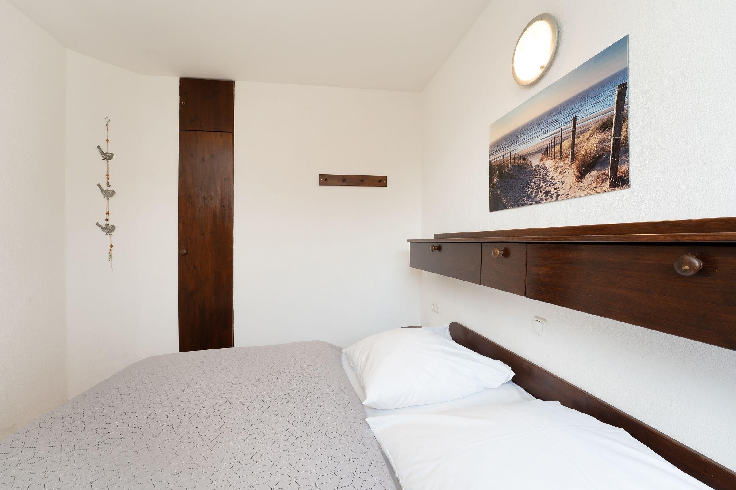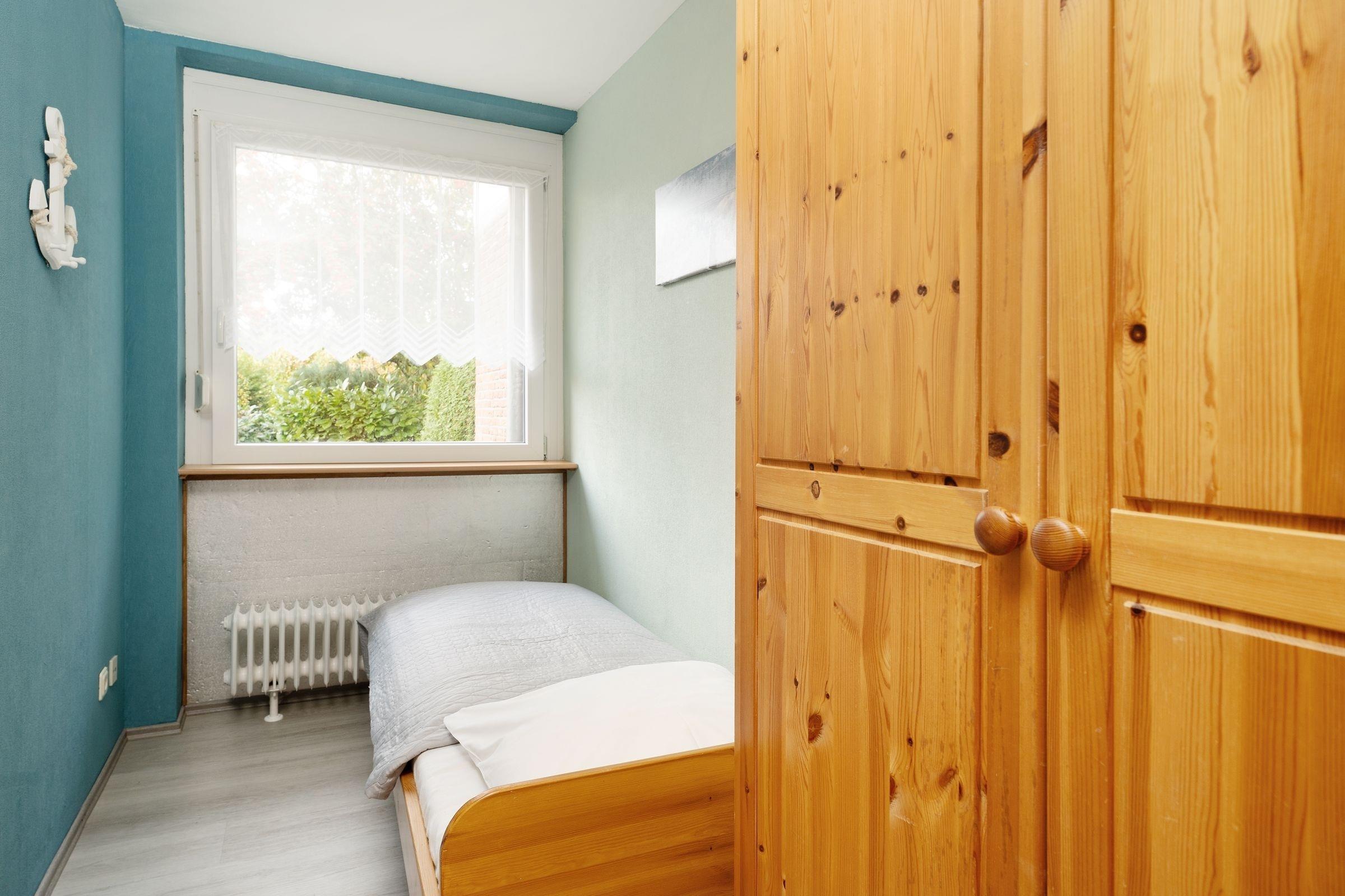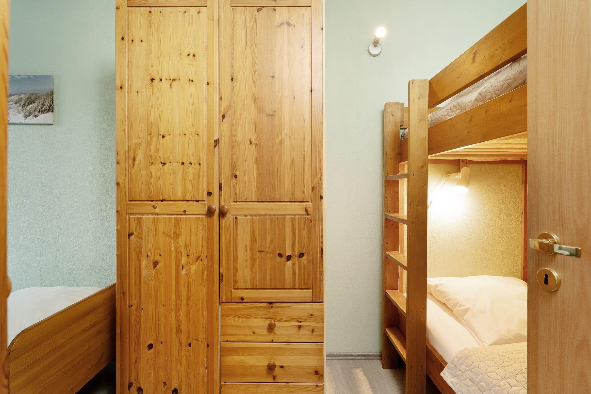Schlafzimmer 2: 1 Etagenbett (2x 90x200 cm), 1 Einzelbett (90x200 cm), Kleiderschrank, Verdunkelung (Jalousie, innen/außen).