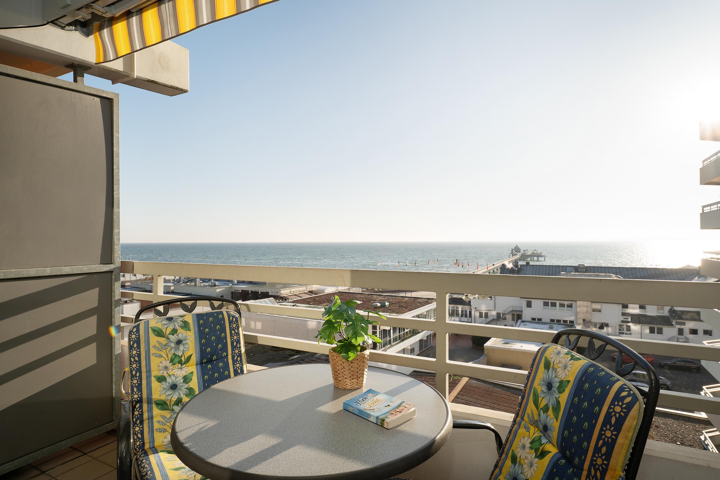 Das ist ein Blick! Die Ostsee liegt Ihnen zu Füßen. Der große, Richtung Seebrücke gerichtete, Balkon mit Gartenmöbeln lädt zum Verweilen in der Sonne ein. Verfolgen Sie die Schiffe am Horizont - Fernglas nicht vergessen!