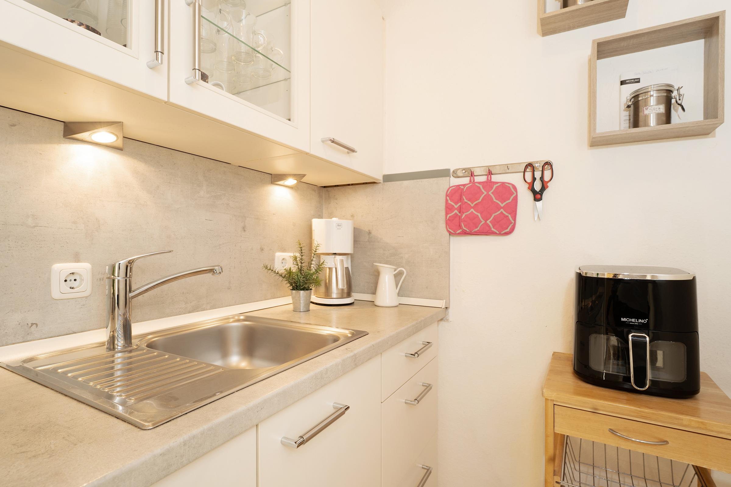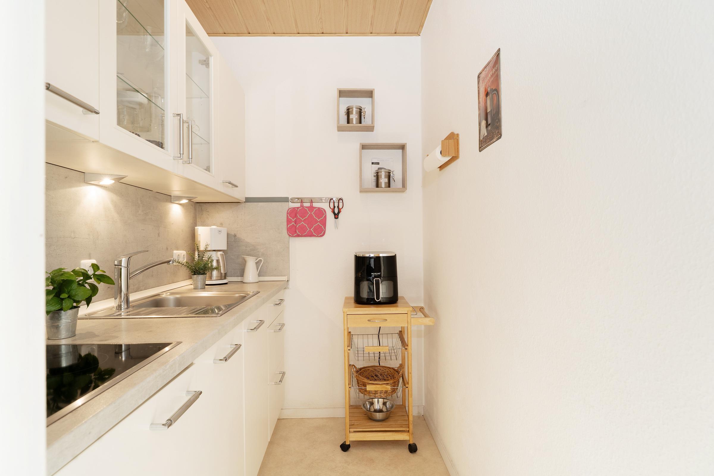 Gute Austattung,eine Microwelle/Backofen fehlt aber. Mit einer dimmbaren Stehlampe im Wohnzimmer wären kuschelige Abende perfekt.