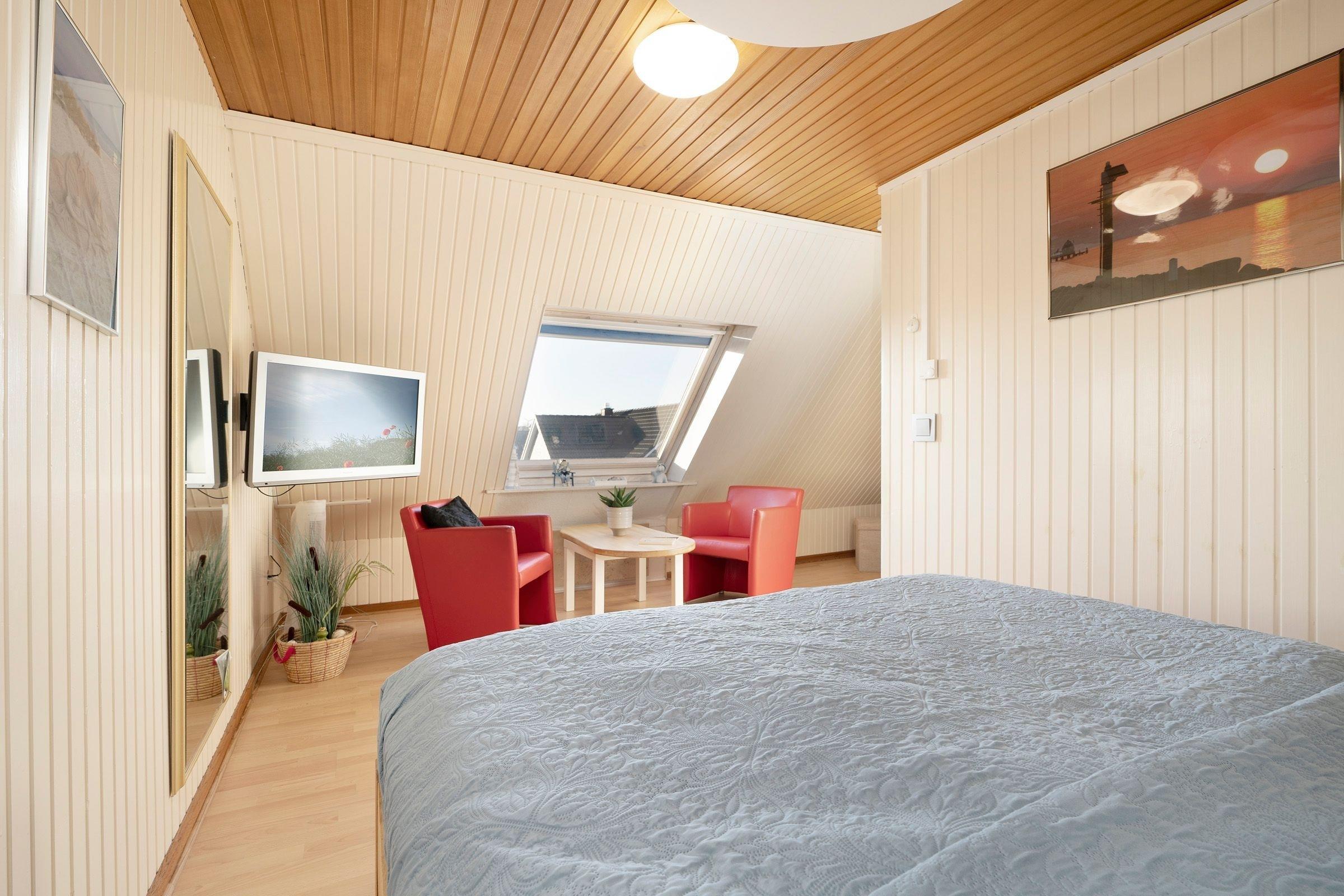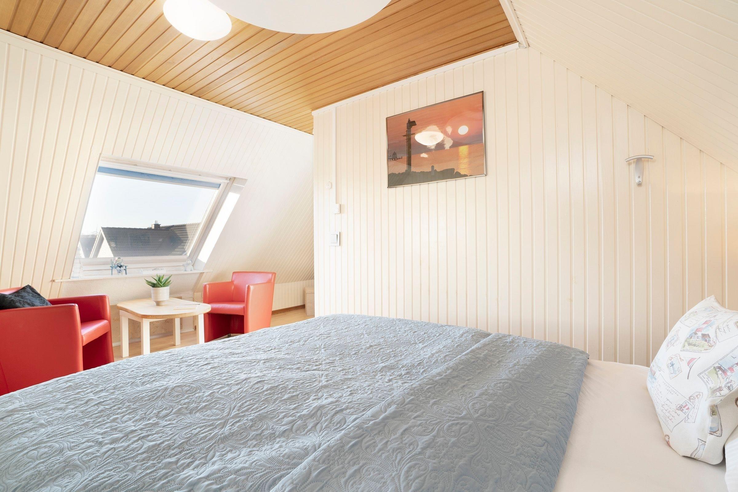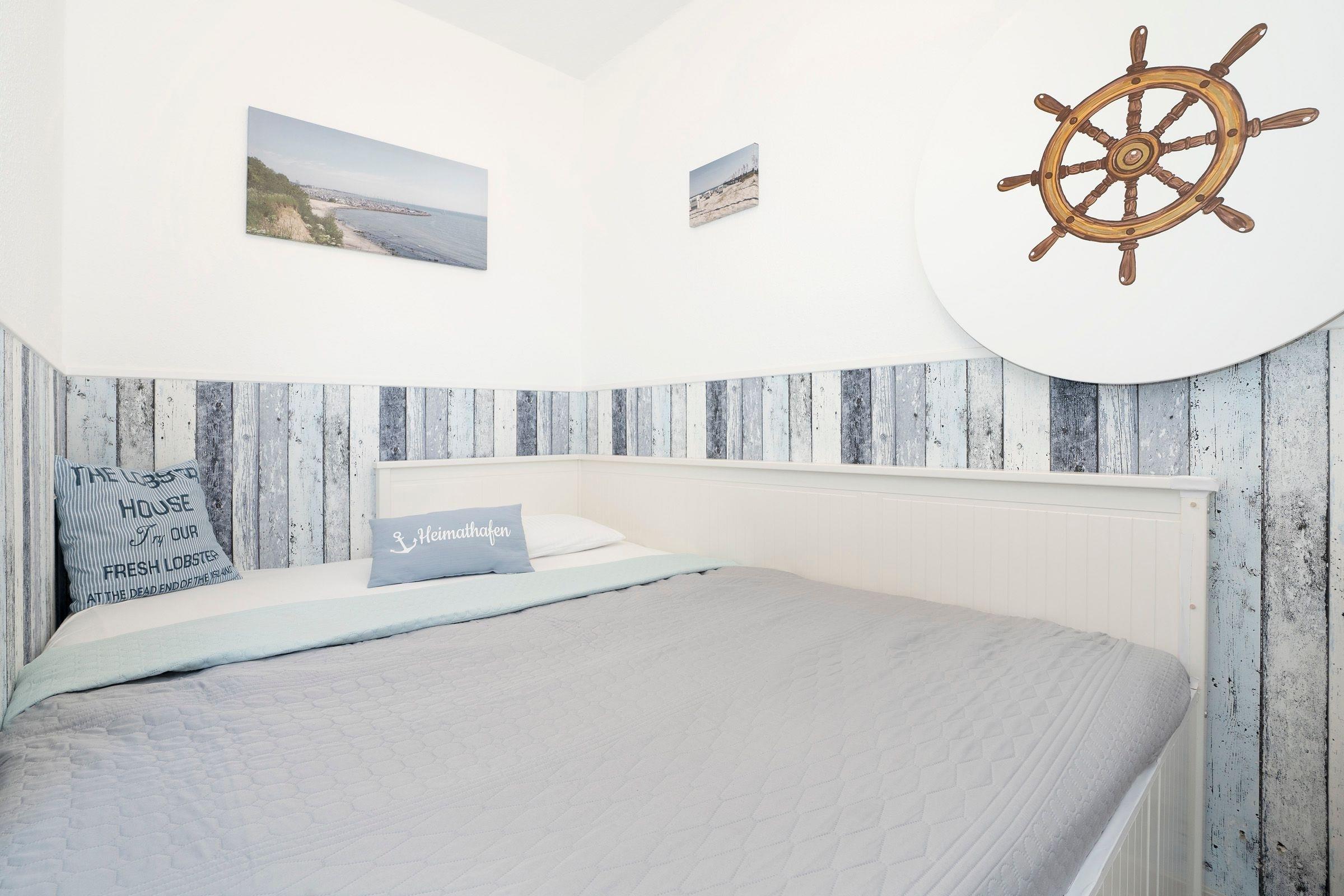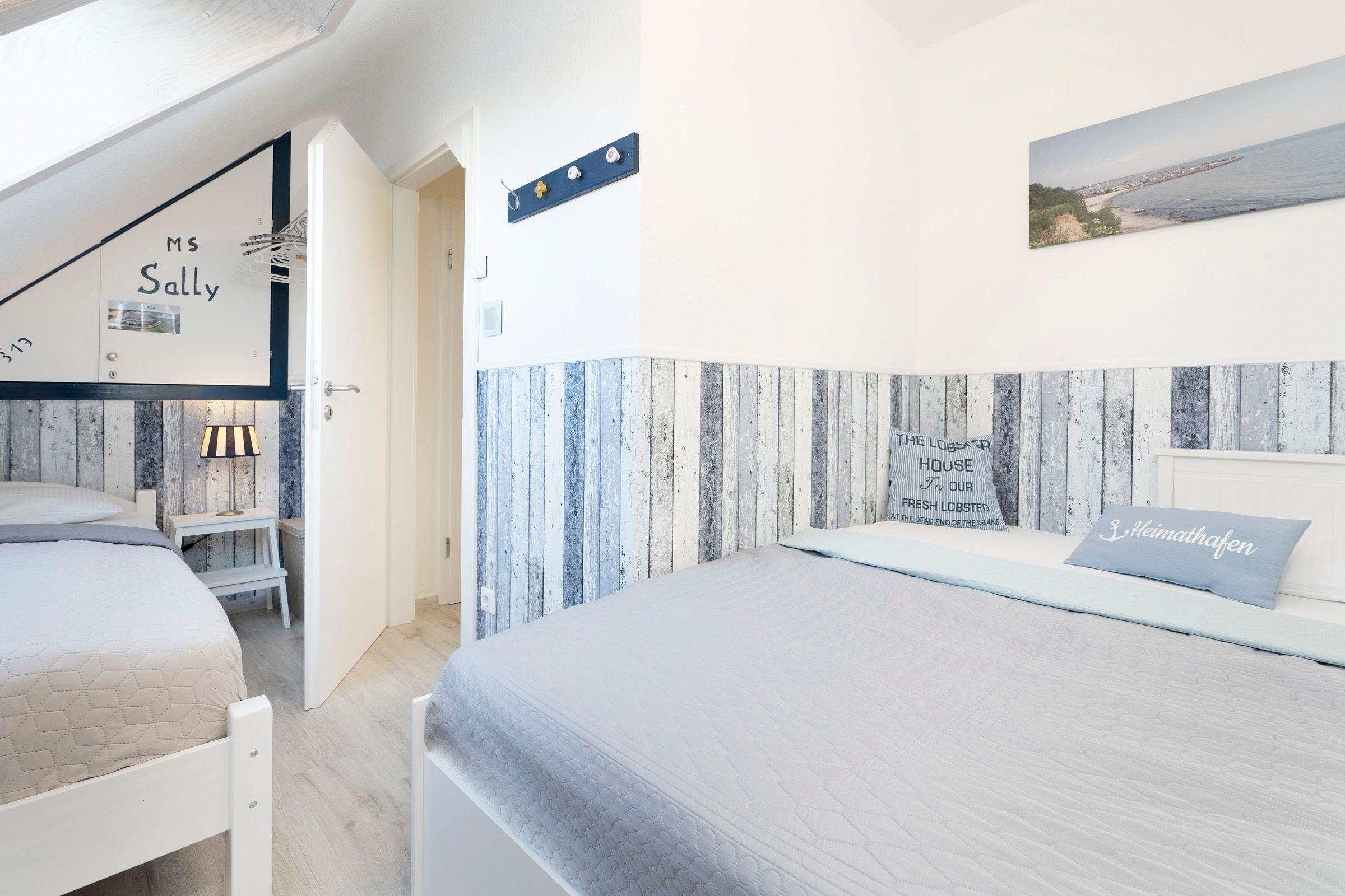 In dieser ersten Etage befindet sich ein nordisch-maritimes Schlafzimmer mit einem gemütlichen Doppelbett (2x80x200cm). Das hell geflieste Wohlfühlbad bietet mit einer geräumigen Dusche, WC, Fön, Waschtisch mit Spiegel und einer praktischen Handtuchheizung alle Annehmlichkeiten.