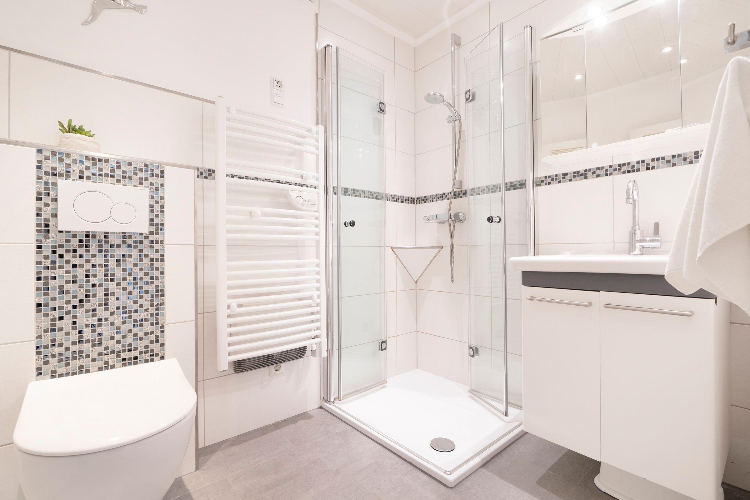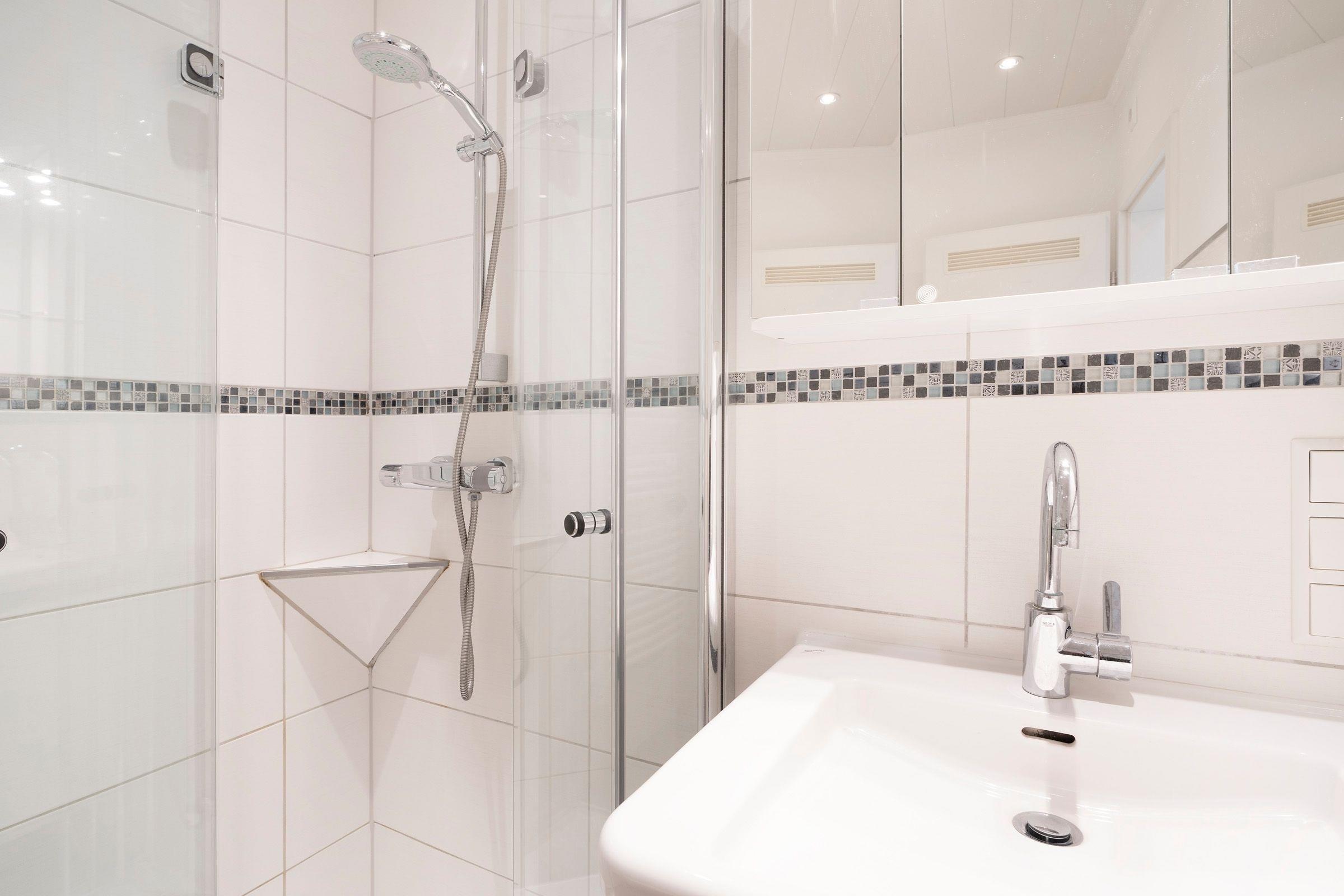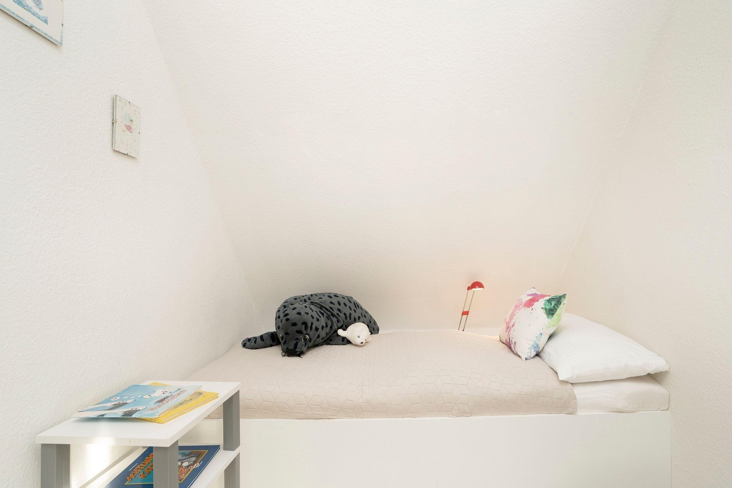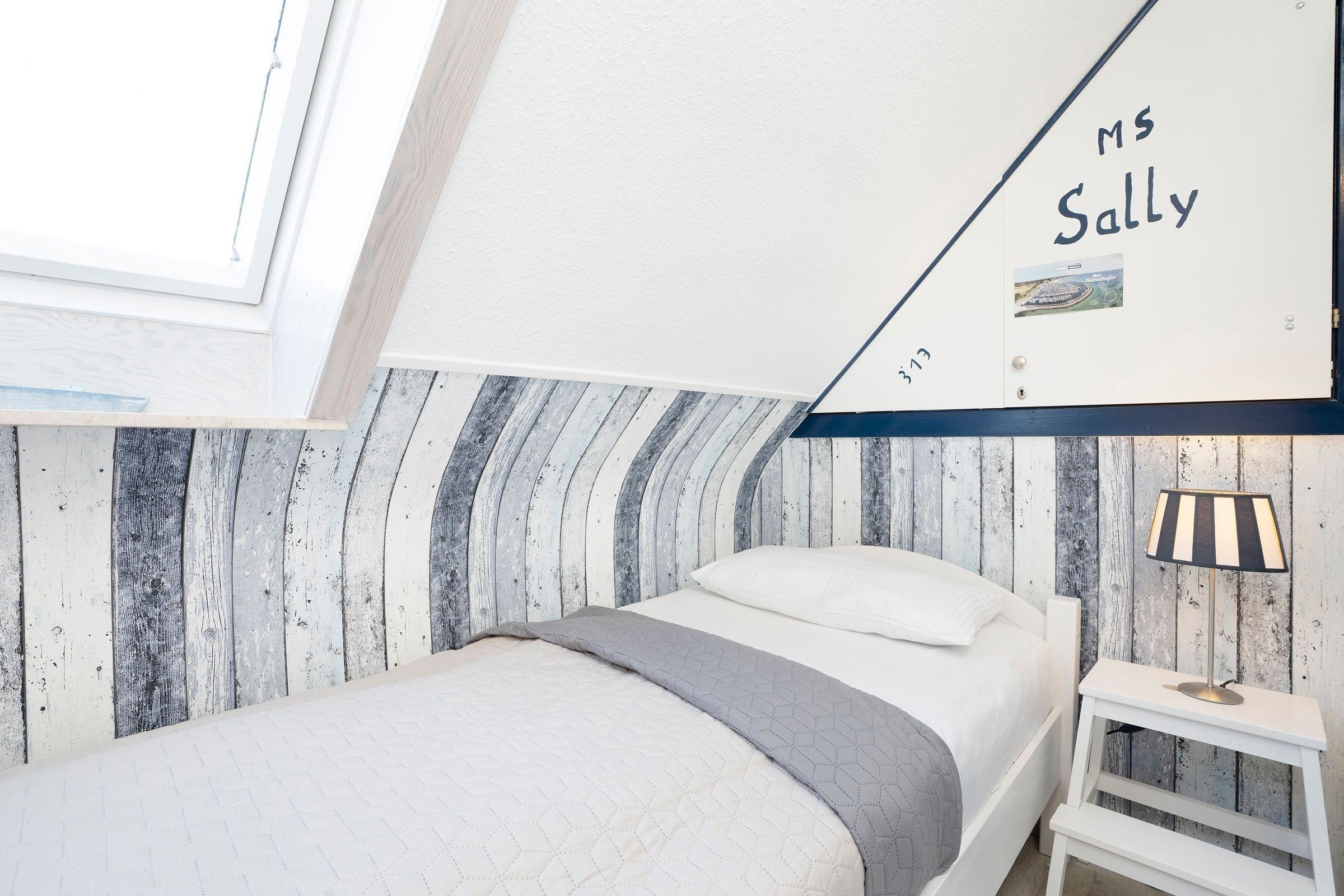 In dieser ersten Etage befindet sich ein nordisch-maritimes Schlafzimmer mit einem gemütlichen Doppelbett (2x80x200cm). Das hell geflieste Wohlfühlbad bietet mit einer geräumigen Dusche, WC, Fön, Waschtisch mit Spiegel und einer praktischen Handtuchheizung alle Annehmlichkeiten.