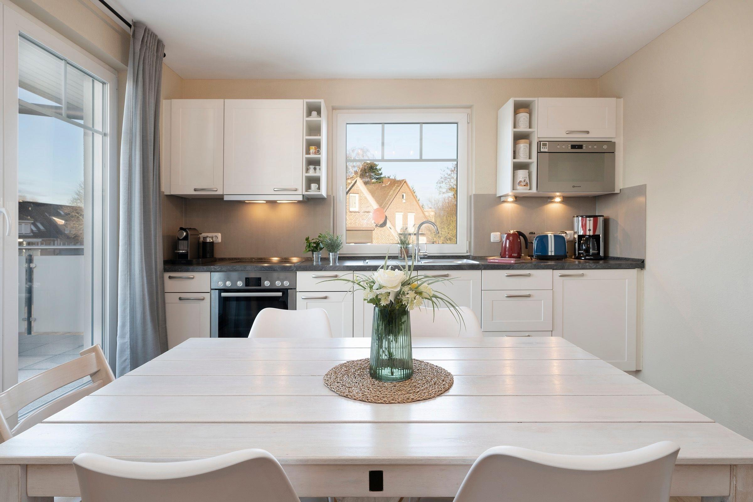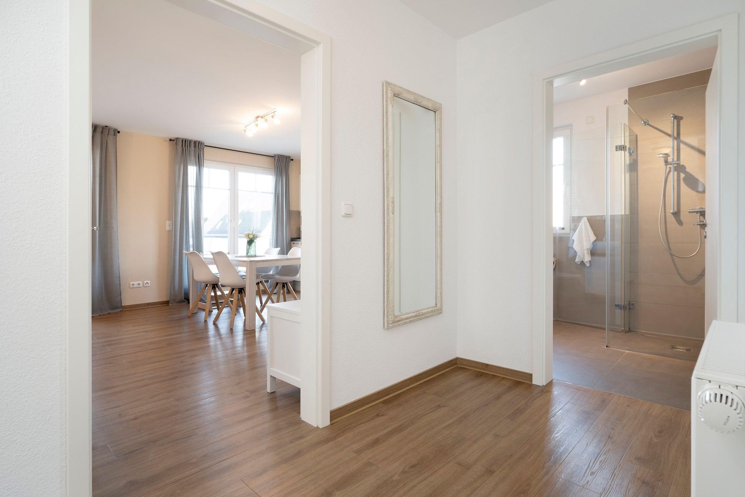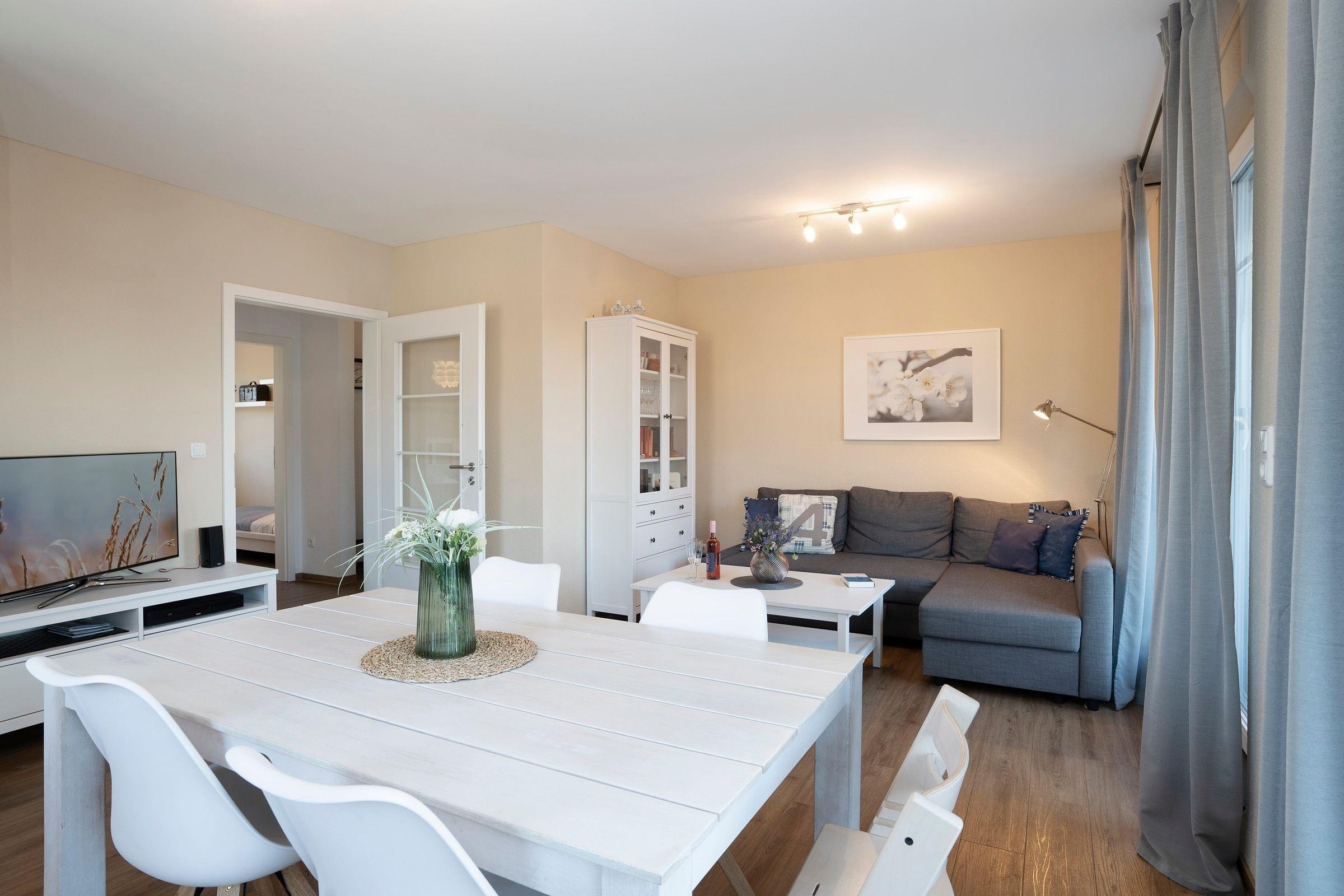 Das gesamte Interieur ist modern, hochwertig und mit Bedacht aufeinander abgestimmt. Maritime Gemütlichkeit trifft auf klare Frische und modernen Landhausstil. Bereits das Entrée Ihres Feriendomizils begrüßt Sie elegant und großzügig, von hier aus geht es in alle weiteren Wohnbereiche. Das Herzstück der Wohnung ist das offen gestaltete Wohn-/Esszimmer mit gemütlicher Sofaecke und Flatscreen-TV, Essplatz für bis zu 4 Personen mit ausreichend Platz für gesellige Runden, sowie clever integrierter Küchenzeile, ausgestattet mit zahlreichen Alltagshelfern wie Spülmaschine, Backofen, Mikrowelle, sowie 4-Platten-Ceranherd. Als weiteres Highlight treten Sie vom Wohnbereich direkt hinaus auf Ihre herrliche Dachterrasse – schön möbliert mit zwei hochwertigen Holzliegen, Sitzbank und Outdoor-Essplatz für bis zu 4 Personen.