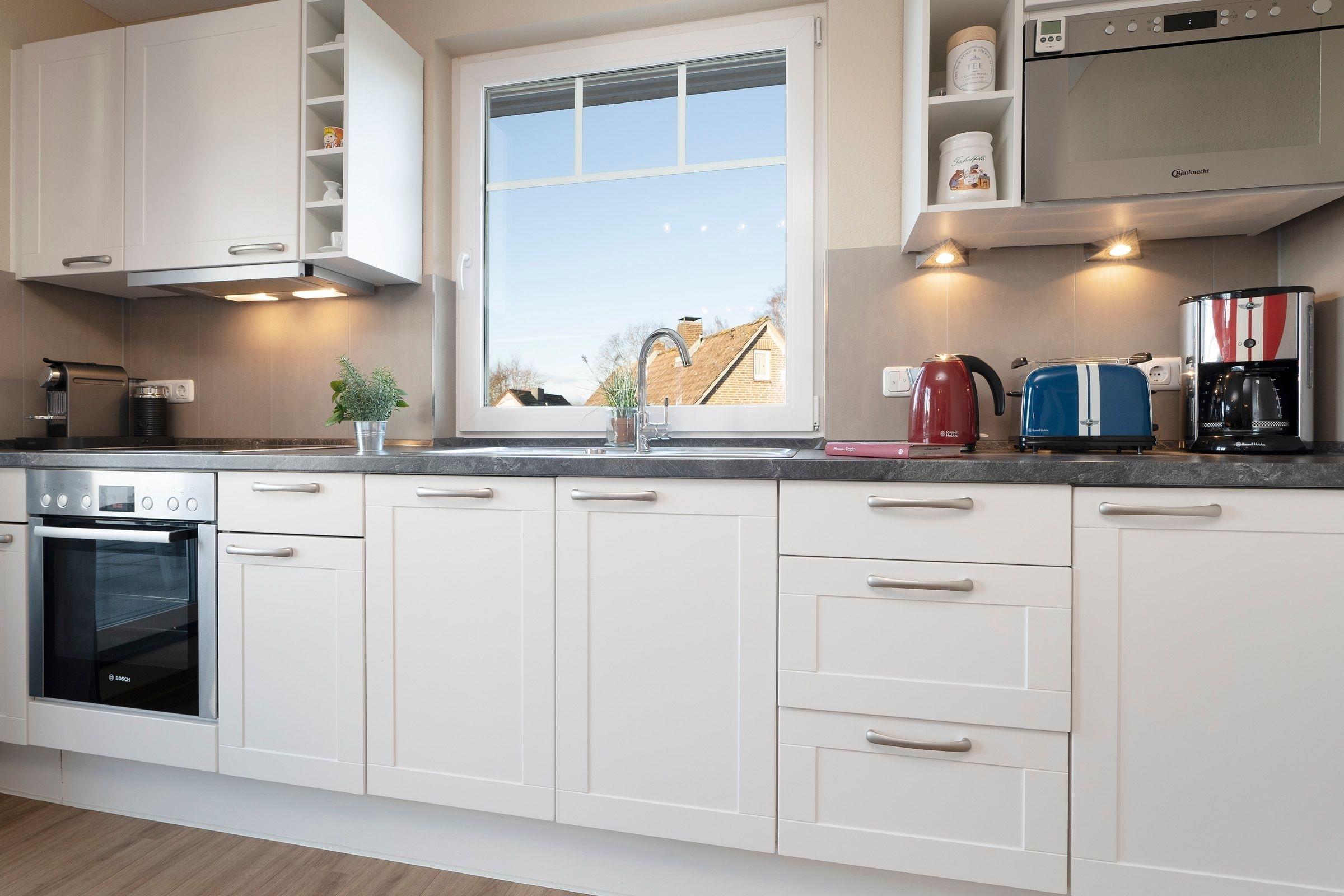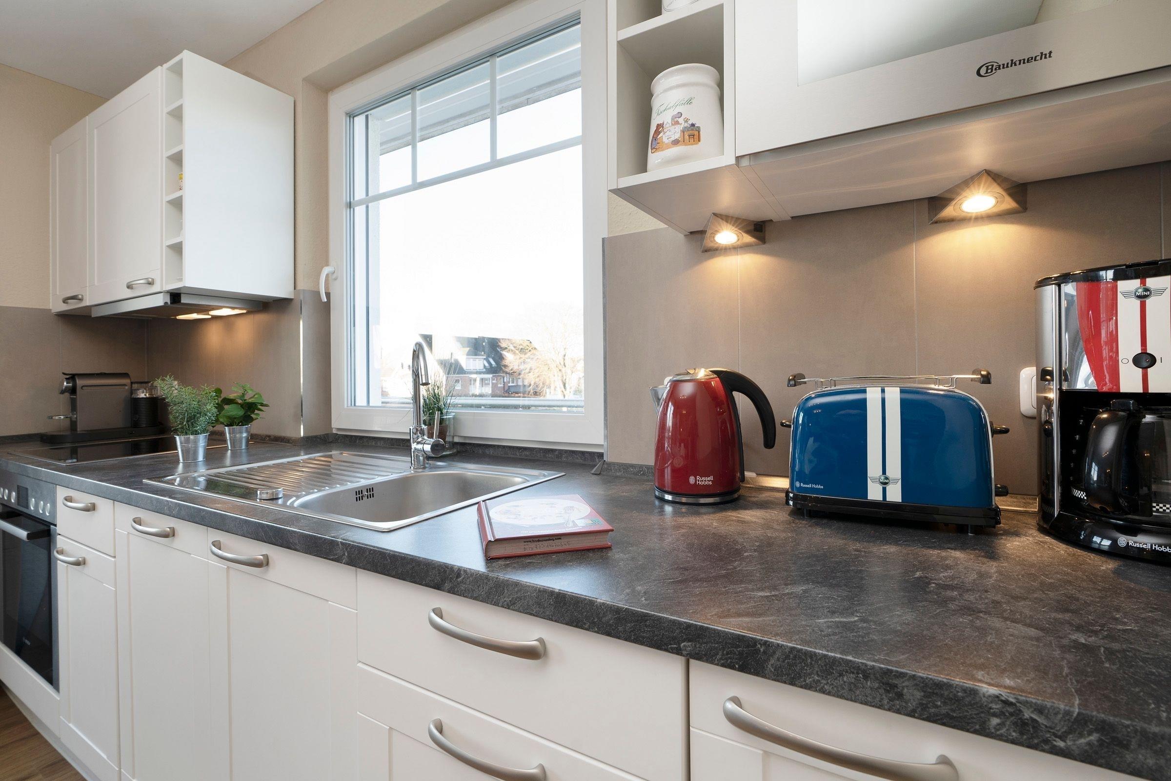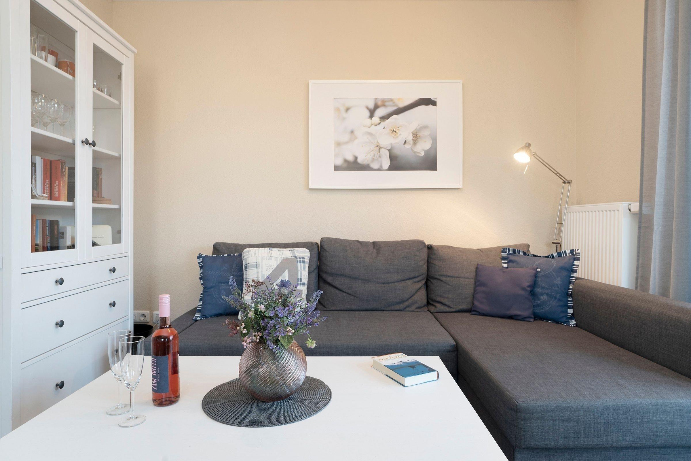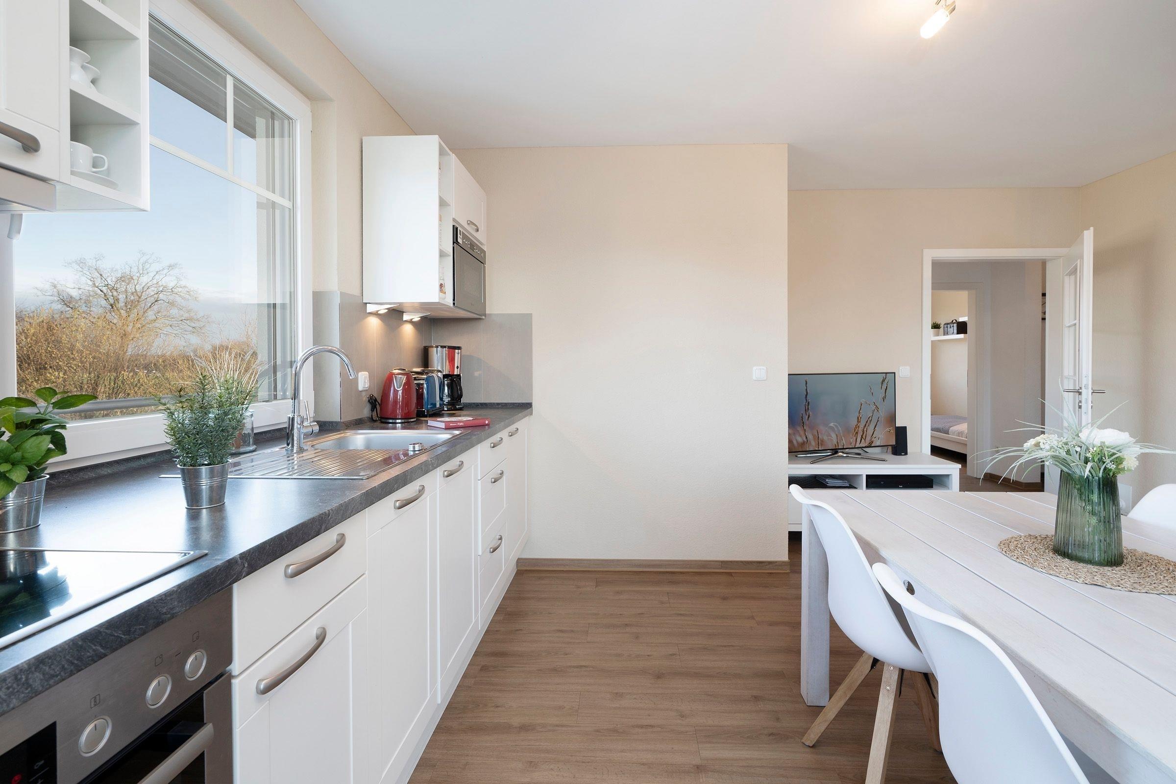 Das gesamte Interieur ist modern, hochwertig und mit Bedacht aufeinander abgestimmt. Maritime Gemütlichkeit trifft auf klare Frische und modernen Landhausstil. Bereits das Entrée Ihres Feriendomizils begrüßt Sie elegant und großzügig, von hier aus geht es in alle weiteren Wohnbereiche. Das Herzstück der Wohnung ist das offen gestaltete Wohn-/Esszimmer mit gemütlicher Sofaecke und Flatscreen-TV, Essplatz für bis zu 4 Personen mit ausreichend Platz für gesellige Runden, sowie clever integrierter Küchenzeile, ausgestattet mit zahlreichen Alltagshelfern wie Spülmaschine, Backofen, Mikrowelle, sowie 4-Platten-Ceranherd. Als weiteres Highlight treten Sie vom Wohnbereich direkt hinaus auf Ihre herrliche Dachterrasse – schön möbliert mit zwei hochwertigen Holzliegen, Sitzbank und Outdoor-Essplatz für bis zu 4 Personen.