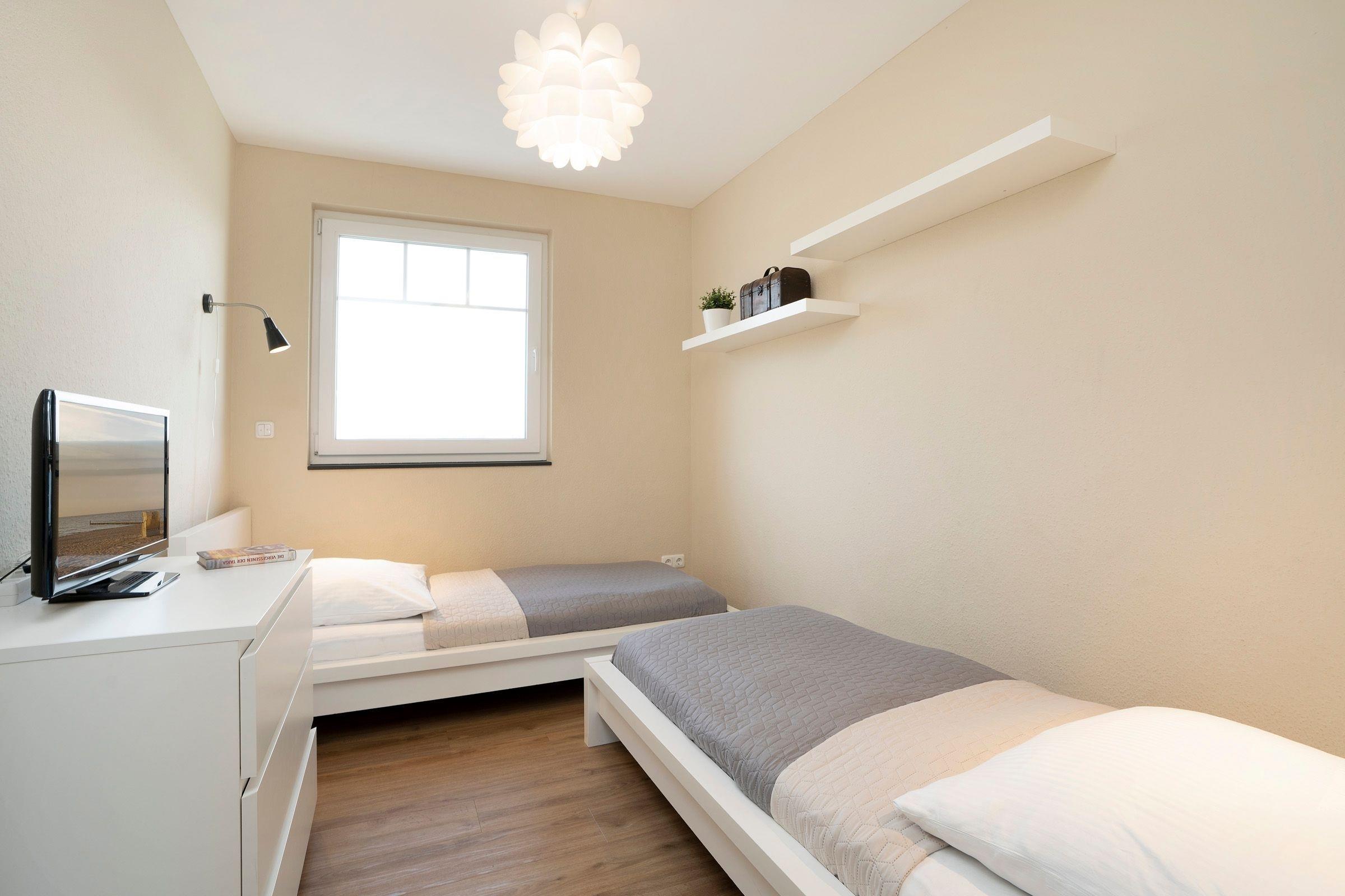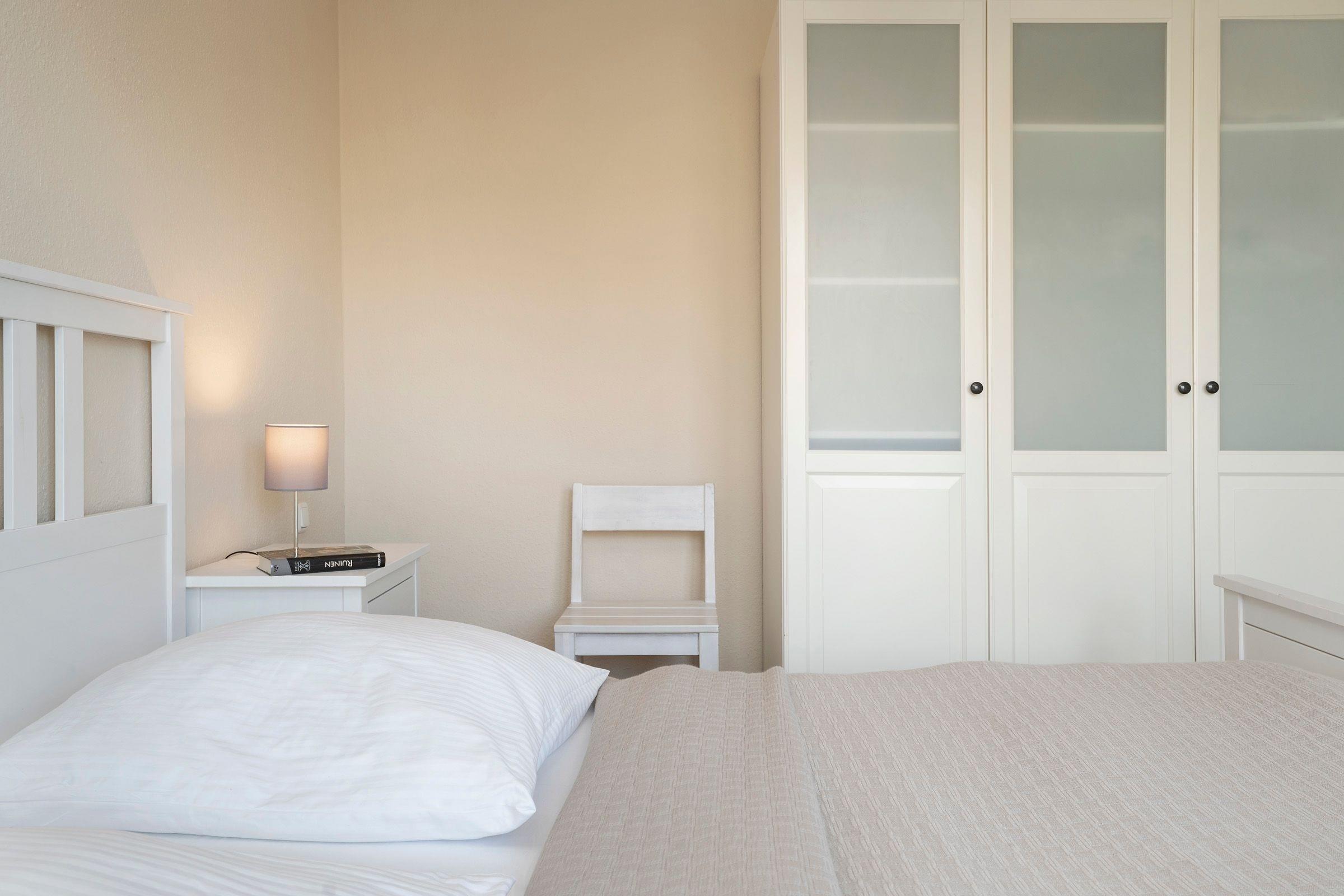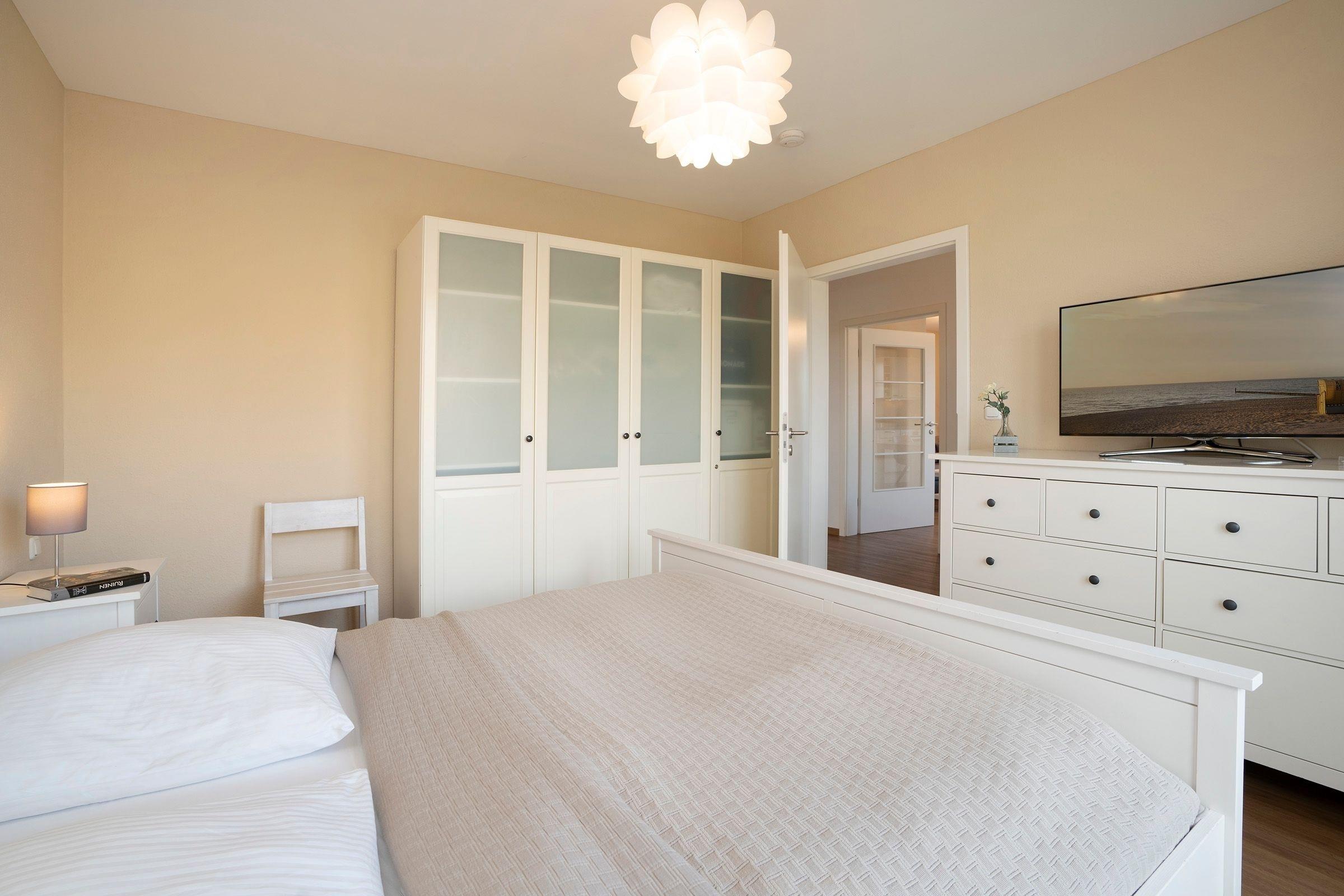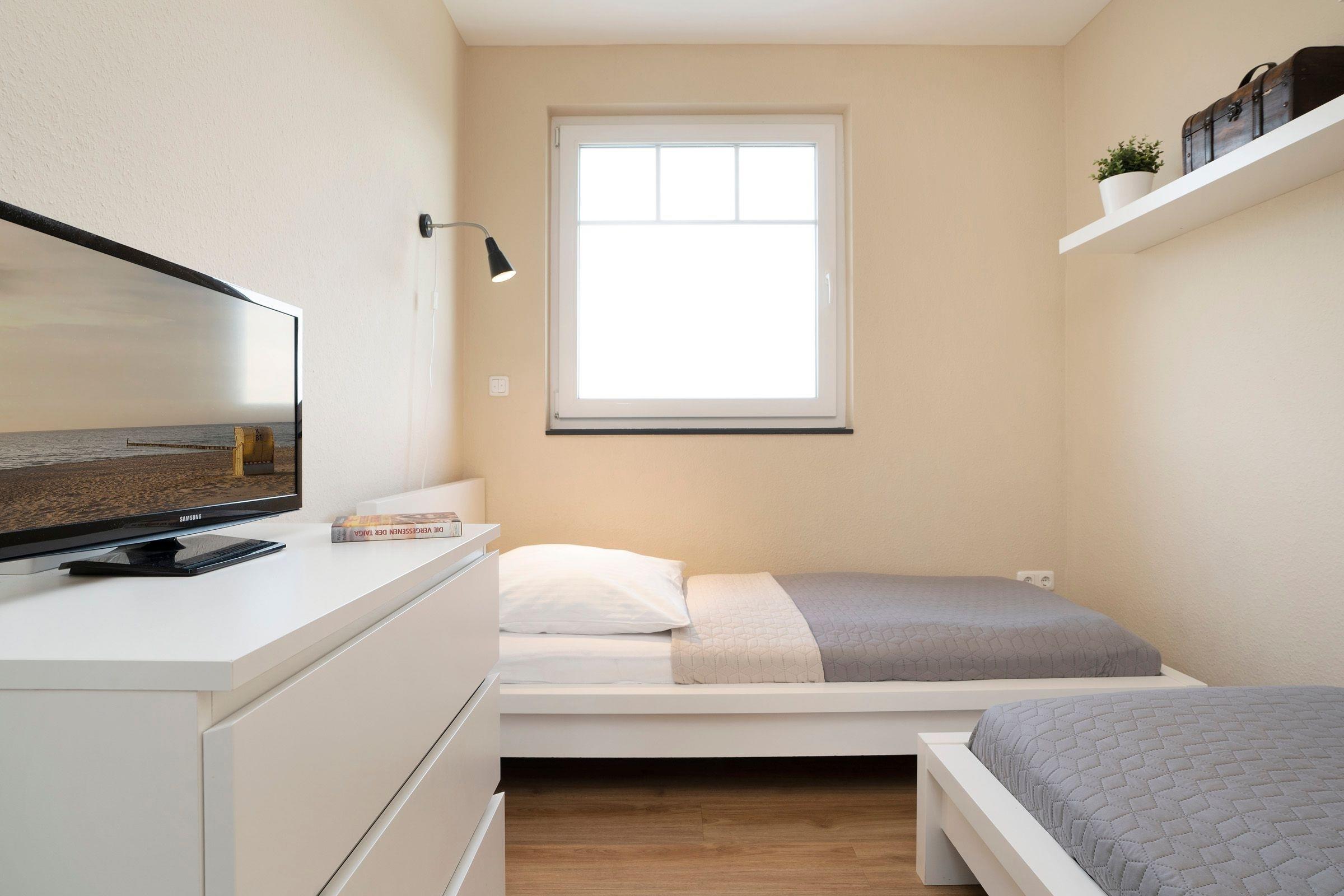 Ein Schlafzimmer ist mit Doppelbett (2x 90x200 cm) Kleiderschrank und Flatscreen-TV ausgestattet, ein zweites Schlafzimmer umfasst zwei Einzelbetten (2x 90x200 cm), Kommode und einen weiteren Flatscreen-TV.