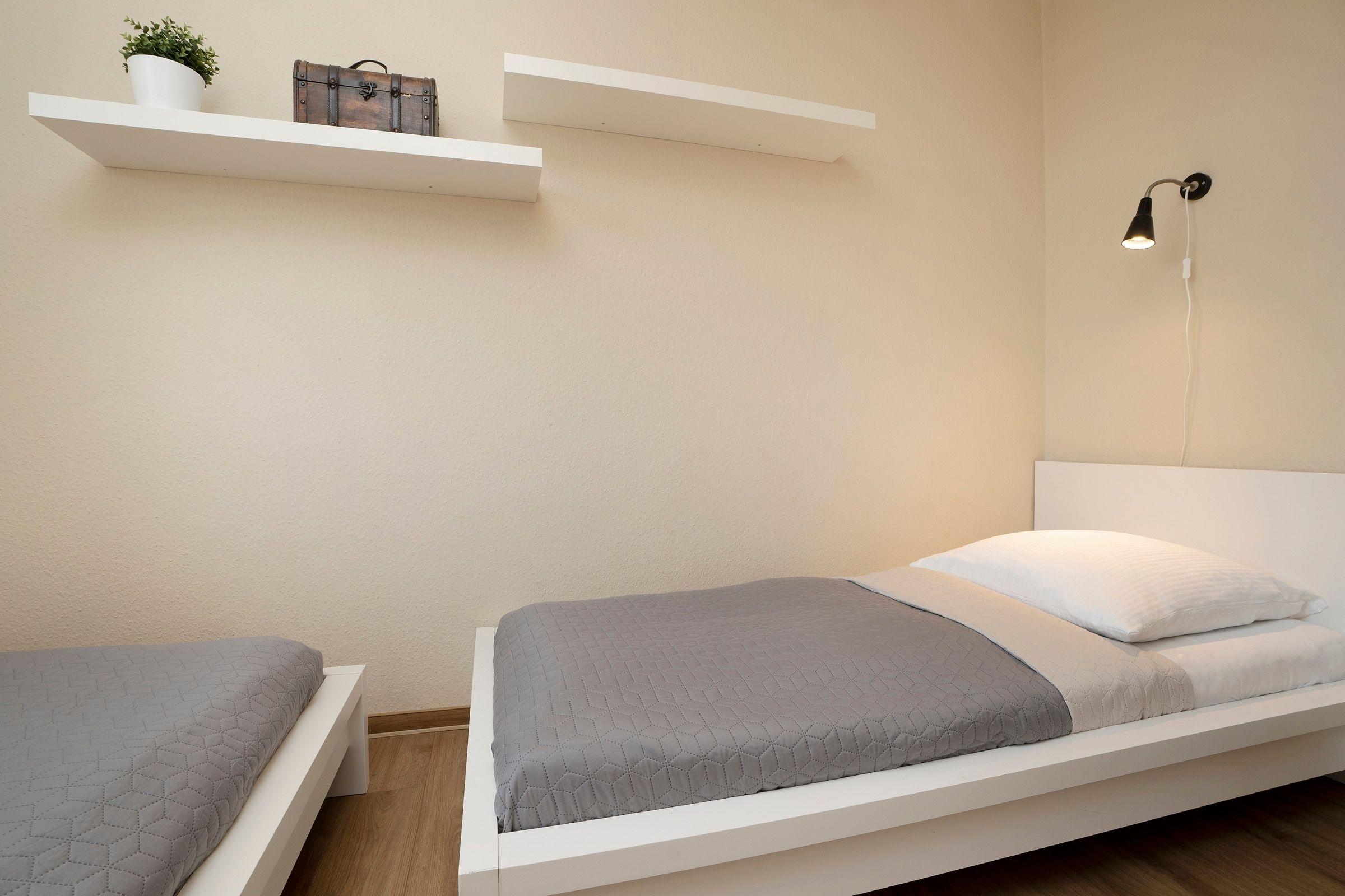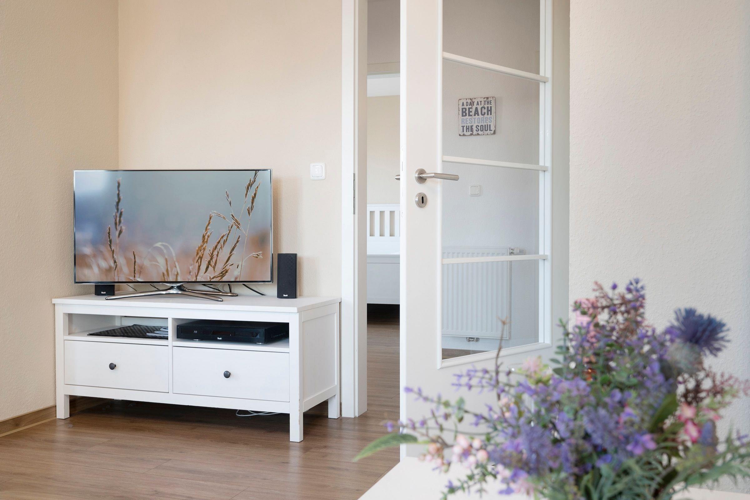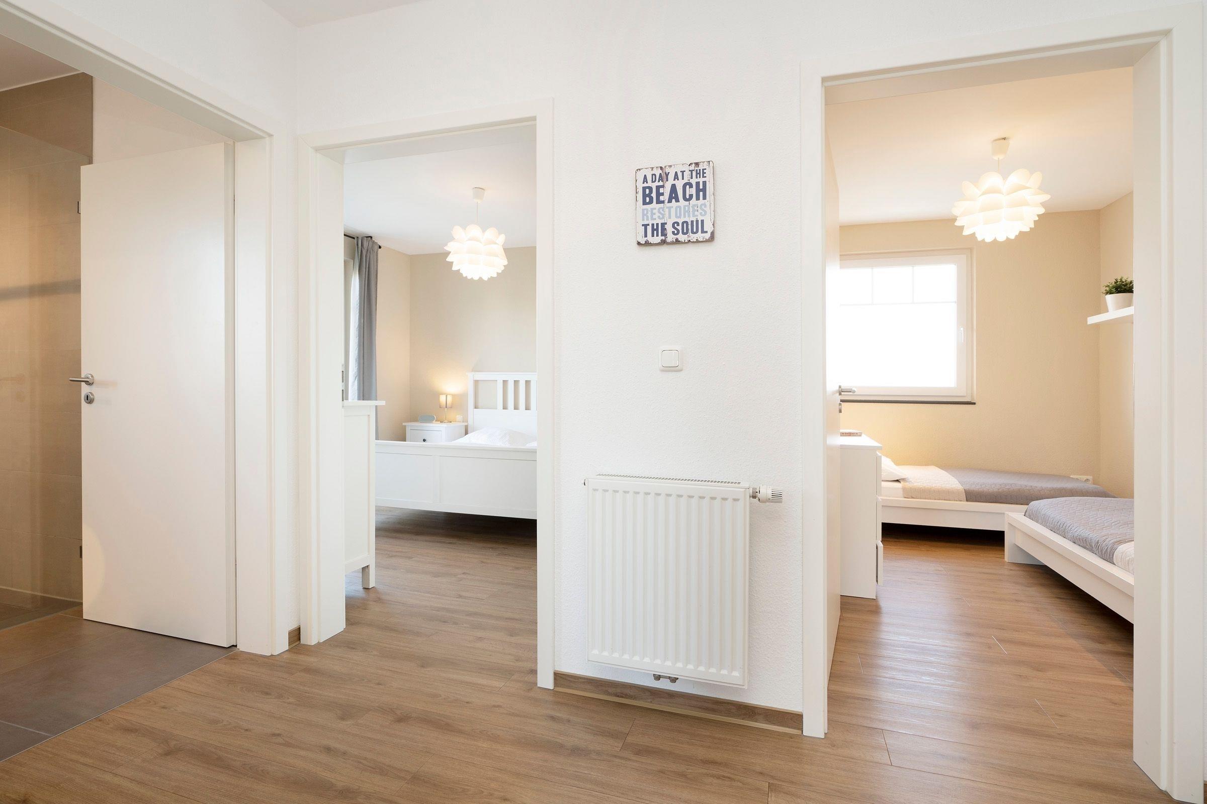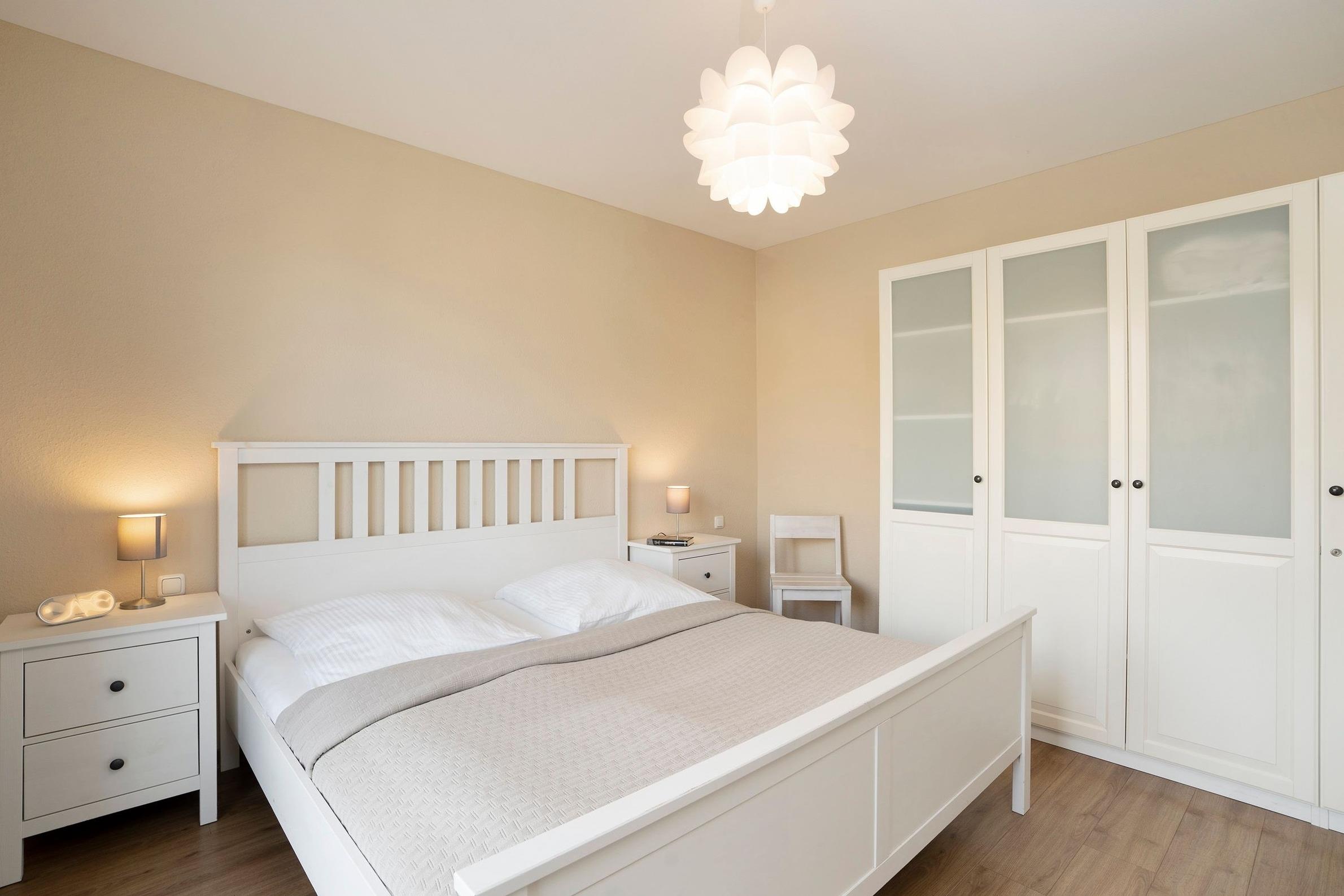 Ein Schlafzimmer ist mit Doppelbett (2x 90x200 cm) Kleiderschrank und Flatscreen-TV ausgestattet, ein zweites Schlafzimmer umfasst zwei Einzelbetten (2x 90x200 cm), Kommode und einen weiteren Flatscreen-TV.