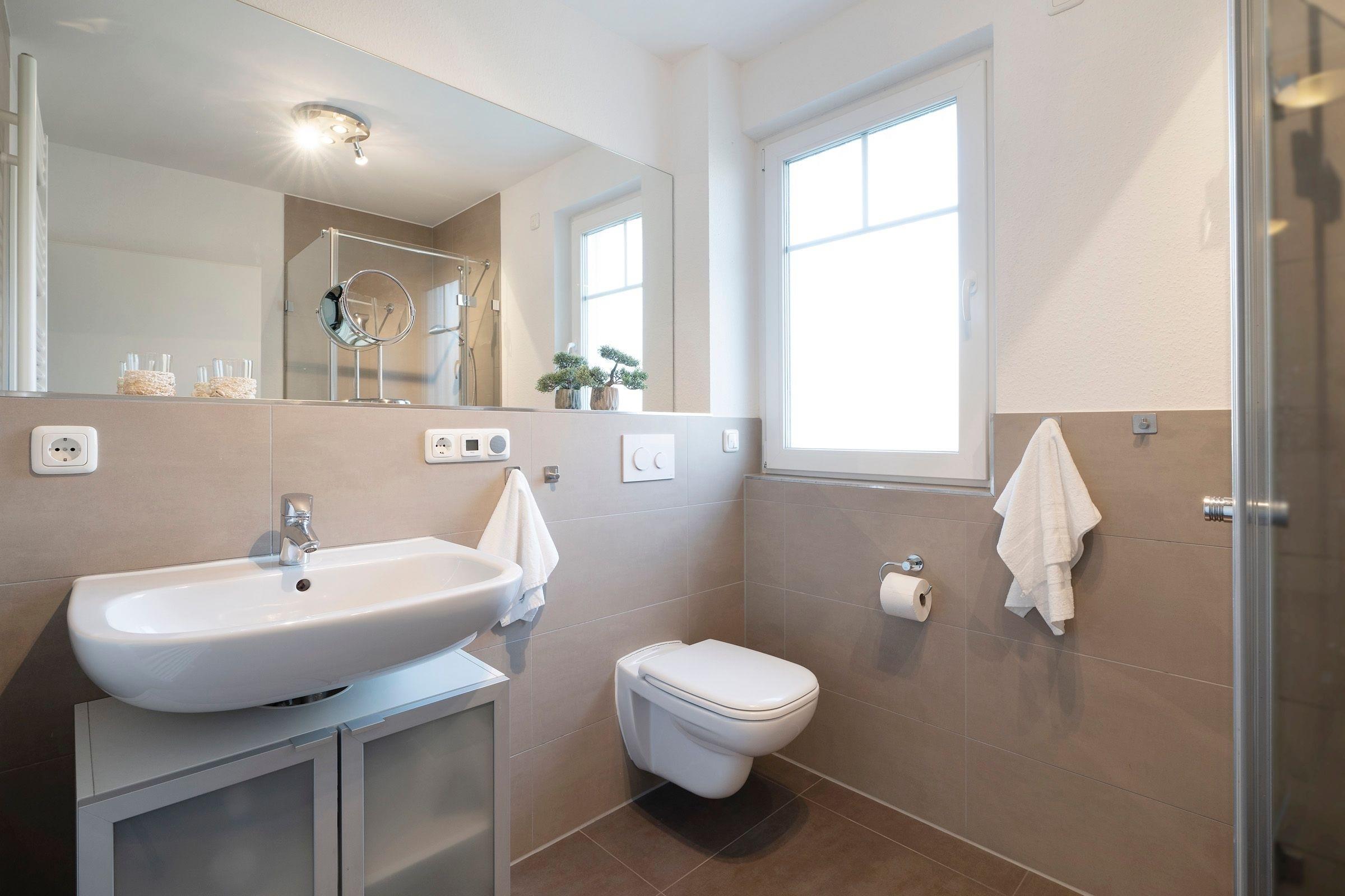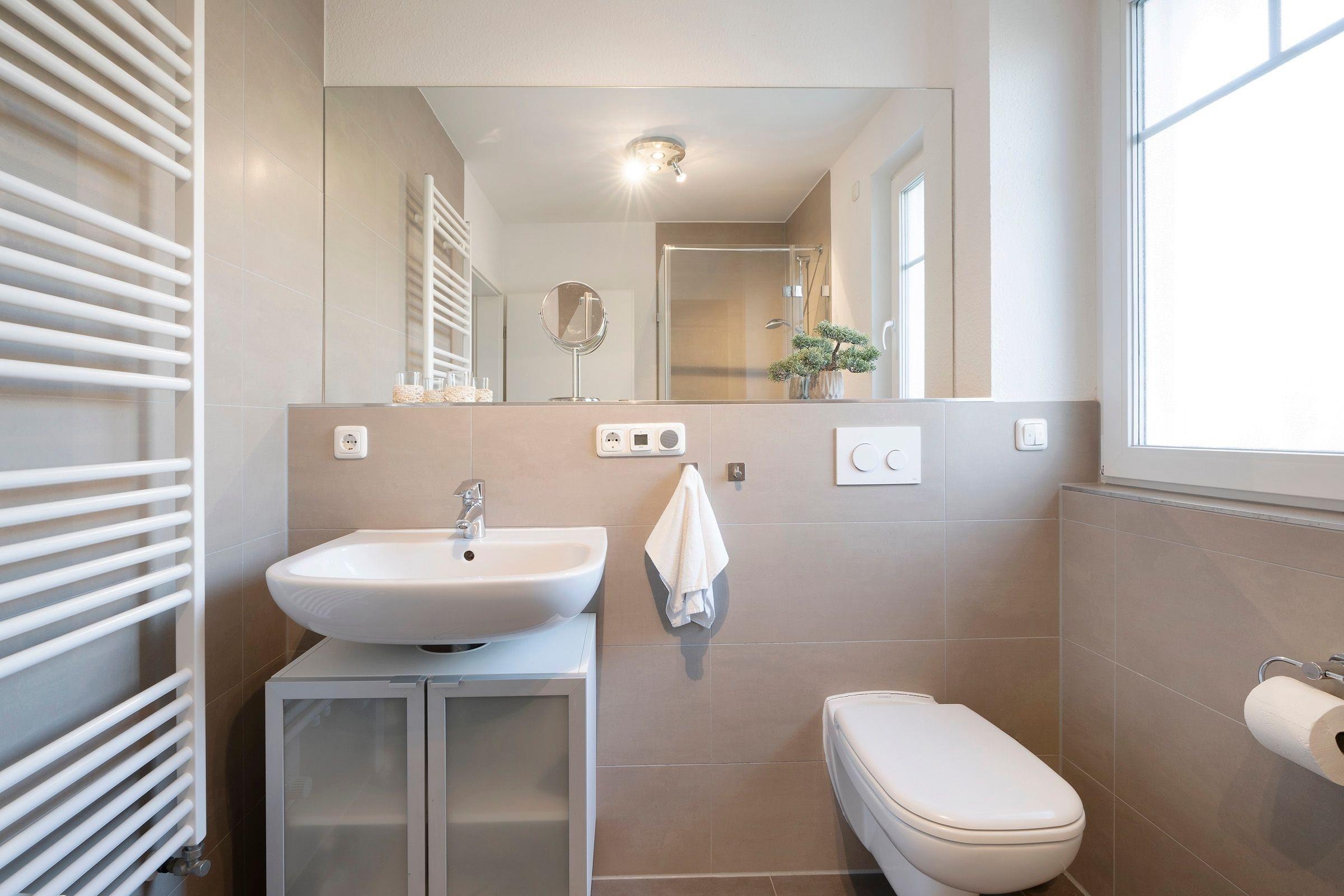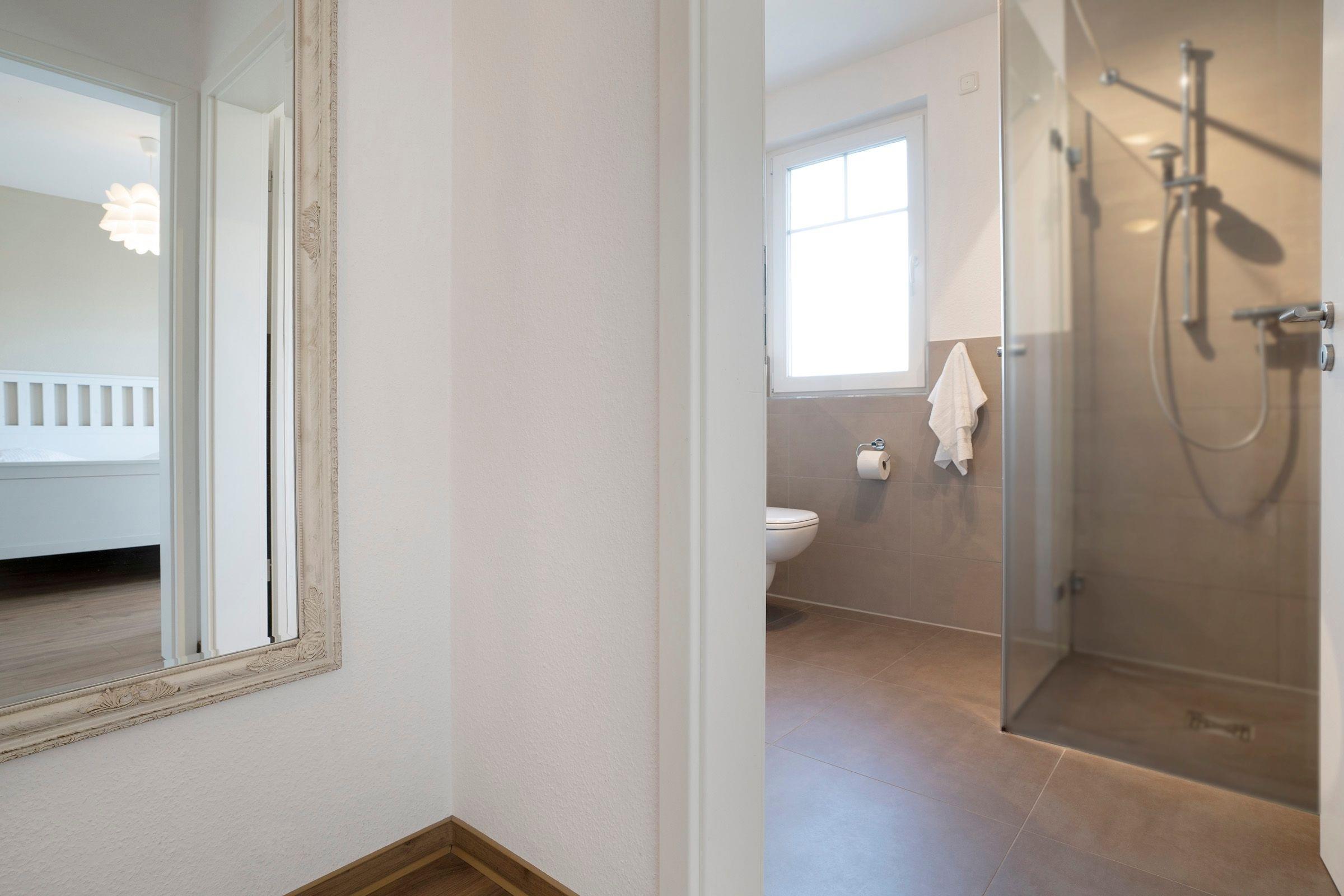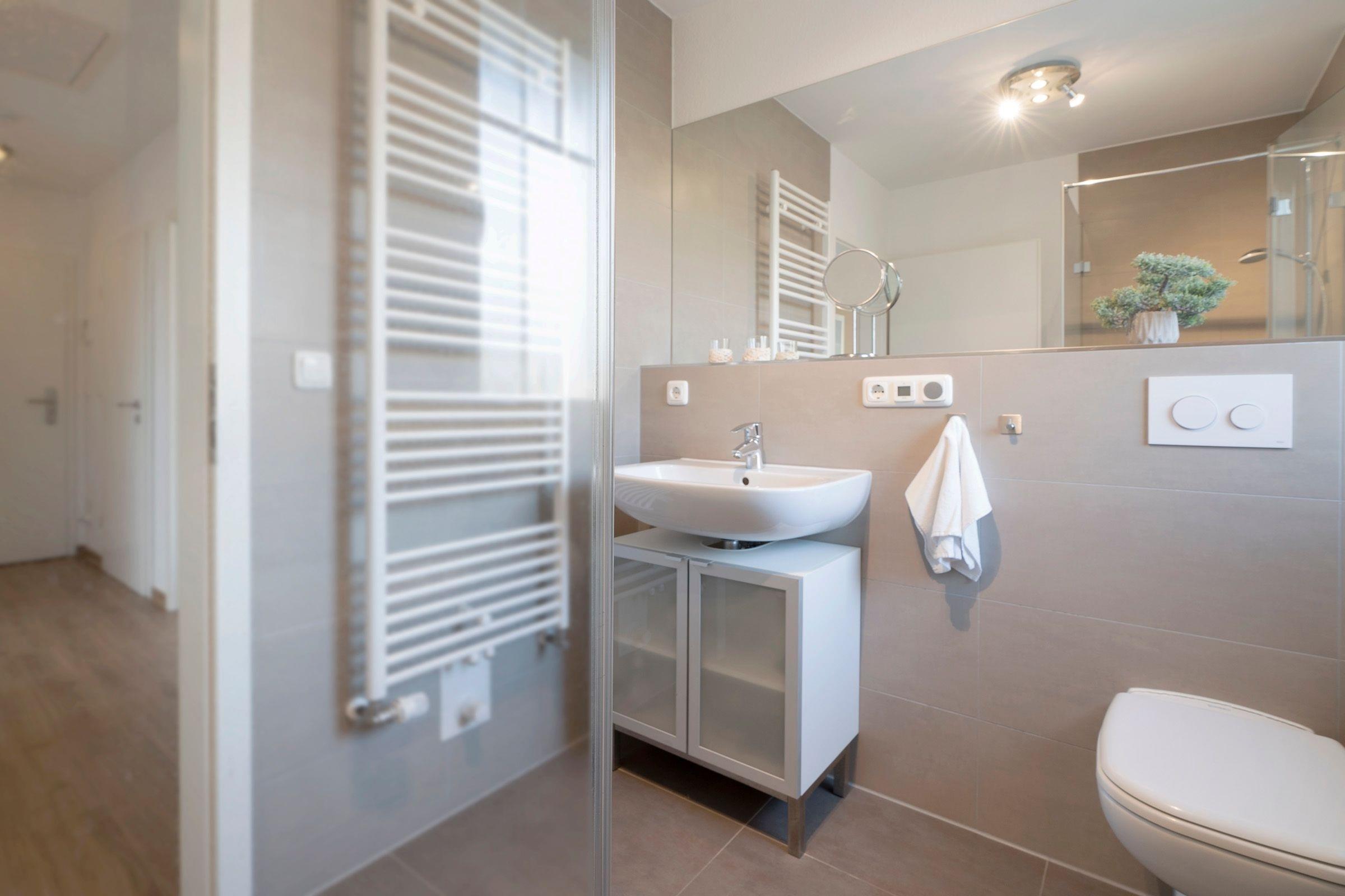 Das tageslichthelle und großzügige Designbad begeistert mit geräumiger bodentiefer Dusche, Schminkspiegel und Handtuchheizung.