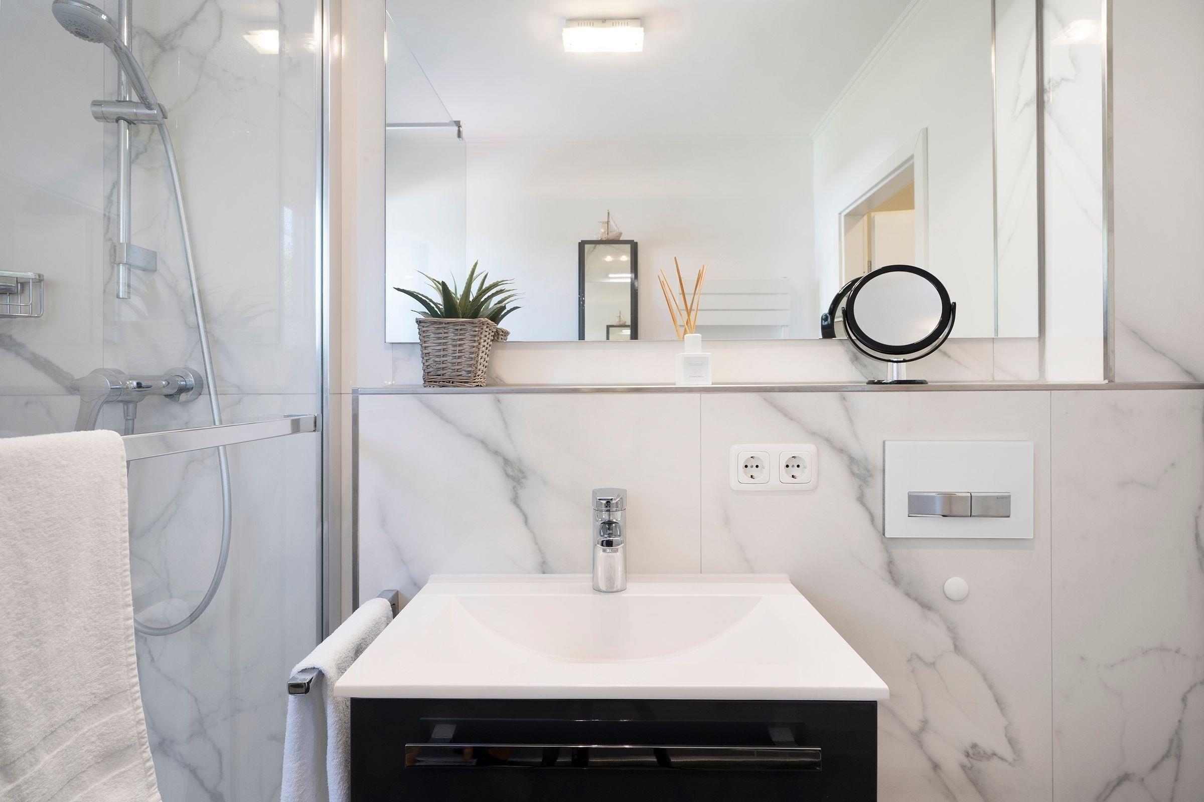 Das modern und ansprechend eingerichtete Wohnzimmer mit einem Essplatz für 2 Personen am Fenster und einer bequemen Eckcouch lädt zum Verweilen ein. Das Schlafzimmer ist mit einem Doppelbett (2x 80x200cm) ausgestattet. Der Fußboden der Wohnung ist mit Parkett ausgelegt. Das exklusive hochwertige Badezimmer in Marmoroptik ist mit einer Walk in Dusche, einem Waschtisch, einem Kosmetikspiegel und Fön und einem Handtuchheizkörper ausgestattet.
