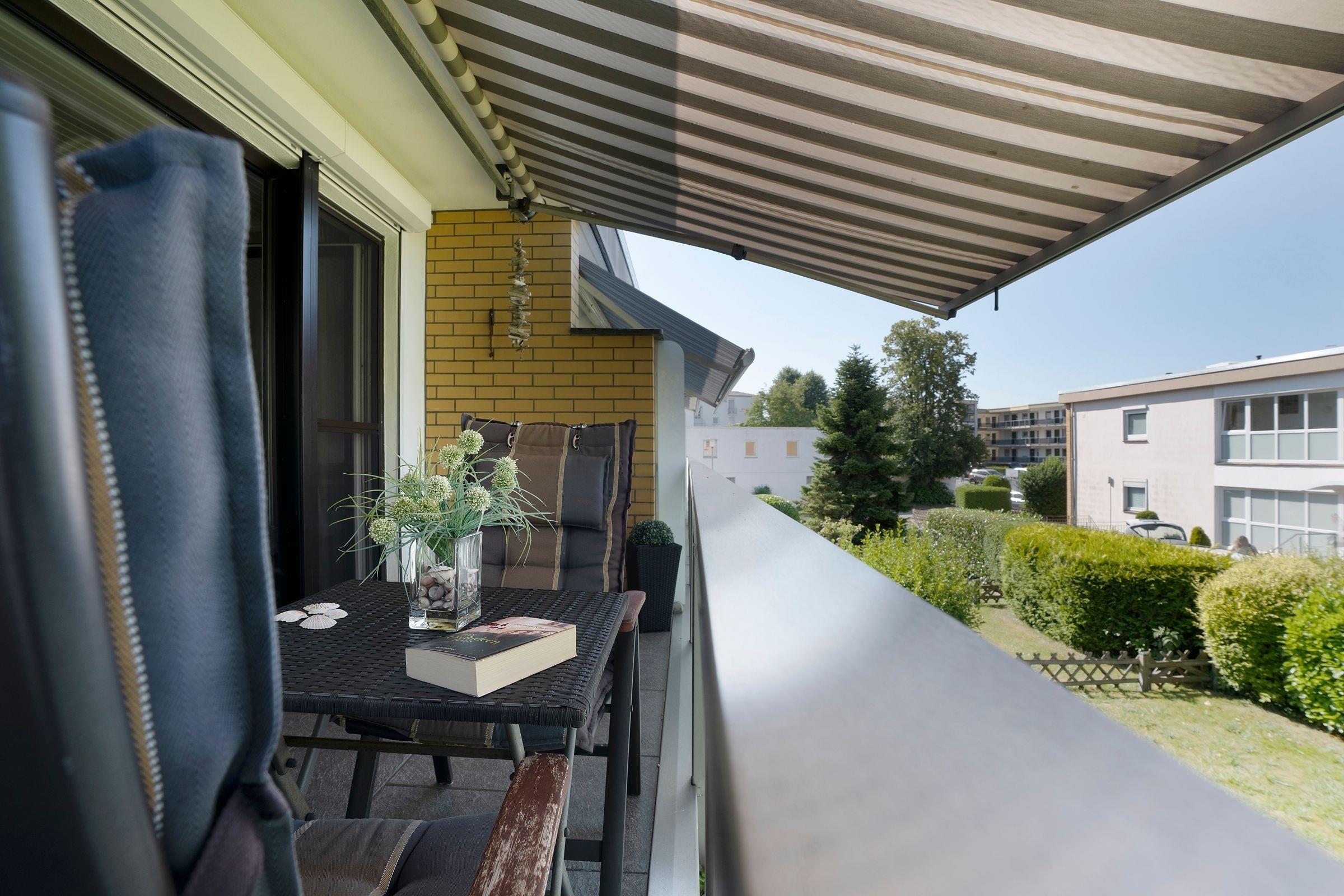 Vom Balkon aus haben Sie einen herrlichen Blick in den schönen Garten. Hier können Sie bis in die Abendstunden hinein auf den Balkonmöbeln die Sonne genießen. Der Balkon ist mit einer Markise und Aussenjalousien ausgestattet.