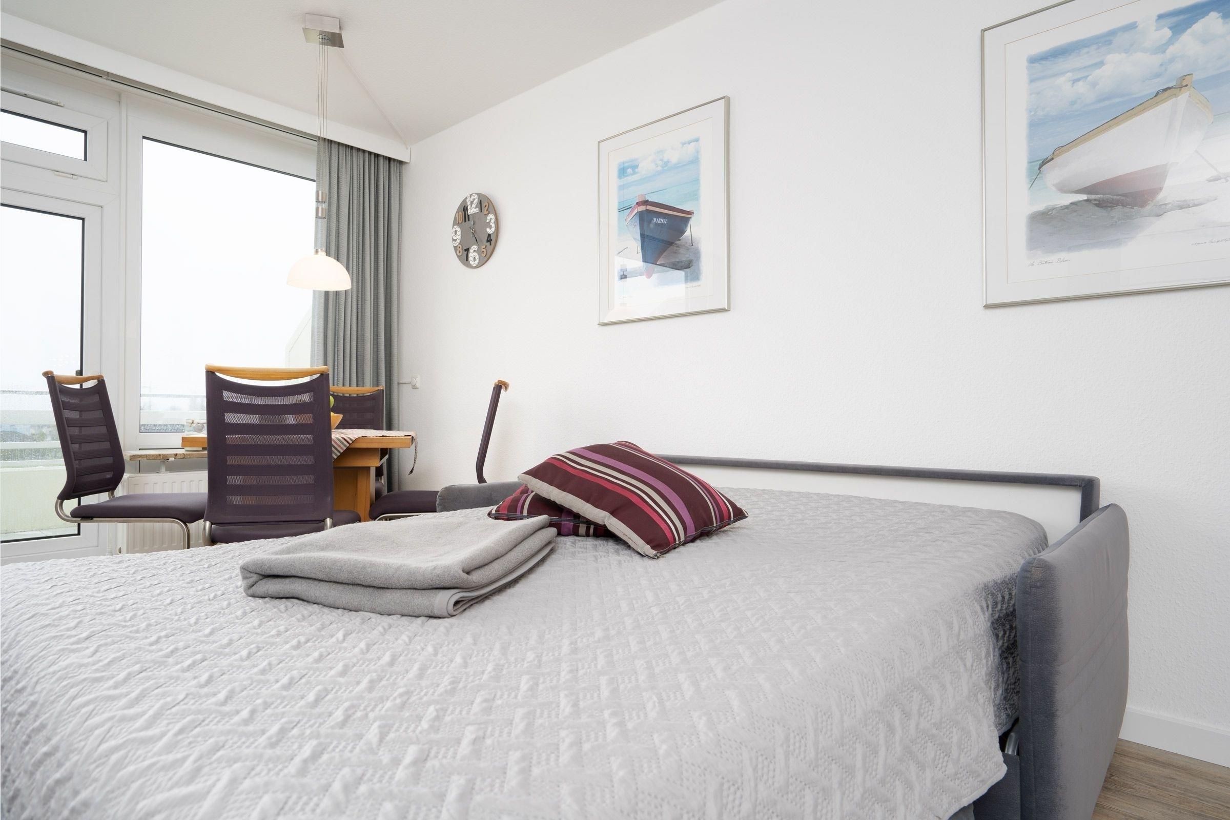 Ein geschmackvoll und gemütlich eingerichtetes Wohn-/ Esszimmer mit komfortabler Schlafcouch (in Komforthöhe, Liegefläche ca. 140x195 cm) und direktem Zugang auf den Balkon. Genießen Sie einen wunderbaren Ausblick vom möblierten und geschützten Balkon, eine ausfahrbare Markise schützt an sonnigen Tagen vor zu starker Sonneneinstrahlung.
