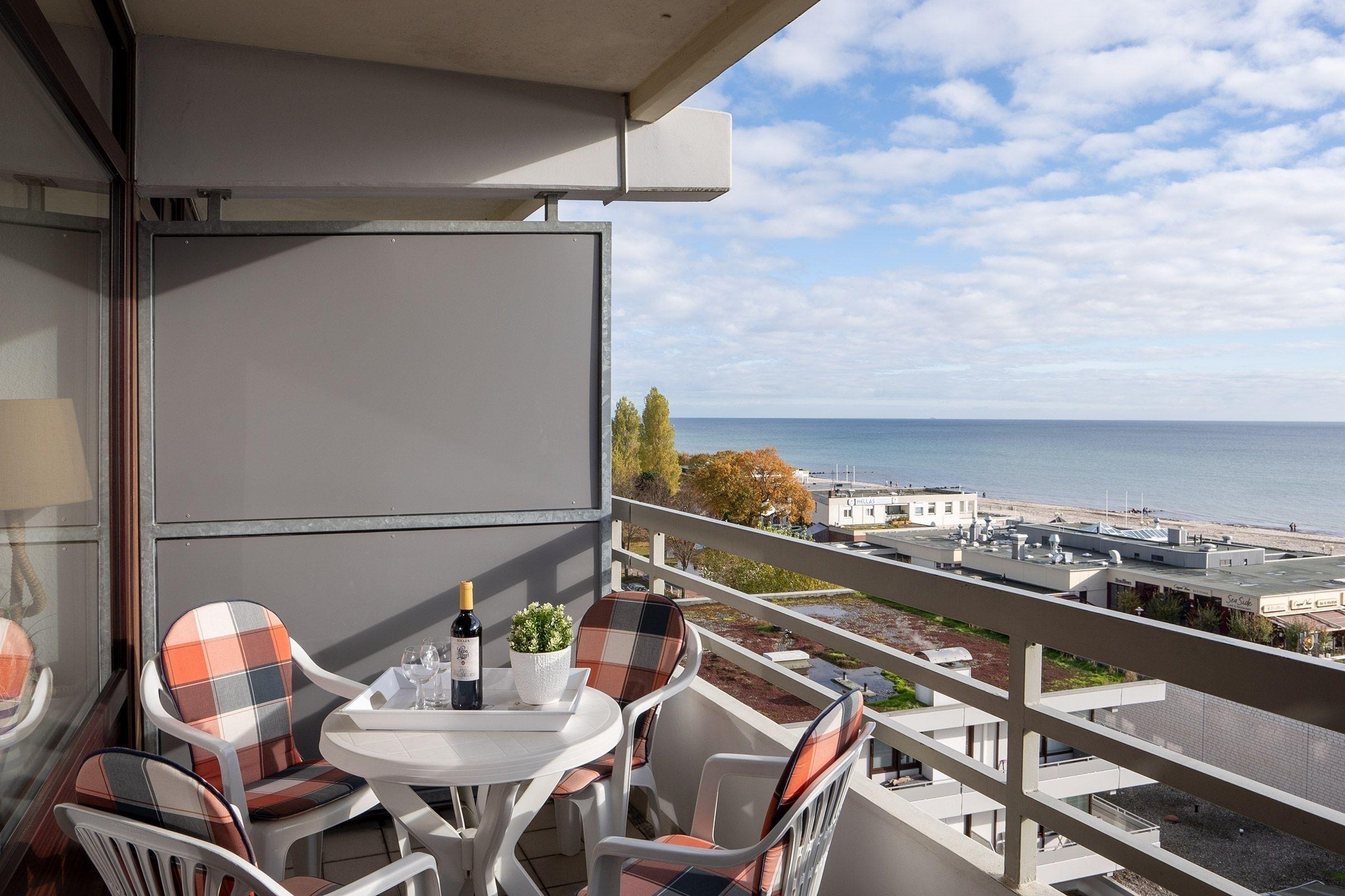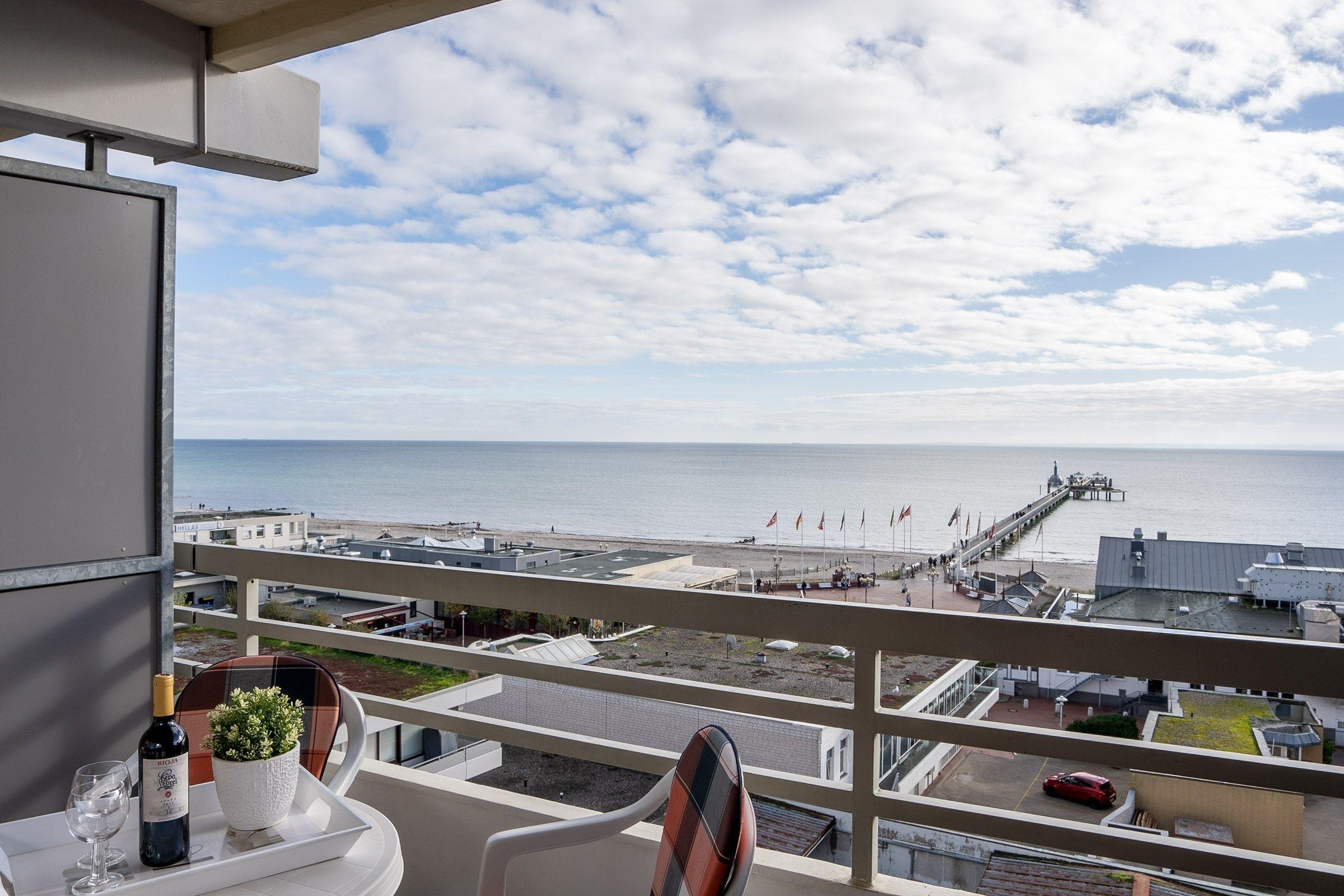 Zur Wohnung gehört ein großer möblierter Balkon, von dem man einen tollen Blick auf die Ostsee und zur Seebrücke hat.