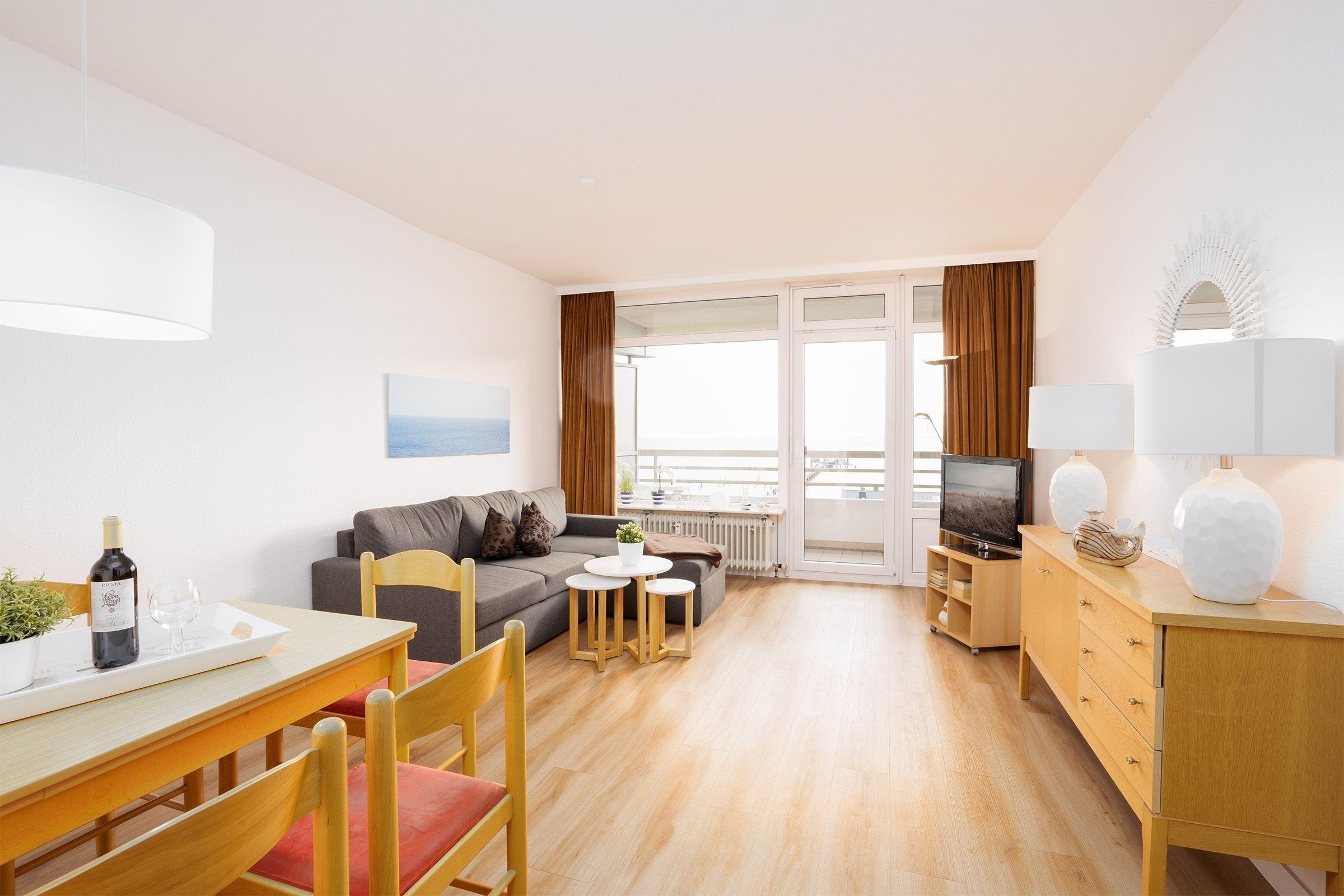 Moderne Ferienwohnung mit Balkon und Ostseeblick im Grömitz Center, strandnah und komfortabel ausgestattet.