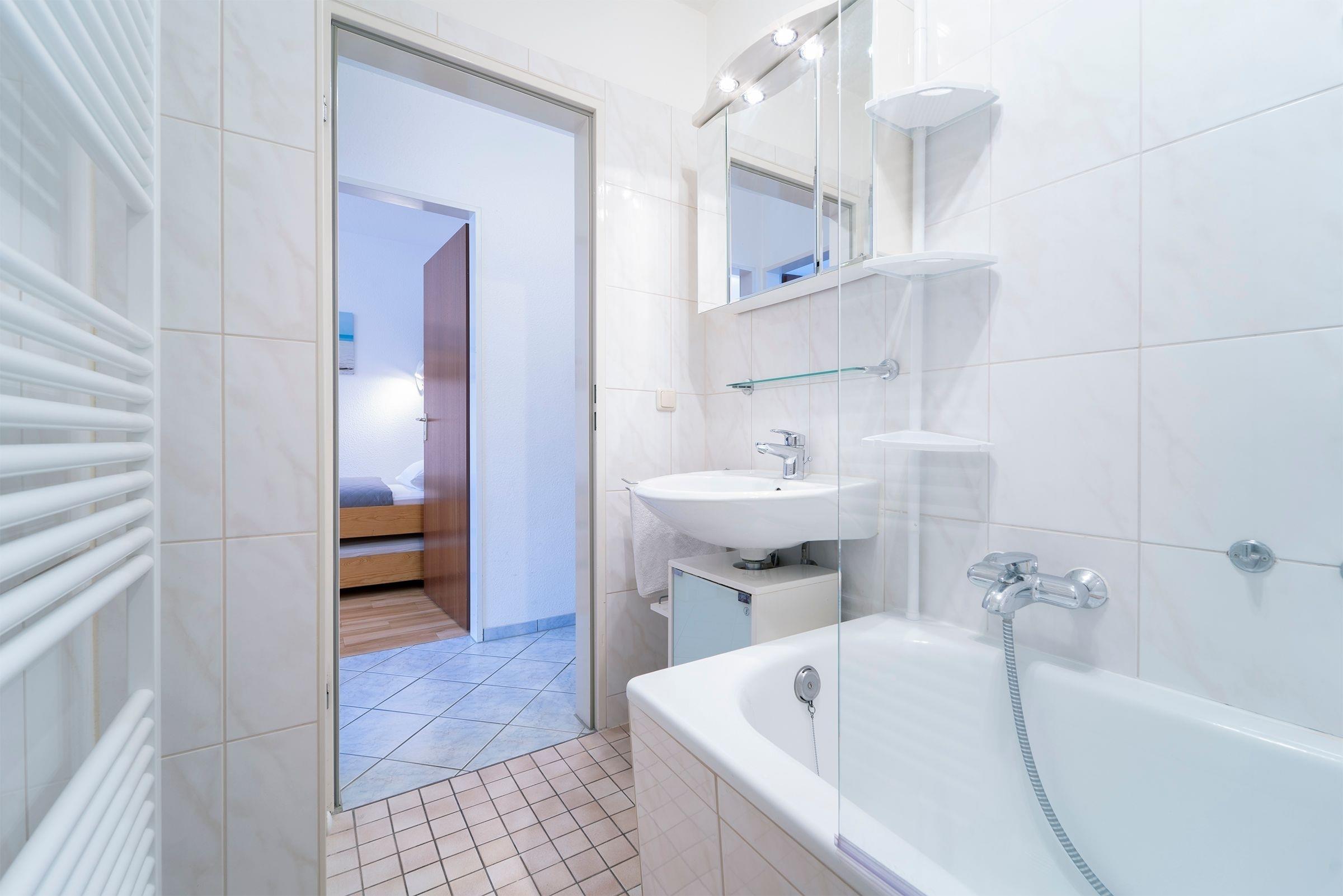 Das großzügige Wohnzimmer mit Flat-TV und Blu-Ray-Player sowie direkt angrenzendem Balkon liegt ruhig an einem Fußweg. In der voll ausgestatteten Küche finden Sie alles, was Sie für die Zubereitung von Mahlzeiten benötigen. Für die Nachtruhe stehen Ihnen ein Schlafzimmer mit Doppelbett (2x 90x200 cm) sowie ein Schlafzimmer mit Einzelbett, unter dem Sie noch ein weiteres Bett ausziehen können (je 90x200 cm) zur Verfügung. Die geschmackvolle Einrichtung der Wohnung lässt keine Wünsche offen.