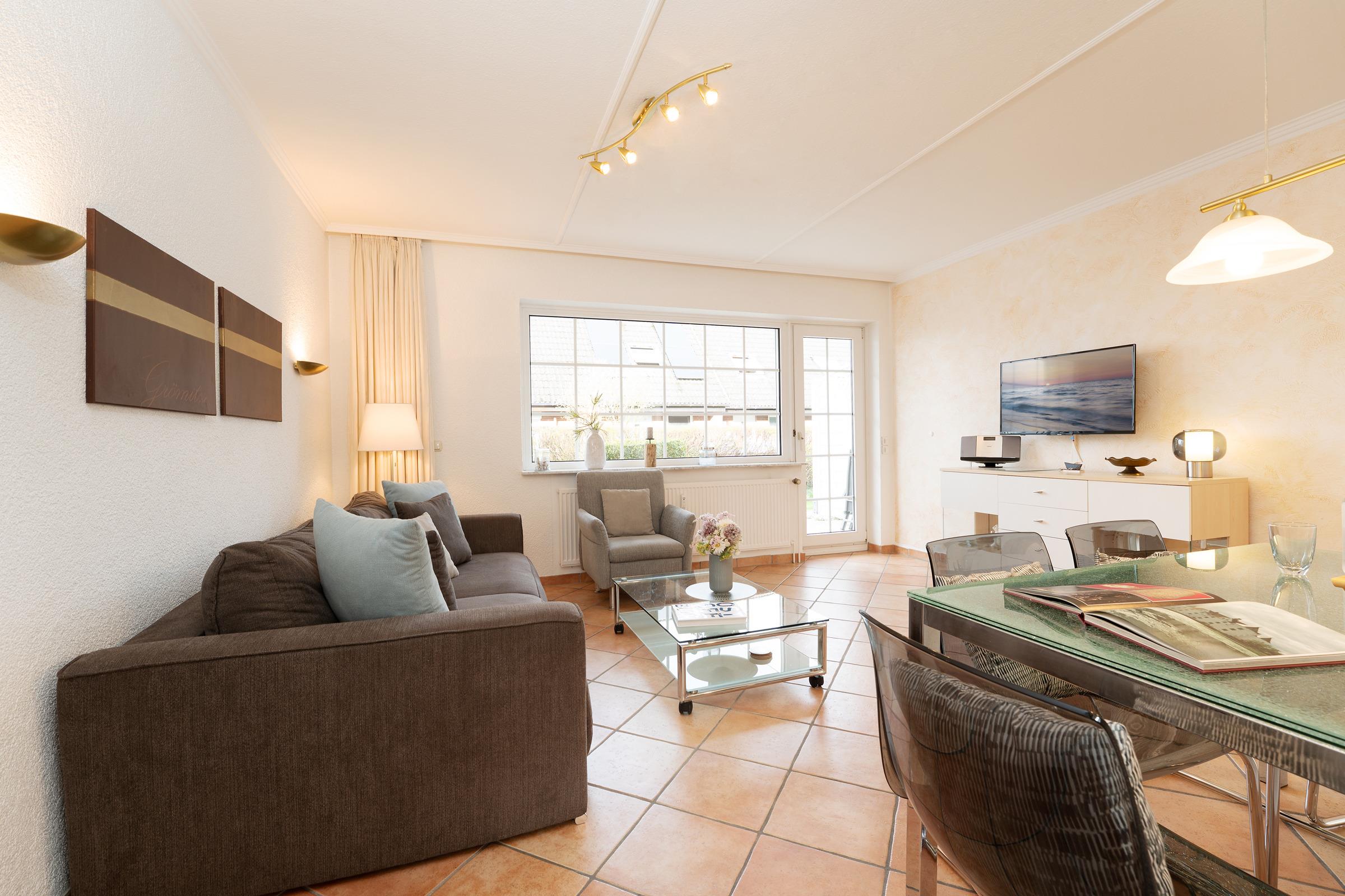 Hier bieten wir Ihnen Erholung pur auf ca. 38 m² Wohnfläche mit wunderschöner Terrasse. Im geschmackvollen Wohnbereich können Sie mit Ihrer Familie spannende Kinoabende verbringen, ein Flat-TV sorgt hier für Unterhaltung. Das große Sofa (2x 80x200 cm) kann zur Nacht in ein gemütliches Bett verwandelt werden. Am Esstisch haben Sie ausreichend Platz, um zu spielen oder gemeinsam zu essen. Ein kostenloser WLAN-Anschluss ermöglicht es Ihnen, Urlaubsfotos nach Hause zu schicken. Von hier aus gelangen Sie auch auf die schöne, möblierte Terrasse mit kleinem Garten (nicht komplett eingezäunt), auf der Sie bei einem Glas Wein erholsame Stunden verbringen können. In der separaten Küche mit 2 Platten-Ceranfeld, Mini-Backofen, Mikrowelle, Kühlschrank mit Gefrierfach und Spülmaschine wird es Ihnen auch im Urlaub Freude machen gemeinsam mit der Familie zu kochen. Im separaten Schlafzimmer mit Schiebetürenschrank lädt ein Doppelbett (2x 80x200 cm) zum Träumen ein. Das Tageslichtduschbad mit viel Stauraum rundet die Ausstattung dieser Ferienwohnung ab.