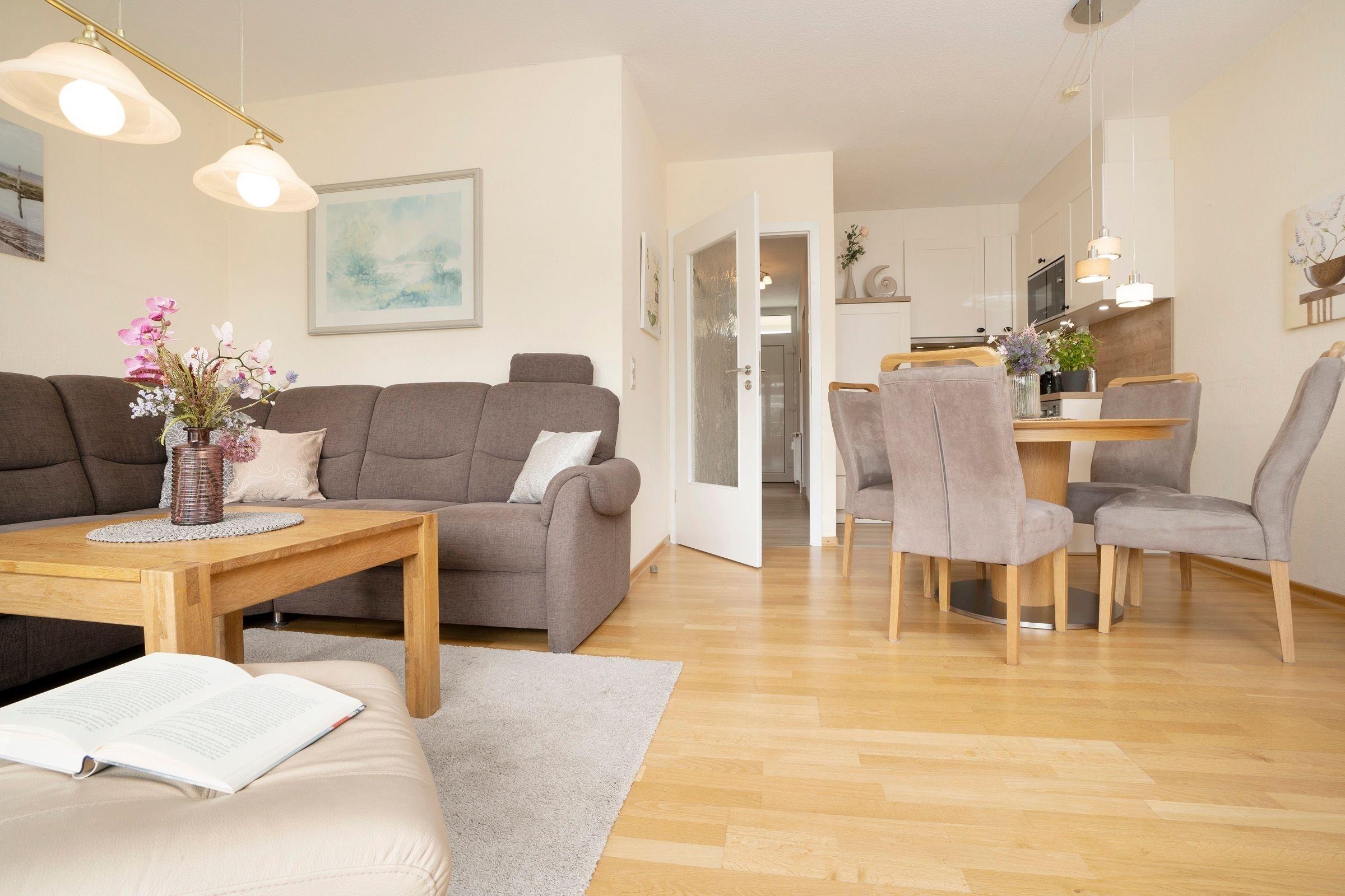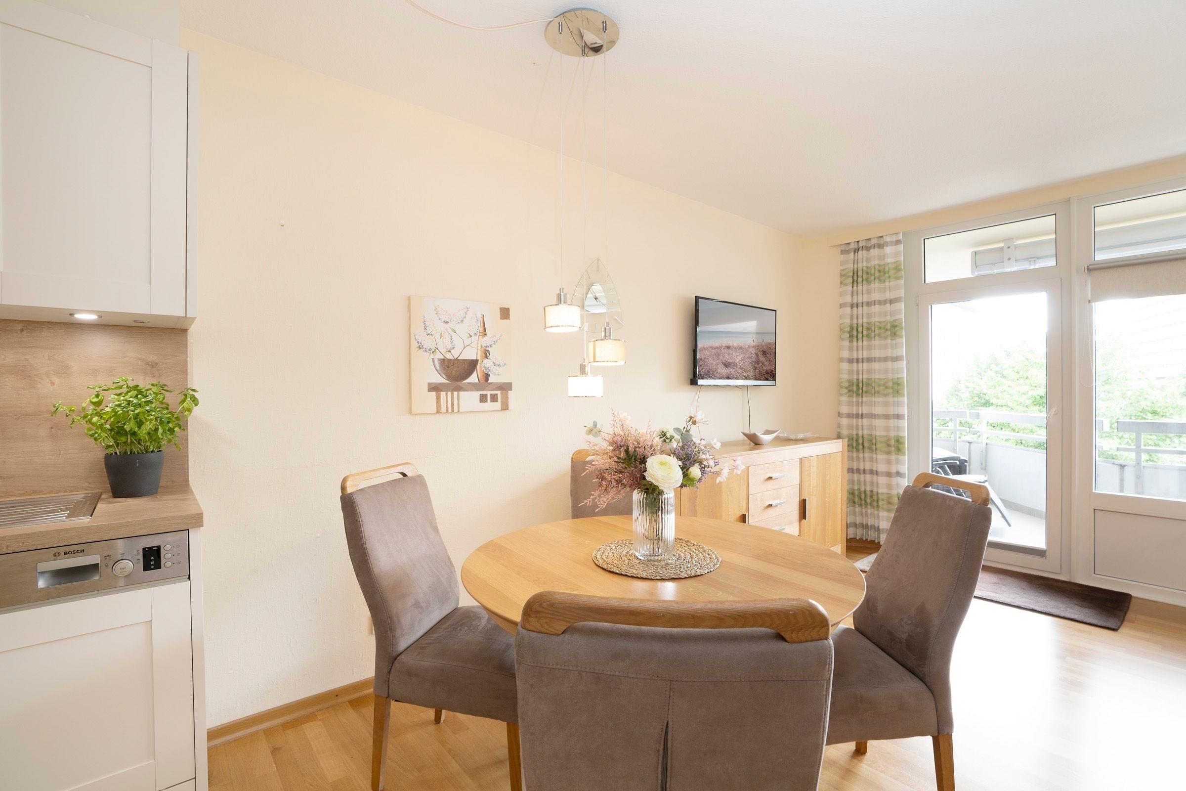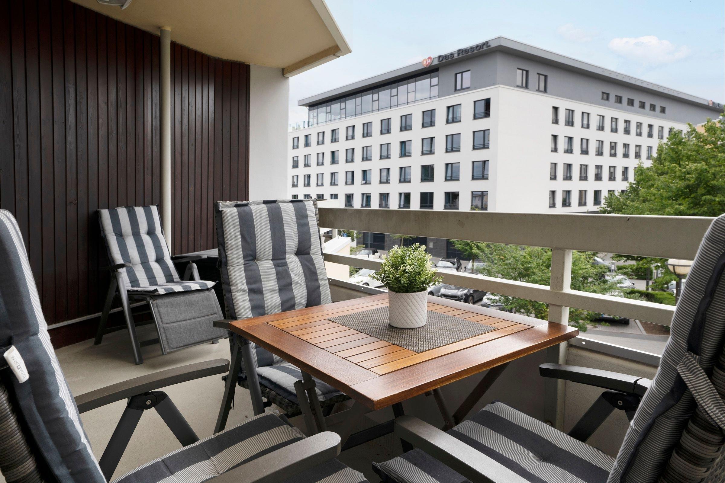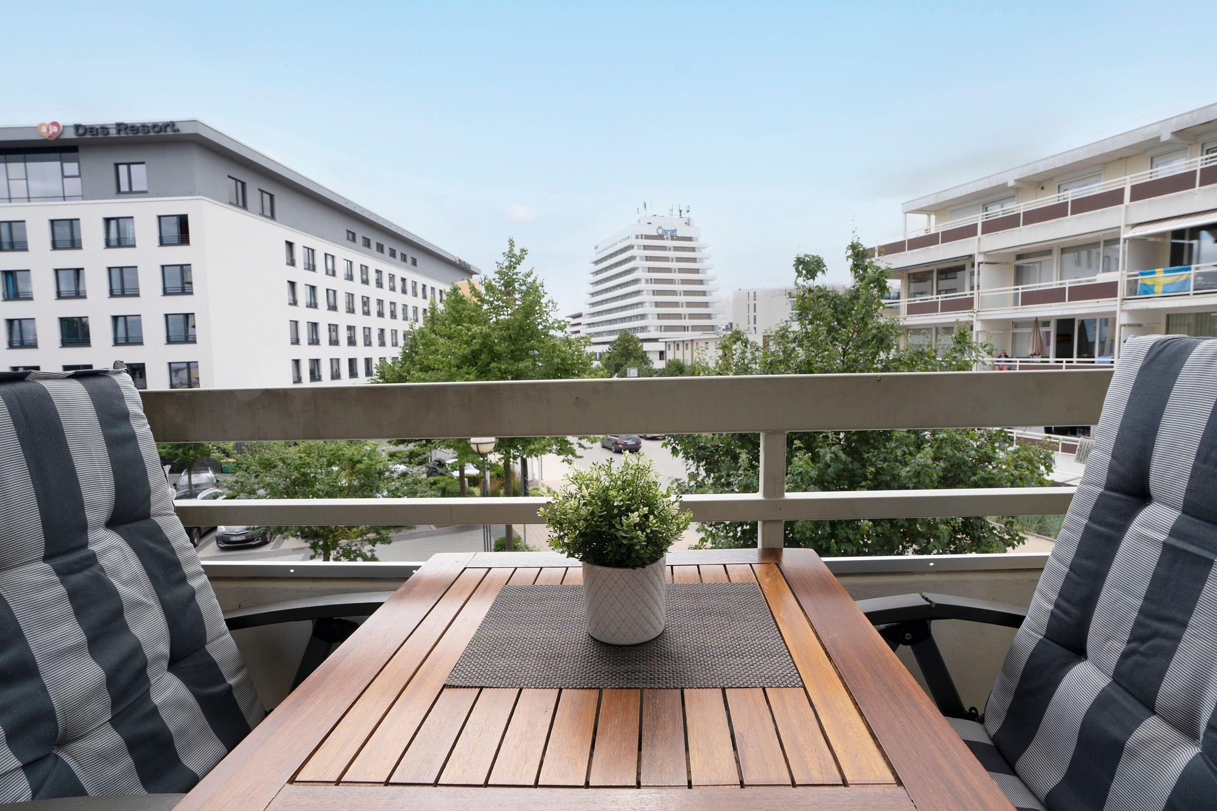 Moderne Ferienwohnung mit Balkon und Meerblick im Grömitz Center, nur wenige Schritte vom Strand entfernt.