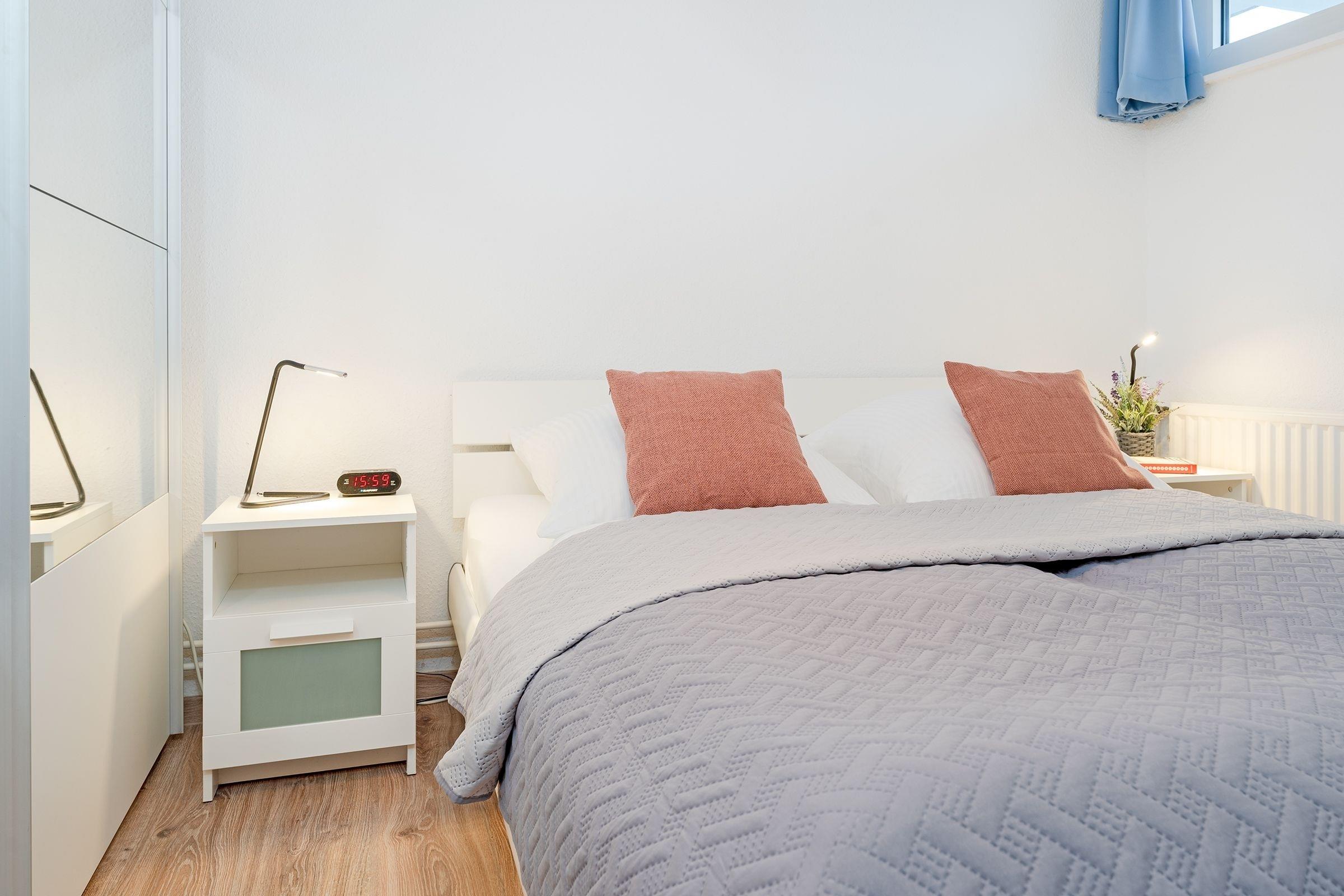 Schlafzimmer: 1 Doppelbett (2x 80x200 cm), Kleiderschrank, Verdunkelung: Gardinen