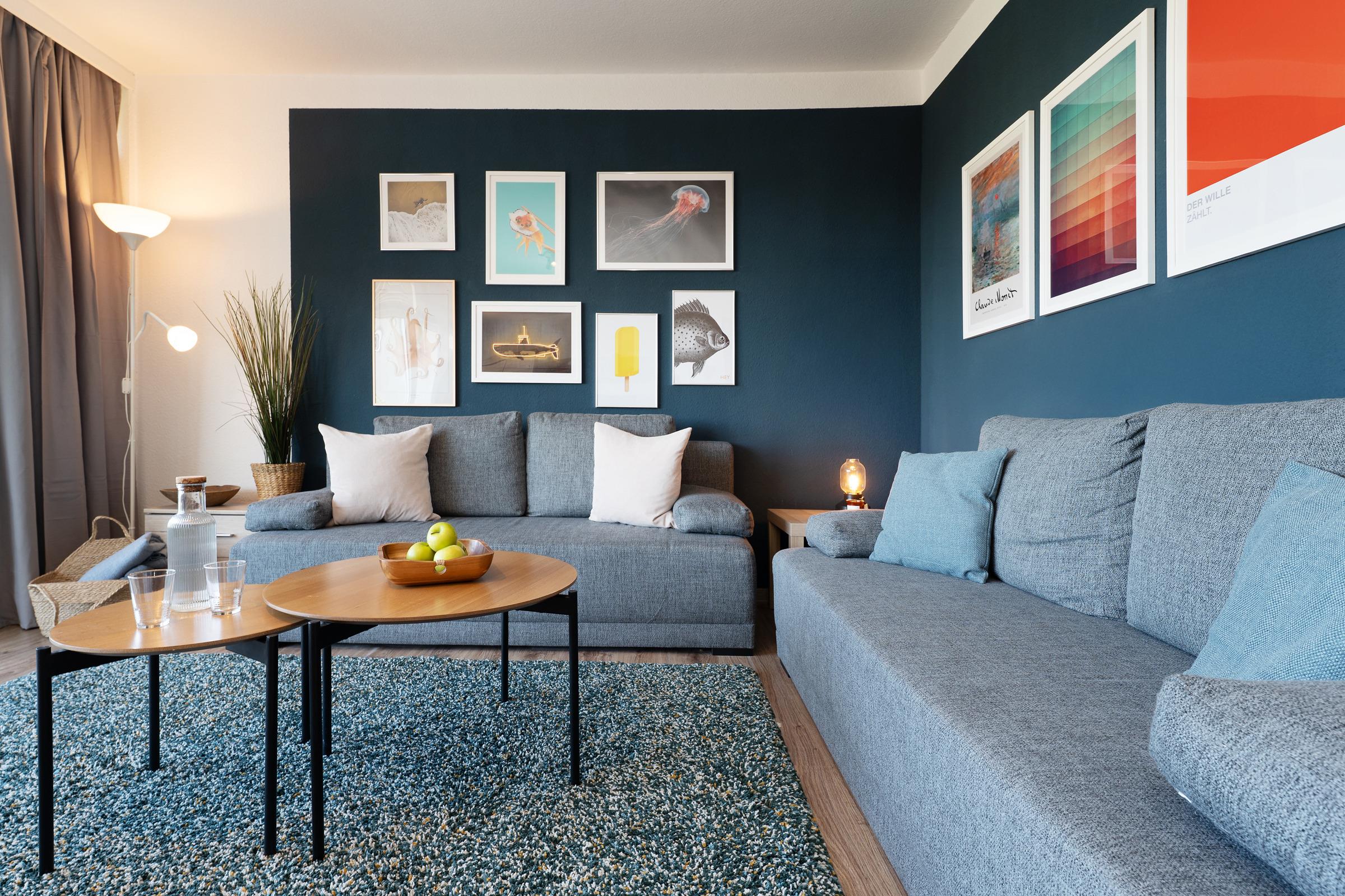 Ostsee pur! Diese wunderschöne Ferienwohnung liegt nur rund 50 Meter vom Strand entfernt und begrüßt Sie in einem meeresblauen Gewandt und mit einer liebevoll ausgesuchten Einrichtung. Auf der kuscheligen Sofalandschaft können Sie es sich gemütlich machen - genauso auf dem möblierten Balkon mit Südwestlage. Die kleine separate Küche ist mit Induktionsherd, Geschirrspüler, Heißluftfriteuse, Kaffee- & Nespressomaschine funktional ausgestattet und ermöglicht eine gute Selbstversorgung. Nach einem tollen Tag an der Ostsee können Sie für die Nacht die Schlafcouch im Wohnzimmer in ein Doppelbett (ca. 145x200 cm) umwandeln oder sie nutzen das Doppelbett (2x 80x200 cm) im Schlafzimmer. Im modernen Duschbad können sie sich nach einem ausgiebigen Strandtag in die vorgewärmten Handtücher einkuscheln.