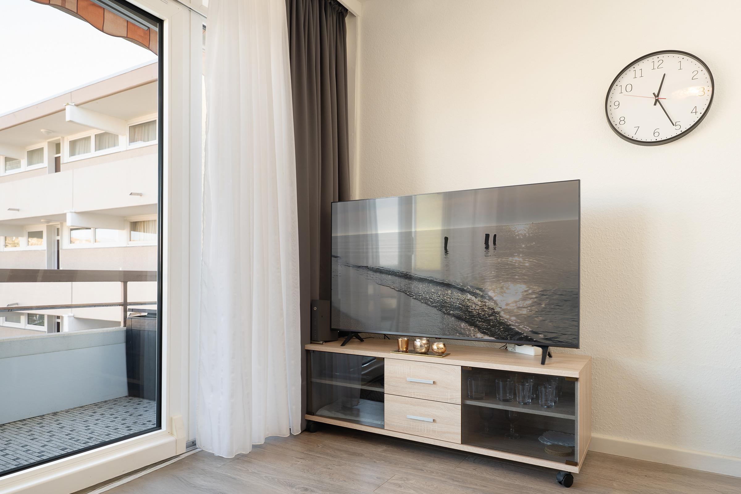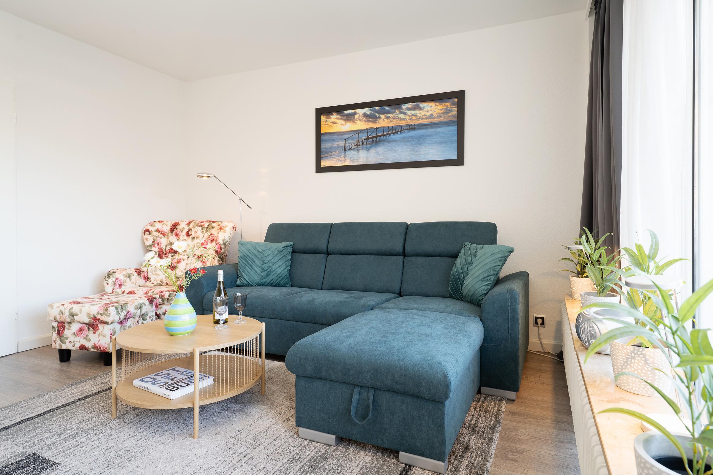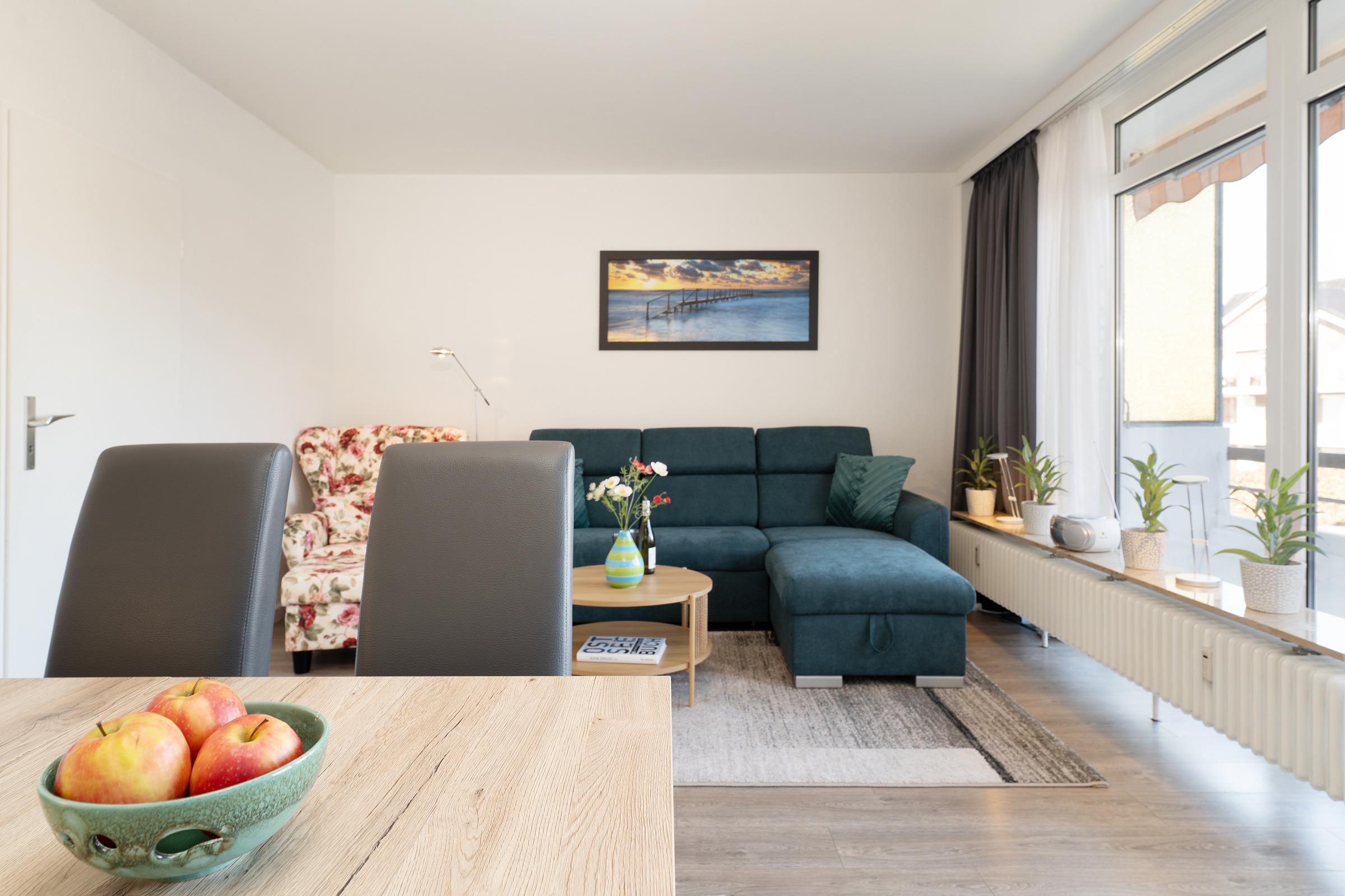 Vom kombinierten Wohn- und Essbereich haben Sie Zugang auf Ihren großen Balkon. Ein separates Schlafzimmer mit Doppelbett (2x 90x200 cm) und eine Schlafcouch (140x190 cm) im Wohnbereich, eine separate Küche und ein WC mit Dusche - Hier haben Sie mit bis zu 4 Personen reichlich Platz. Der WLAN-Anschluss sowie 2 Fahrräder sind inklusive.