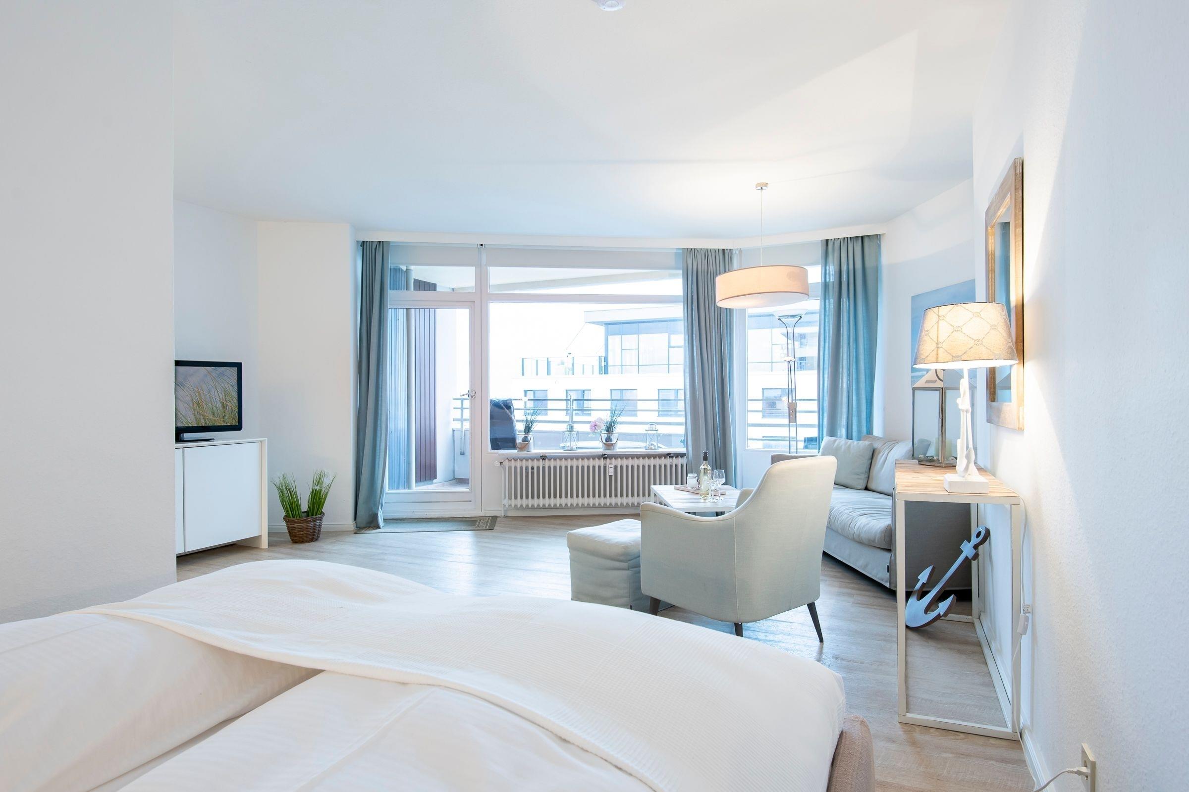 Zur Wohnung gehört ein großer Balkon, von dem man einen tollen Blick auf die Ostsee hat. Im Wohnzimmer erwartet Sie ein Fernseher und ein Radio und ein kostenloser WLAN Anschluss um immer Up to Date zu sein.