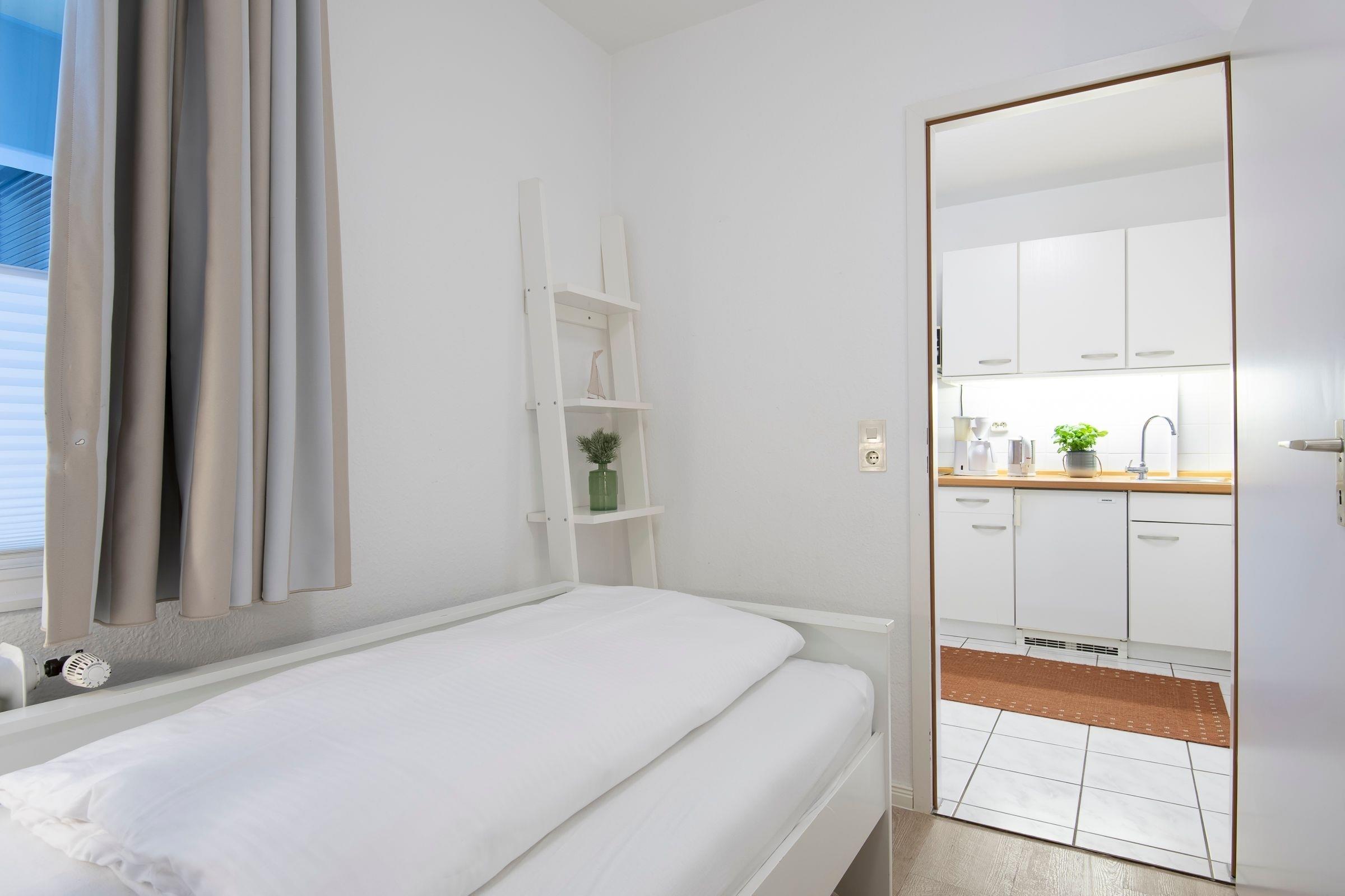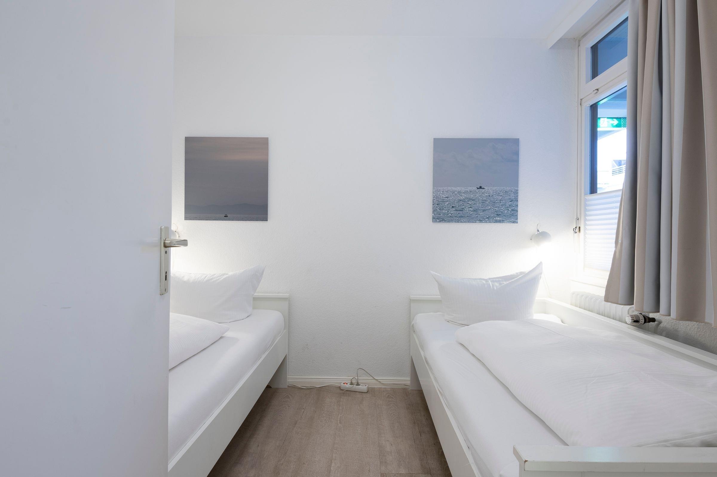 Schlafzimmer: 2 Einzelbetten (je 90x200 cm), Verdunkelung: Plissee und Vorhang