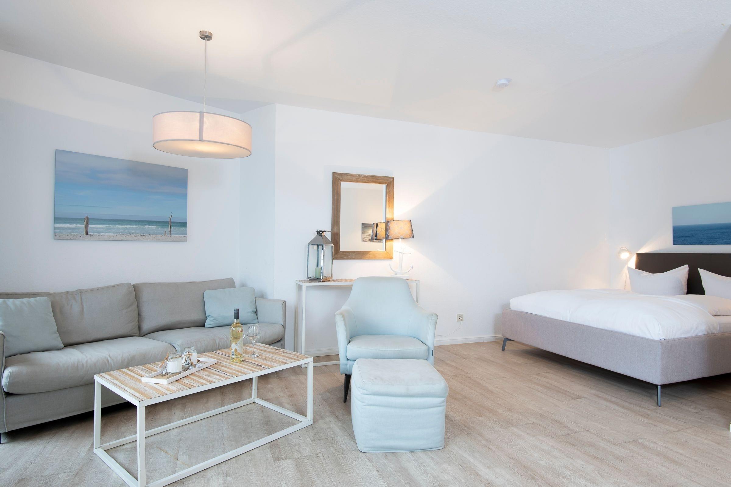 Eine sehr schöne Ferienwohnung mit einer hübschen modernen Einrichtung , in der wir uns wohl gefühlt haben ! Der seitliche Meerblick ist wunderschön und man ist nach ein paar Metern an der Promenade ! Die Matratzen im WZ sind meiner Meinung nach , ?viel zu weich? , aber dies ist wohl Ansichtssache ! Info : SZ rechtes Licht defekt ! Evtl. Messbecher mit zum Kücheninventar hinzufügen ! ?????? Las vorweg natürlich die Beurteilungen und wunderte mich stark , dass Vorort NICHTS verbessert wurde , was massiv mehrfach beanstandet wurde !????? 1. Sessellehnen eklig schmutzig ( haben wir nicht benutzt ) 2. Linkes Bett im SZ knatscht schrecklich ( mussten wir leider benutzen , war aber eine Qual , da verminderte Schlafqualität ) Wenn diese Dinge beseitigt werden , steht dem super Wohlfühlen nichts mehr im Wege und ich komme herzlich gerne wieder und empfehle es auch ! PS : Lese weiterhin die Beurteilungen um es zu verfolgen !